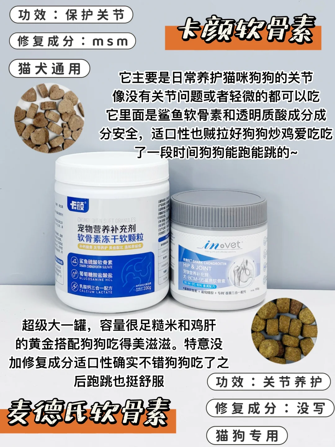但市面上宠物软骨素琳琅满目,实在是难以下手,与其跟风买不适合自己家宠物的,还是老老实实的做功课再入手宠物软骨素吧!