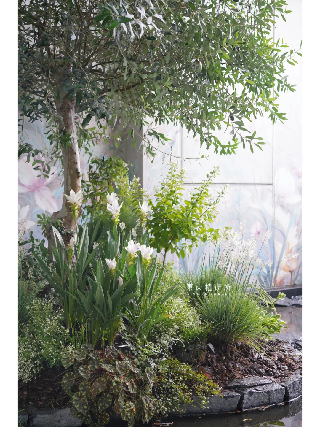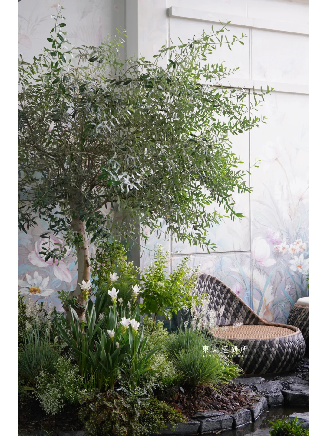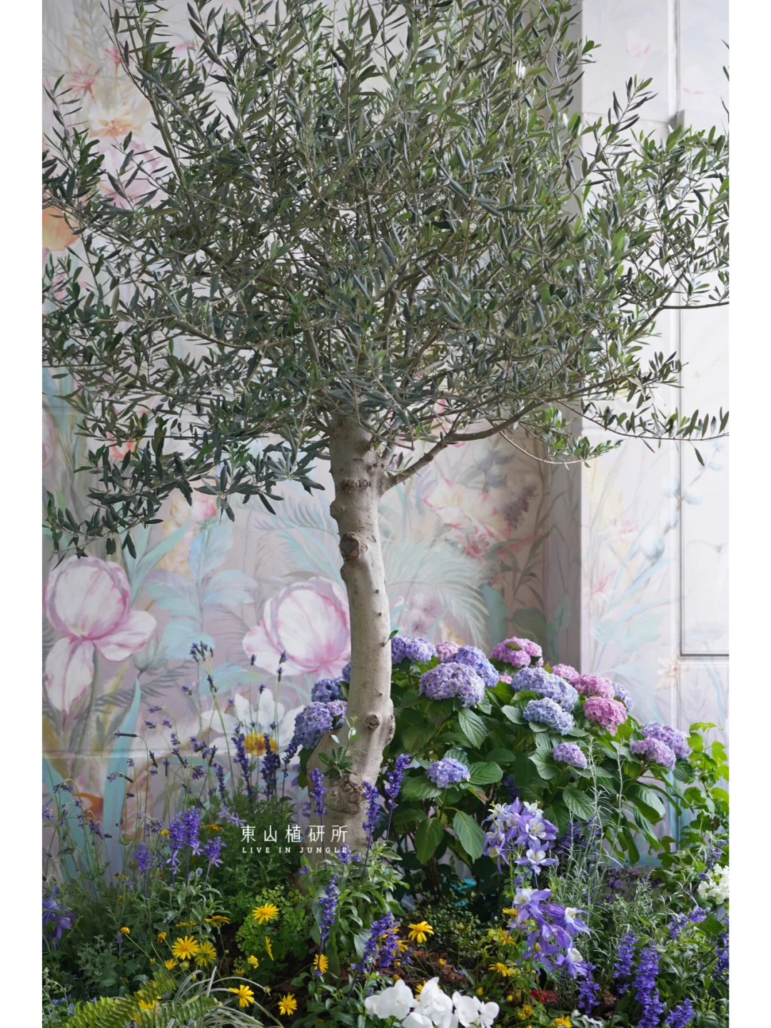 私宅阳台花园设计 春日的橄榄树下繁花似锦 各种可爱的时花争相开放 夏至时节橄榄叶间透出清爽 花境简约而雅致 姜荷花带来的清爽凉意在此蔓延 橄榄树见证着四季轮回 花开花落,各有千秋 —————
