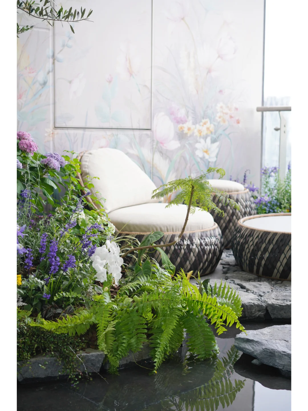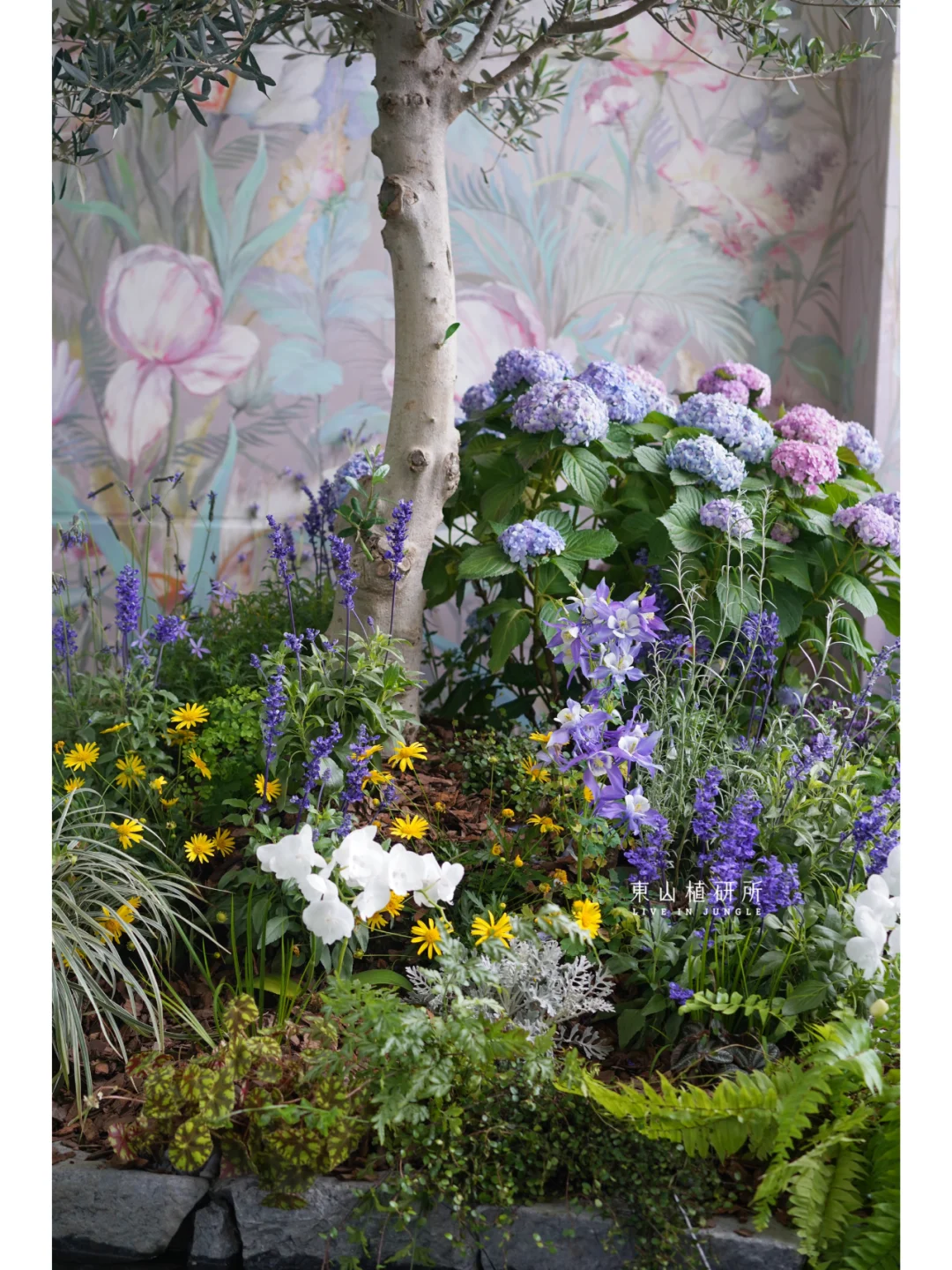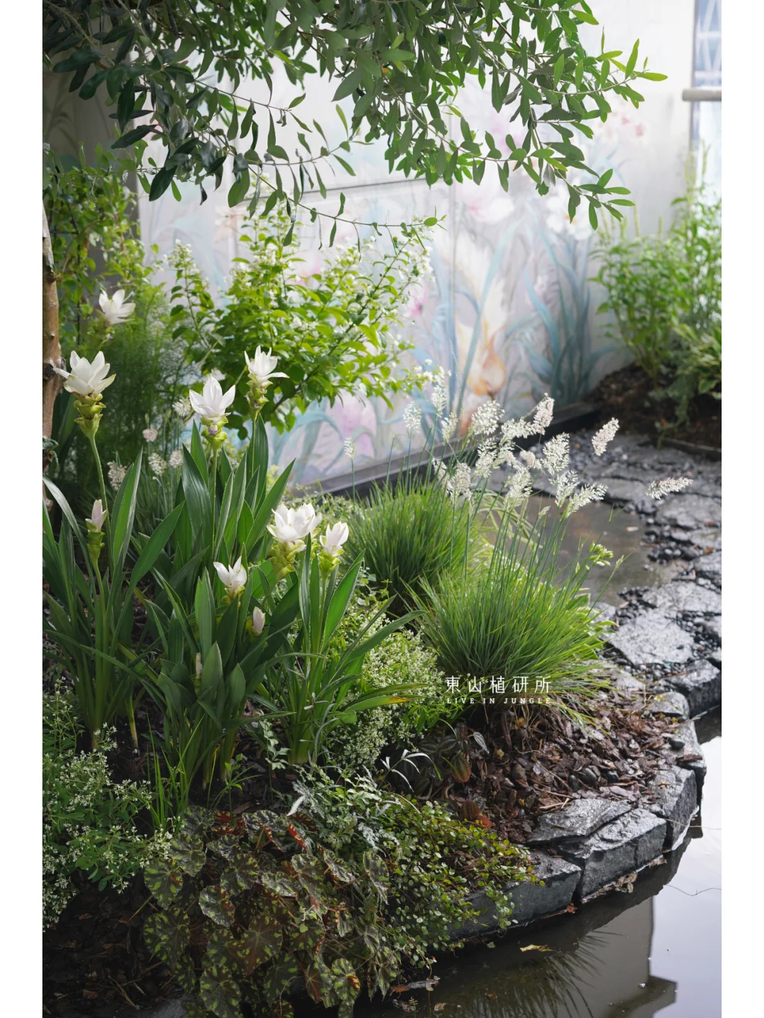 私宅阳台花园设计 春日的橄榄树下繁花似锦 各种可爱的时花争相开放 夏至时节橄榄叶间透出清爽 花境简约而雅致 姜荷花带来的清爽凉意在此蔓延 橄榄树见证着四季轮回 花开花落,各有千秋 —————