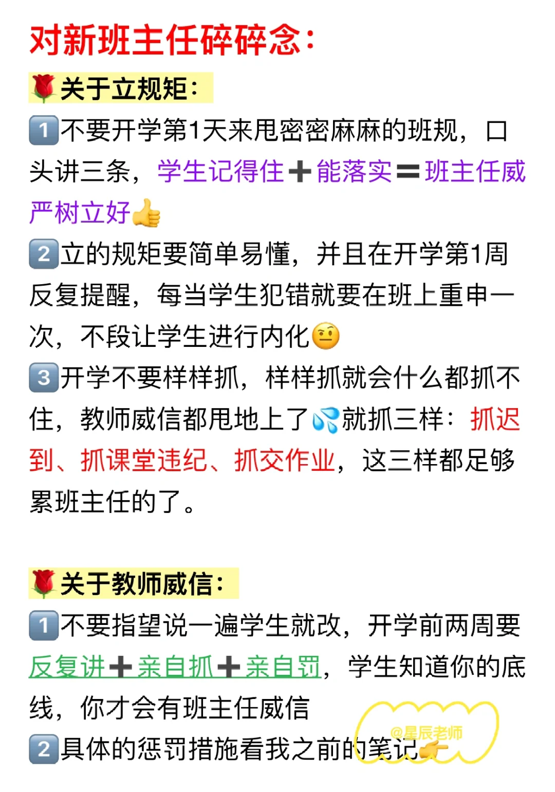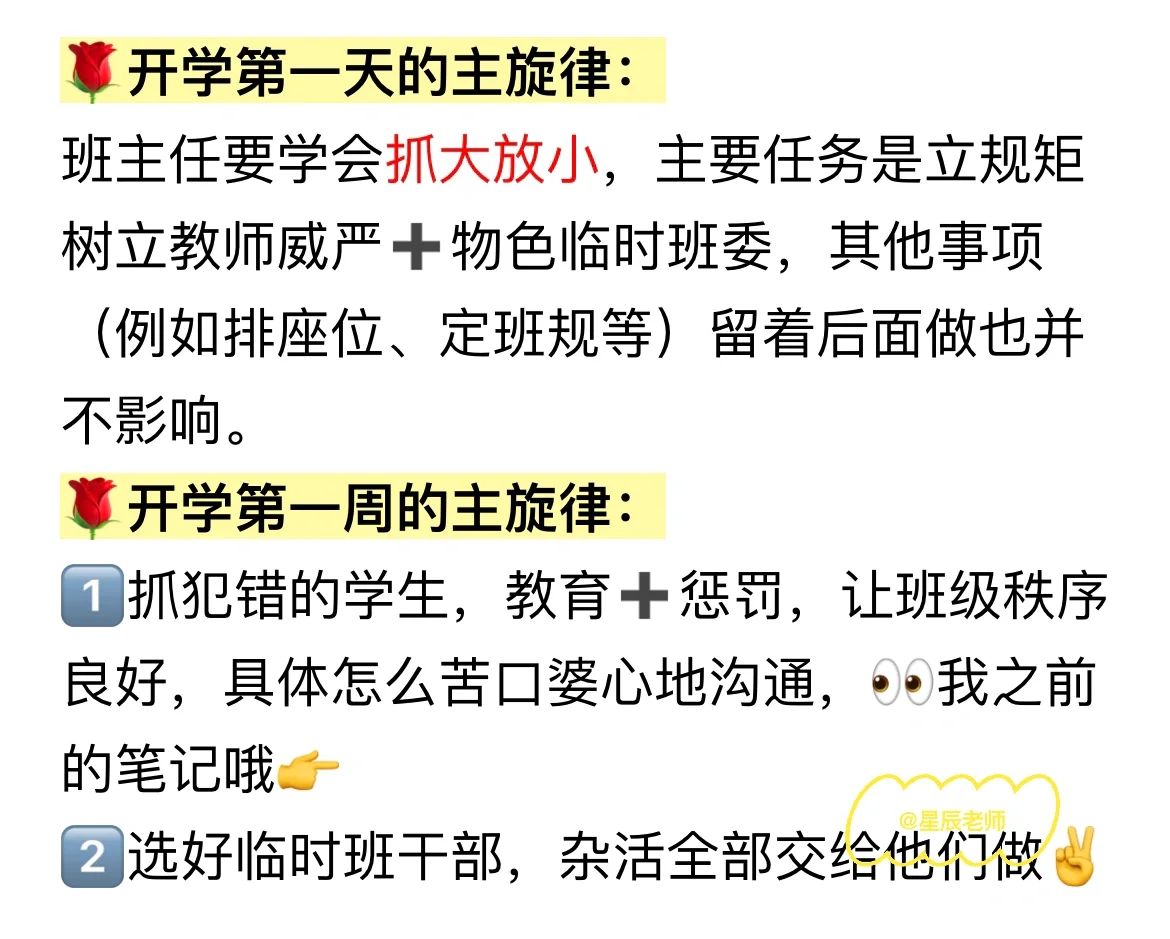 班主任如何在开学第1⃣️天立好规矩,稳稳拿捏住学生?今天给大家介绍我的逐字稿😊 1⃣️ 开场白(声音洪亮一点,可以自然微笑😊) 2⃣️ 自我介绍(展示自己的闪光点,让学生哇塞👏) 3⃣️介绍科任老师(通过老师团队的介绍,让学生获得自豪感,尊重老师🙏) 4⃣️ 立规矩(不要微笑,全程语气坚定,眼神犀利,不躲闪👀)⚠️规矩只有三点哦! 5⃣️总结(亮明底线,一视同仁❗️) 6⃣️期待(给信心🌟)