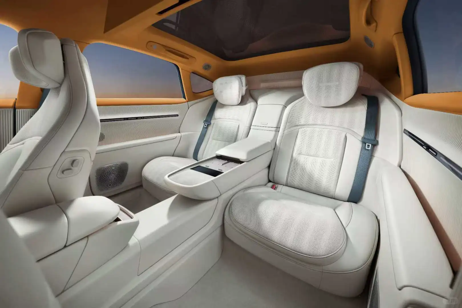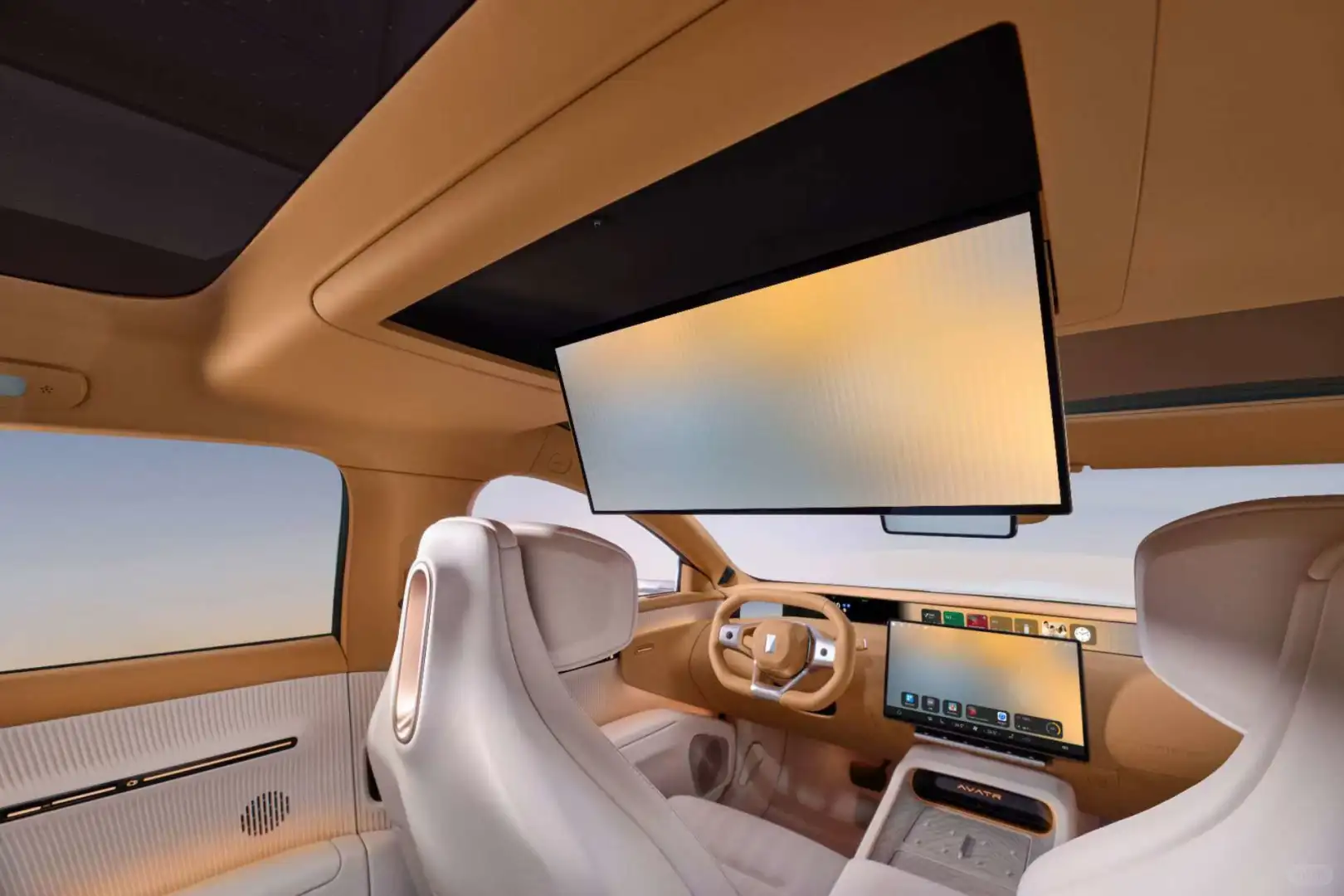 阿维塔012的后排也是前所未有的奢华。独立四座布局,后排配齐了通风、加热、按摩,可以实现四温区的自动温控调节。固定式扶手箱集成了双50W手机无线充和冷暖冰箱,抬头还能看到64色的灵感星辉天幕,以及16英寸的后舱悬浮天幕屏。这样的后排,估计阿维塔12的车主也会暗自羡慕吧。