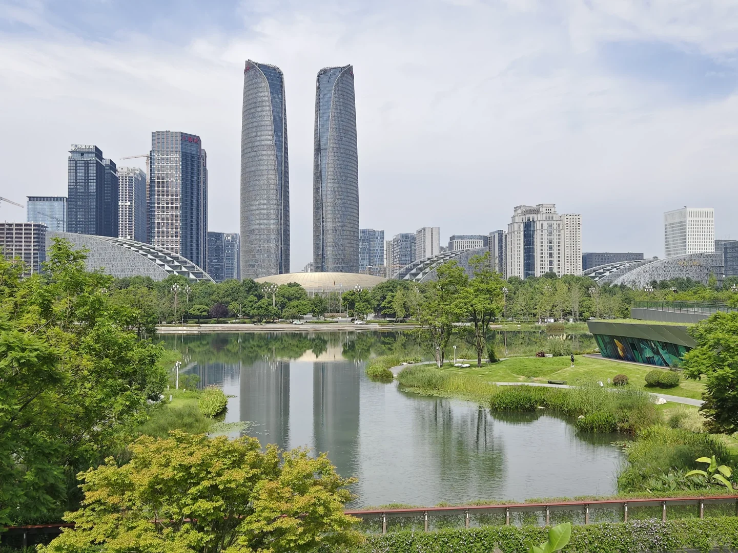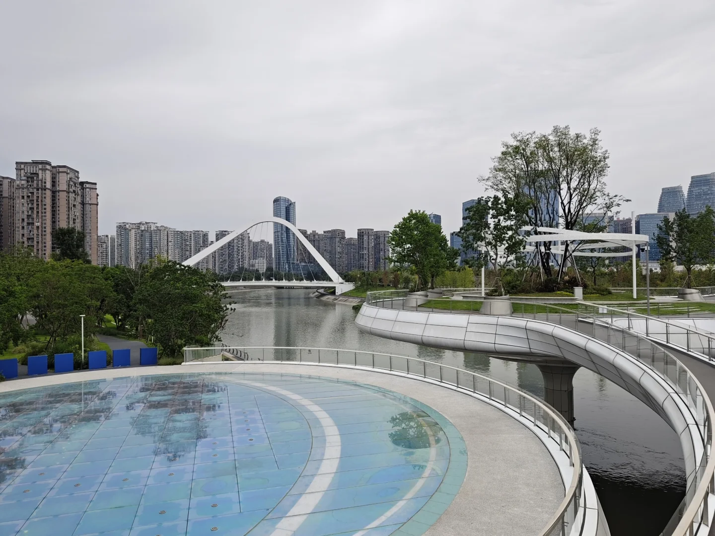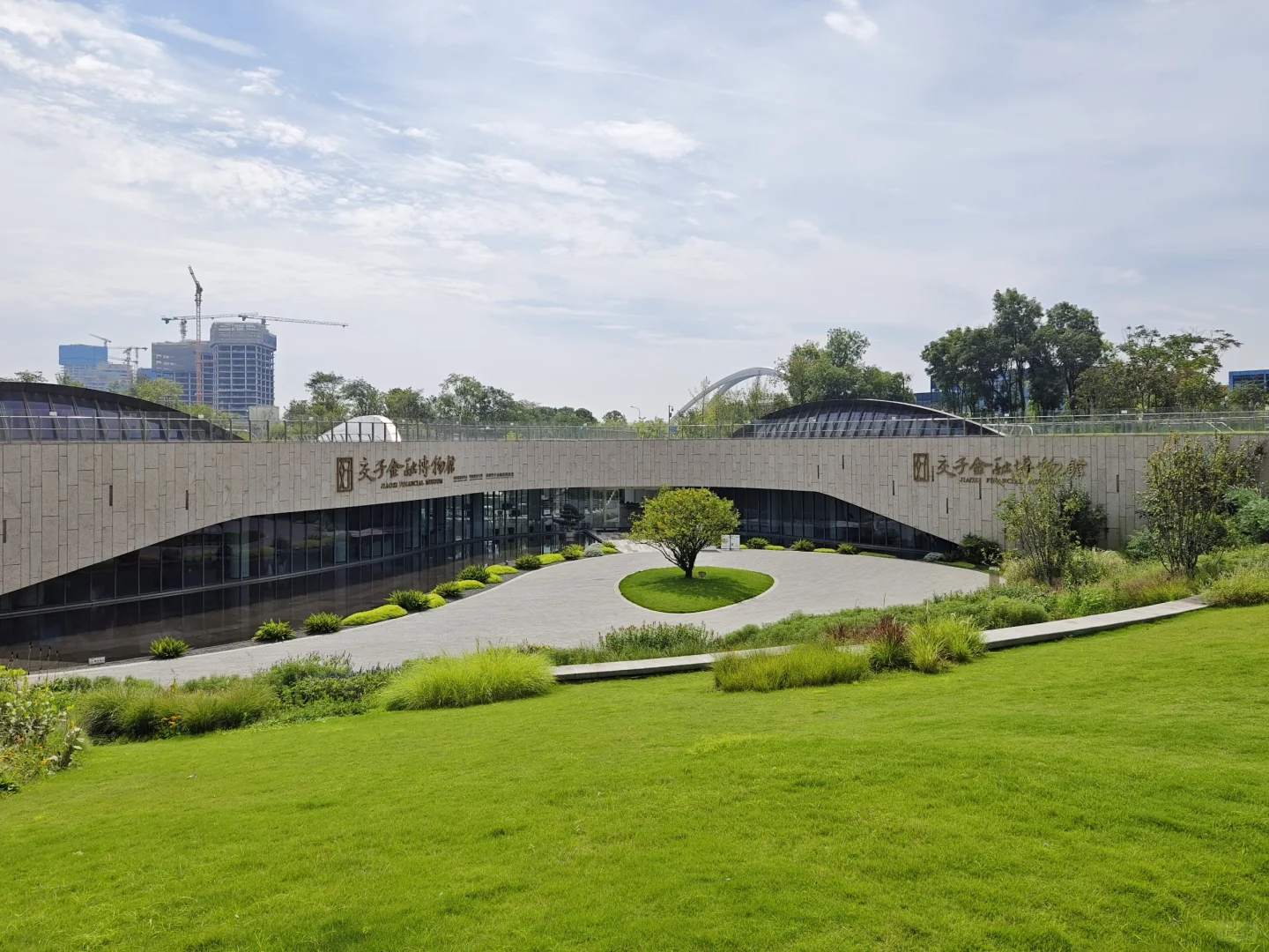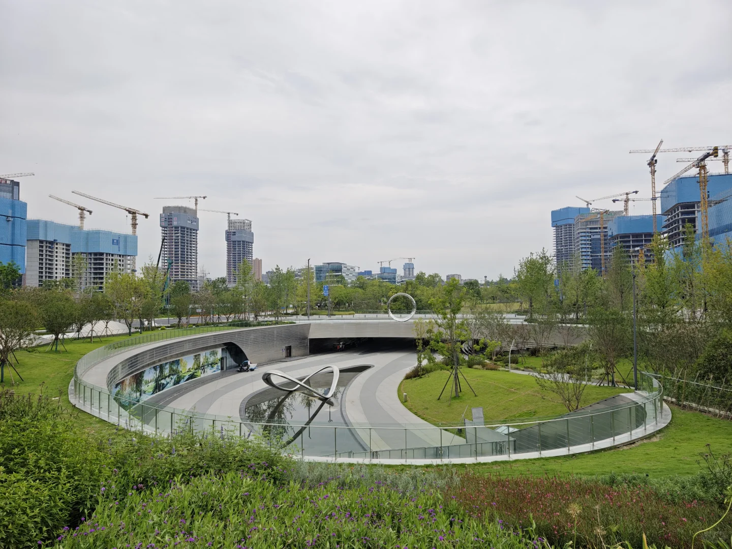 [得意R]成都交子公园,东西横亘2公里,垮越府河及8条街道,占8个地块及水上空间,周围全是高楼大厦,尺度相当大。 [太阳R]我就挑了这个炎热的大中午,人们都在楼里吹空调的时候,自虐般地逛完了整个公园,全程除了偶尔有保洁和保安,就没有见到室外两条腿沾地的人。 [自拍R]从西边的湖区开始,生态还不错,芦苇丛里有水鸟,几个观景台可以看双子塔。然后有些儿童游乐场地,沙坑之类的。公园里没有商业,补给不易,幸好中间有个交子金融博物馆,有卖饮料的,还可以吹空调,看看展览。再往东,跨过府河的桥上做了丰富的景观设施,圆形的吧台还空荡荡的。过了河,周围的建筑大都没有完工,公园就更没有人了。这里有个像山洞的休憩空间不错,不过里面用来坐的石头是假的,空心的,扣分。总之这个公园好不好玩还是很看天气,要凉快一些才好,周围找不到吃的,最后还是回到银泰解决。