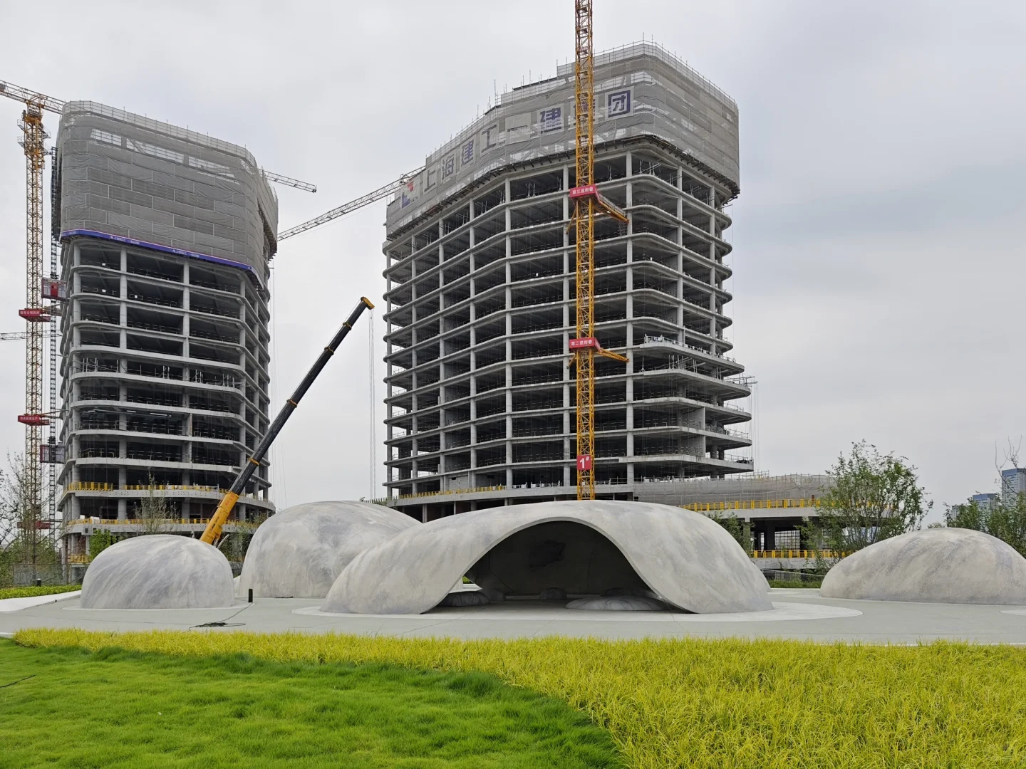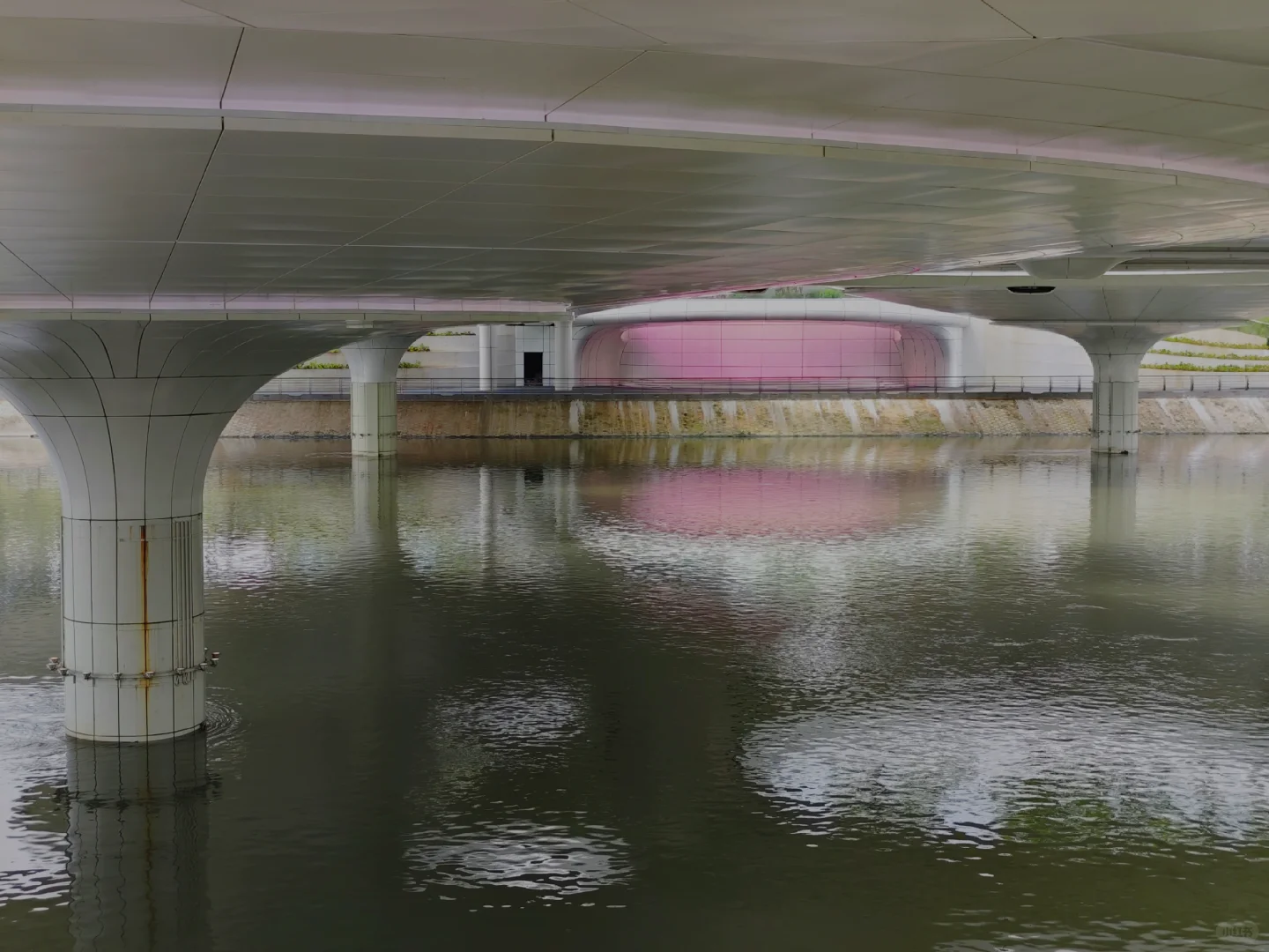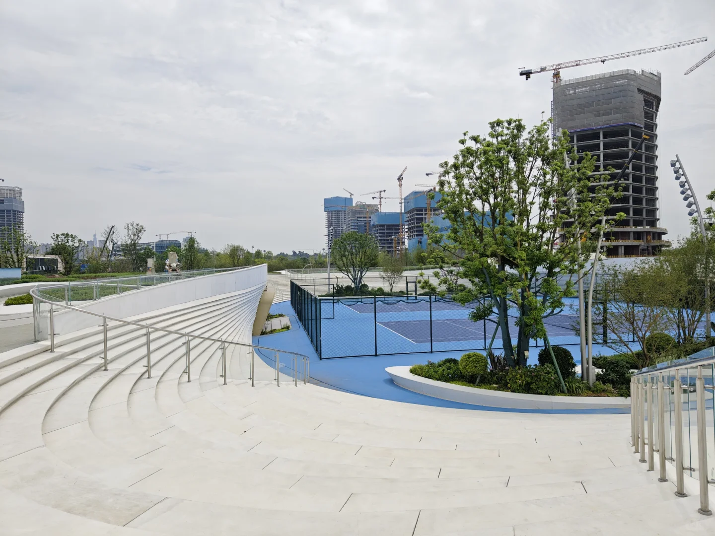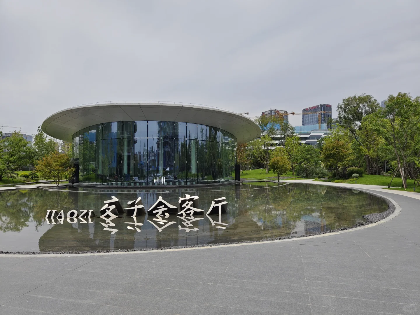 [得意R]成都交子公园,东西横亘2公里,垮越府河及8条街道,占8个地块及水上空间,周围全是高楼大厦,尺度相当大。 [太阳R]我就挑了这个炎热的大中午,人们都在楼里吹空调的时候,自虐般地逛完了整个公园,全程除了偶尔有保洁和保安,就没有见到室外两条腿沾地的人。 [自拍R]从西边的湖区开始,生态还不错,芦苇丛里有水鸟,几个观景台可以看双子塔。然后有些儿童游乐场地,沙坑之类的。公园里没有商业,补给不易,幸好中间有个交子金融博物馆,有卖饮料的,还可以吹空调,看看展览。再往东,跨过府河的桥上做了丰富的景观设施,圆形的吧台还空荡荡的。过了河,周围的建筑大都没有完工,公园就更没有人了。这里有个像山洞的休憩空间不错,不过里面用来坐的石头是假的,空心的,扣分。总之这个公园好不好玩还是很看天气,要凉快一些才好,周围找不到吃的,最后还是回到银泰解决。