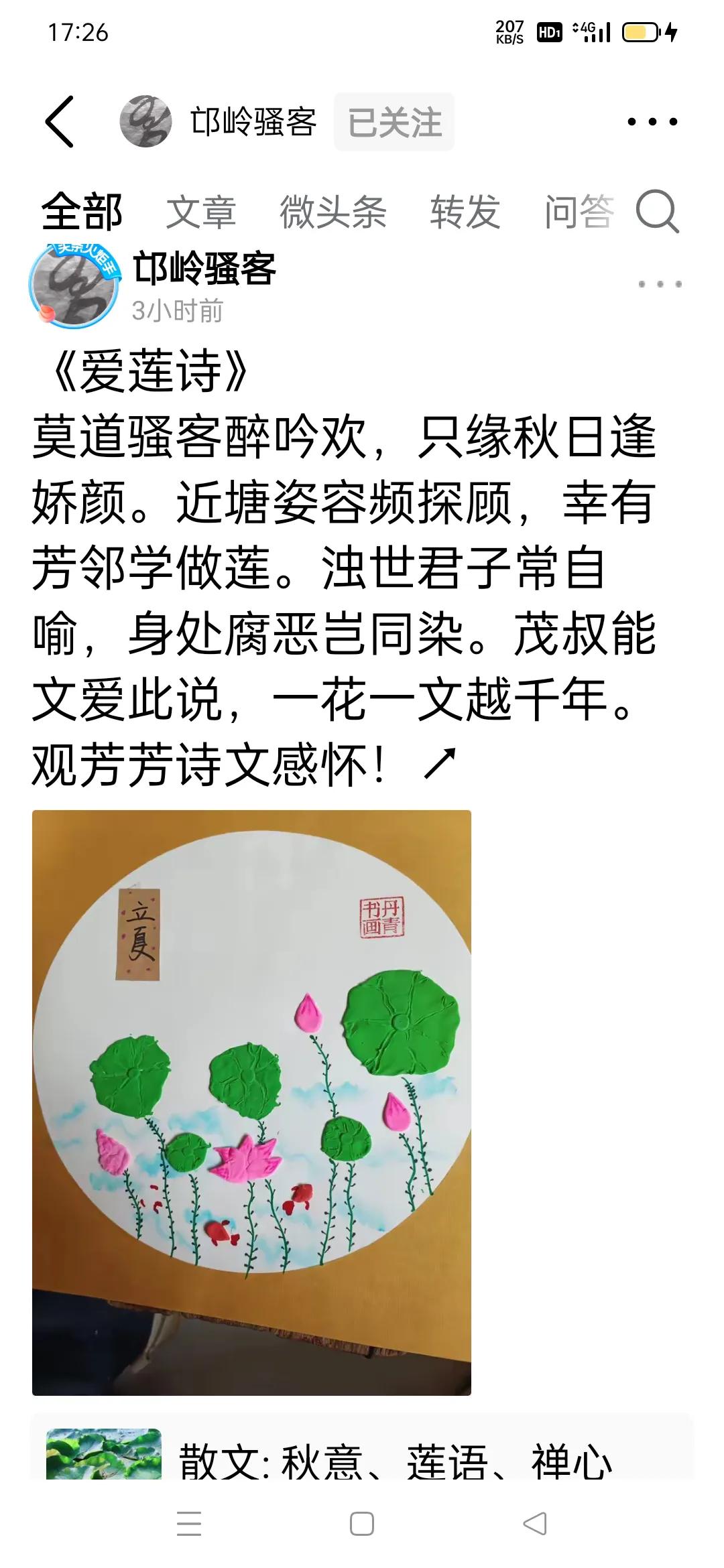 感谢@邙岭骚客 老师为作品《散文:秋意,莲语,禅心》赐予美诗《爱莲说》,感佩才情。拙和一首以表敬意!向老师学习[玫瑰][玫瑰][玫瑰][祈祷][祈祷][祈祷] [微风][微风][微风] 《爱莲说》 邙岭骚客 ↗ 莫道骚客醉吟欢, 只缘秋日逢娇颜。 近塘姿容频探顾, 幸有芳邻学做莲。 浊世君子常自喻, 身处腐恶岂同染。 茂叔能文爱此说, 一花一文越千年。 [微风][微风][微风] 《爱莲说》 芳芳 ↙ 自古红尘多过客, 禅心何惧付浊流。 月前轻挽浮萍笑, 镜里常对碧叶羞。 岸柳无骨随风去, 芰根有魂斗泥鳅。 桥边谁人正笙笛? 几度春风几度秋。 🌹🌺🌸🌷🍀 @邙岭骚客 @芳芳诗文 #芳芳诗文# #记录我的2024#