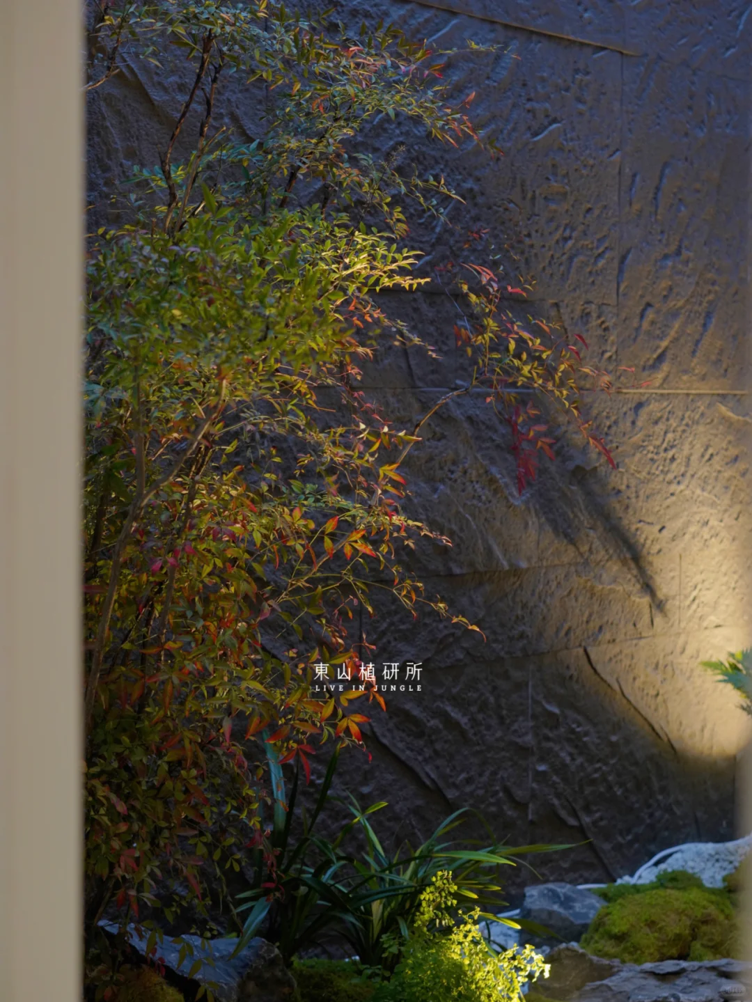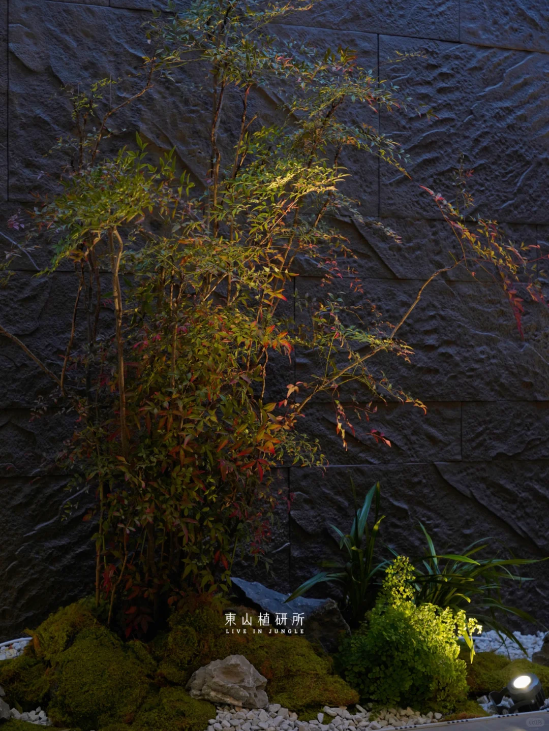 室外绿植造景 柔和的灯光映衬着南天竹婆娑的树影 夜色氛围下的植物景观 —————