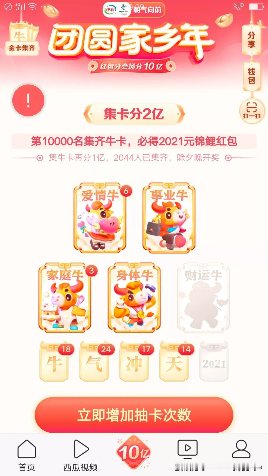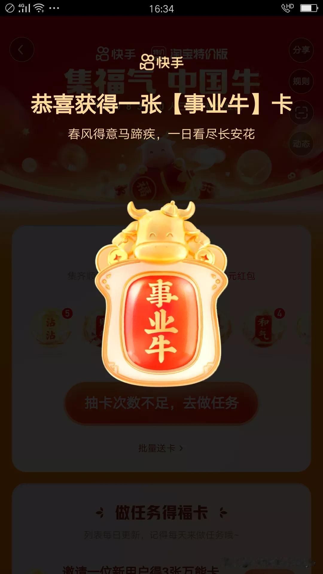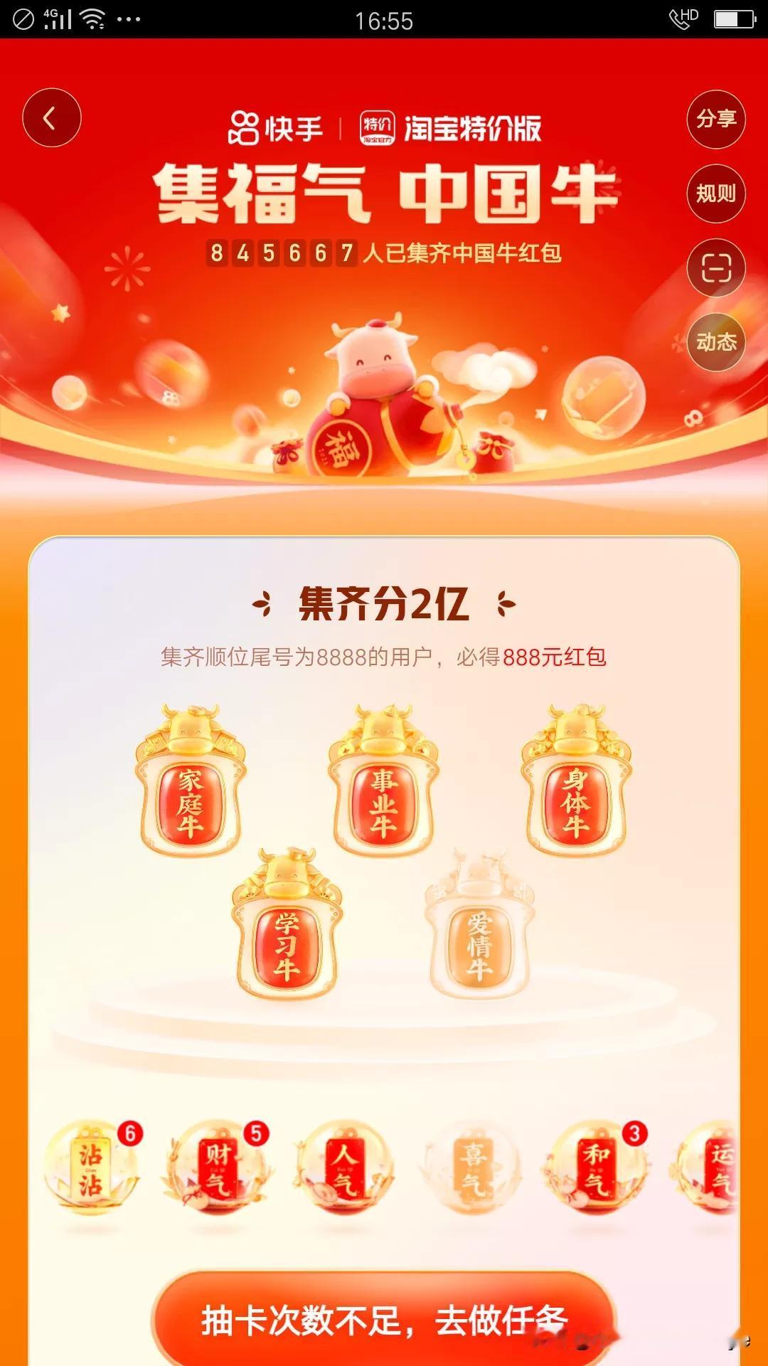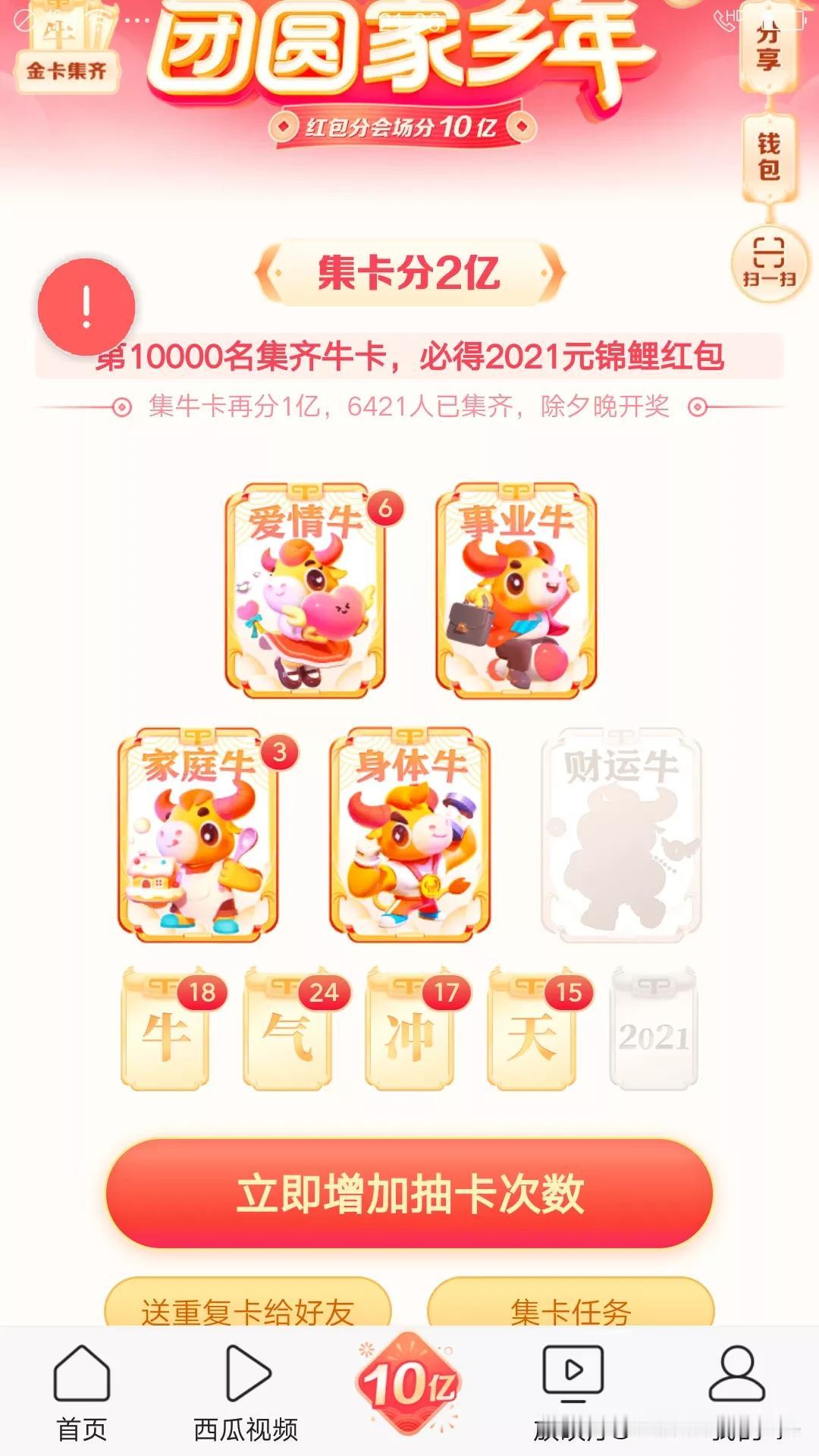2021集金卡,你合成了吗?好不容易合成一套金卡了,以为完成了呢,结果一套金卡只能合成一个牛卡,黑白忙,忙乎了好几天才有这样的收获,抽到18个牛卡,24个气,17个冲,15个天,爱情牛6个,事业牛1个,家庭牛3个,身体牛1个,就缺财运牛,就差那一点点了。这一天天忙的,忙做各种任务,做任务才能给次数,有次数才会有抽卡的机会,今日头条任务,抖音任务,火山任务,快手任务,还有个支付宝任务,这些个软件都在集福卡,类似都差不多,看小视频还有金币奖励,还可以开宝箱,奖励多多,头条开宝箱大约十分钟一次,抖音极速版大约二十分钟开一次宝箱,开宝箱得金币,可以兑换,自动兑换。这个疫情搞的,白天不敢出门,就在家忙手机了。 教大家几种可以跟好友换卡方式: 方法:1.在你获得卡片的页面,点击送重复卡,给你的朋友,点击之后可以弹出一个页面,分享出去就可以了。 方法:2.叫做面对面送卡,先点击多余的卡,然后点击面对面送卡! 这样大家就可以把多余的卡跟朋友换你缺的卡了!抓紧行动吧!