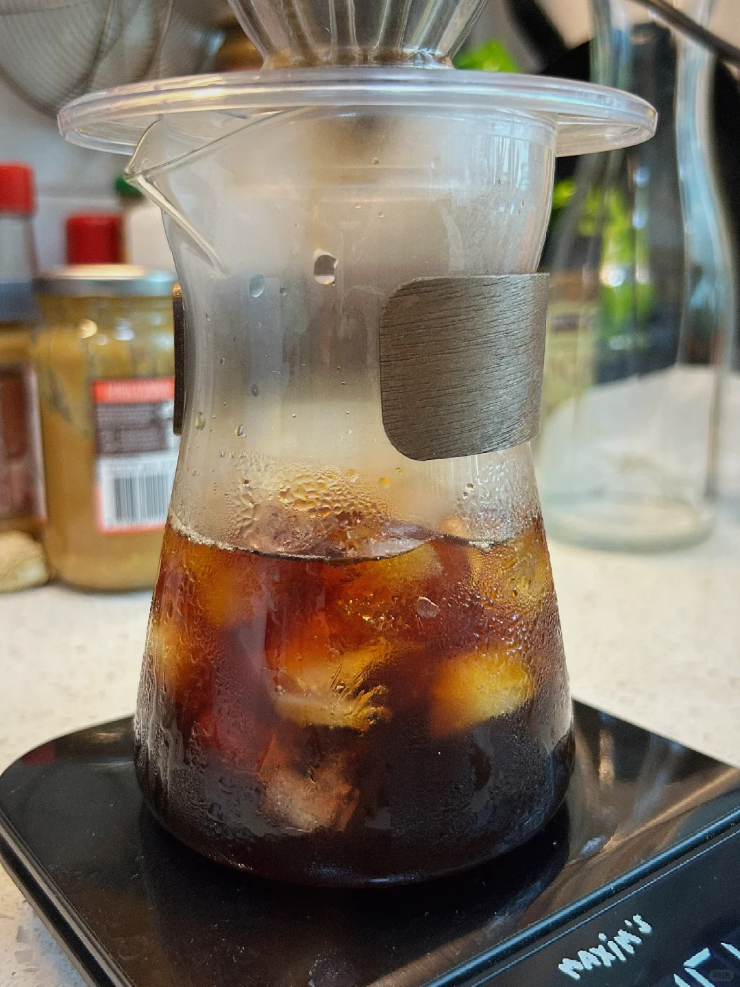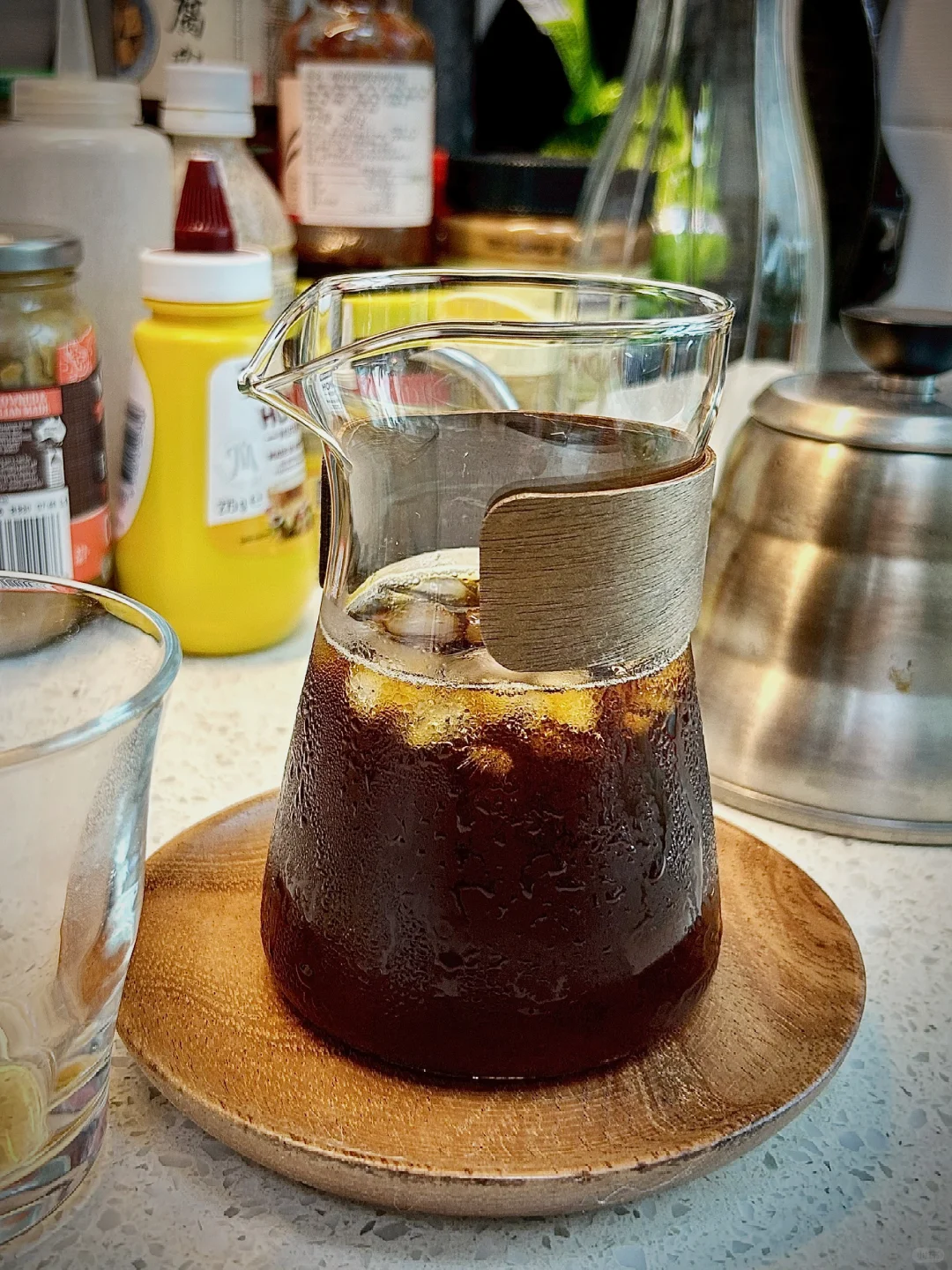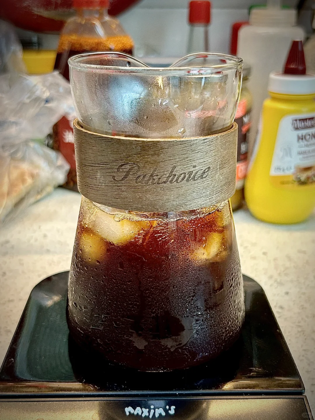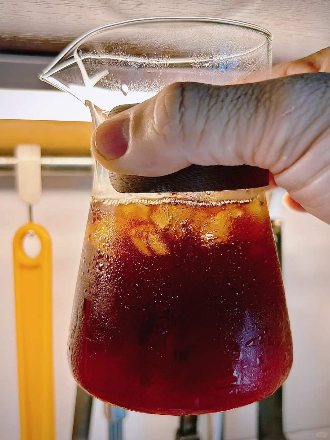 洪都拉斯·甜橙, 22 克豆子,小富士刻度 2, 92℃ 热水,延长焖蒸时间至 45 秒,2 分 20 秒,萃取 170 克咖啡液,壶中预装 175 克冰块。一杯入喉,冰爽,果香。