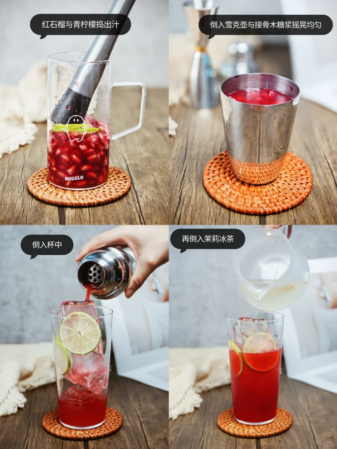 姥姥家房前的的石榴树上🌳的结了几个红彤彤的香甜多汁的大石榴 一点点的剥开果皮,用花茶🌸调饮,在炎热的午后,倒入装有冰块的杯中,飘散着淡淡花香,入口是浓郁的石榴汁 - 🍹【所需食材:】 红石榴半个 青柠檬片 接骨木糖浆15ml 茉莉绿茶100ml 冰块 - 🍹【调饮步骤:】 ©️2g茉莉绿茶与100ml热水冲泡,倒入装有冰块的茶壶里,待冰块融化备用 ©️石榴与柠檬片一起捣出汁,倒入雪克壶里,与接骨木糖浆摇晃均匀,倒入装有冰块的杯中 ©️倒入茉莉茶汤,用茉莉花和青柠檬装饰