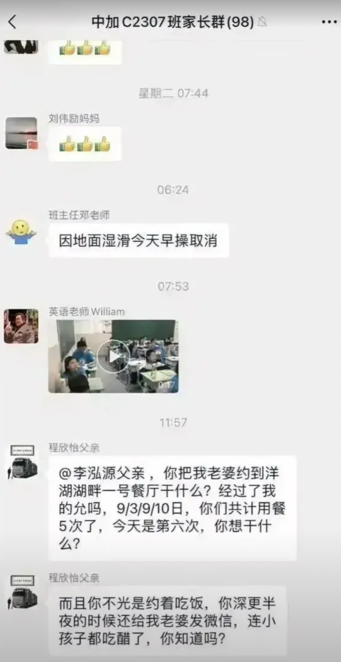 李弘源的父亲 先后5次约程欣怡的妈妈吃饭 第6次时程欣怡爸爸忍无可忍 直接在班级群中质问对方有何用意 并直言对方半夜三更跟自己老婆聊天 使得孩子都吃醋了