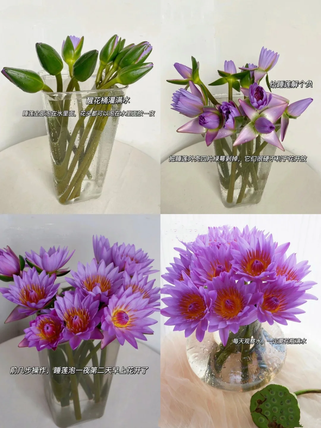 养护看下面⬇ 1.醒花 ①剪根:平剪,灌根; ②醒花:深水醒花4-8小时。 2.养护 ①掰萼:掰开或摘去花萼(绿色部分); ②水位:深水位,花头离水位线8cm以内; ③剪根:平剪1-2cm,灌根; ④加料:清水,延缓水质浑浊可加1滴84或1粒二氧化氯/L(睡莲不要加雪碧,不然第二天就全垂头了,类似的花材也不适用雪碧大法); ⑤换水:易烂根,建议1-3天一换水并剪根,清洗花瓶和花枝; ⑥Tips:避免暴晒,勿放空调风口,远离水果。 3.瓶插期 5-10天。