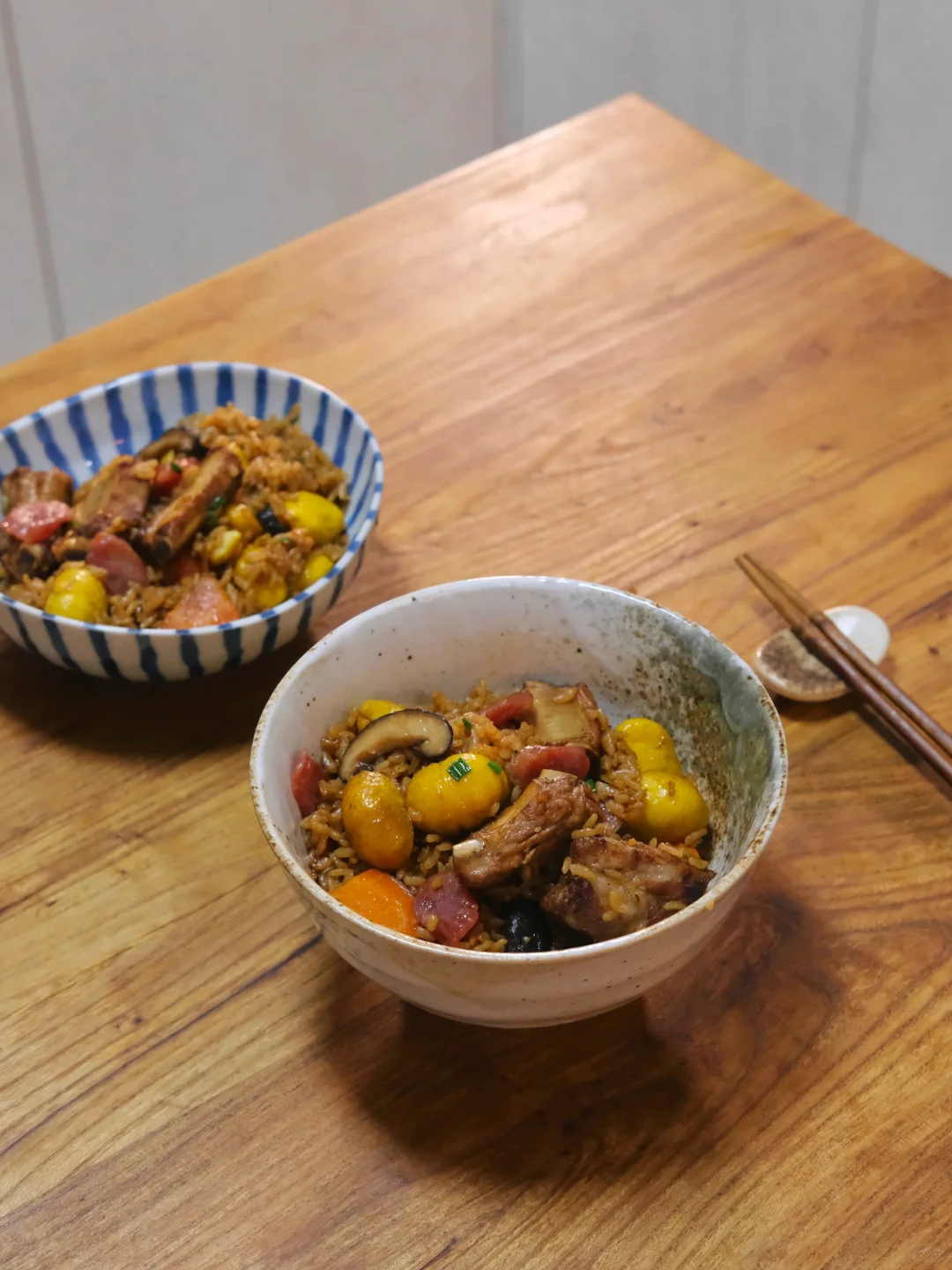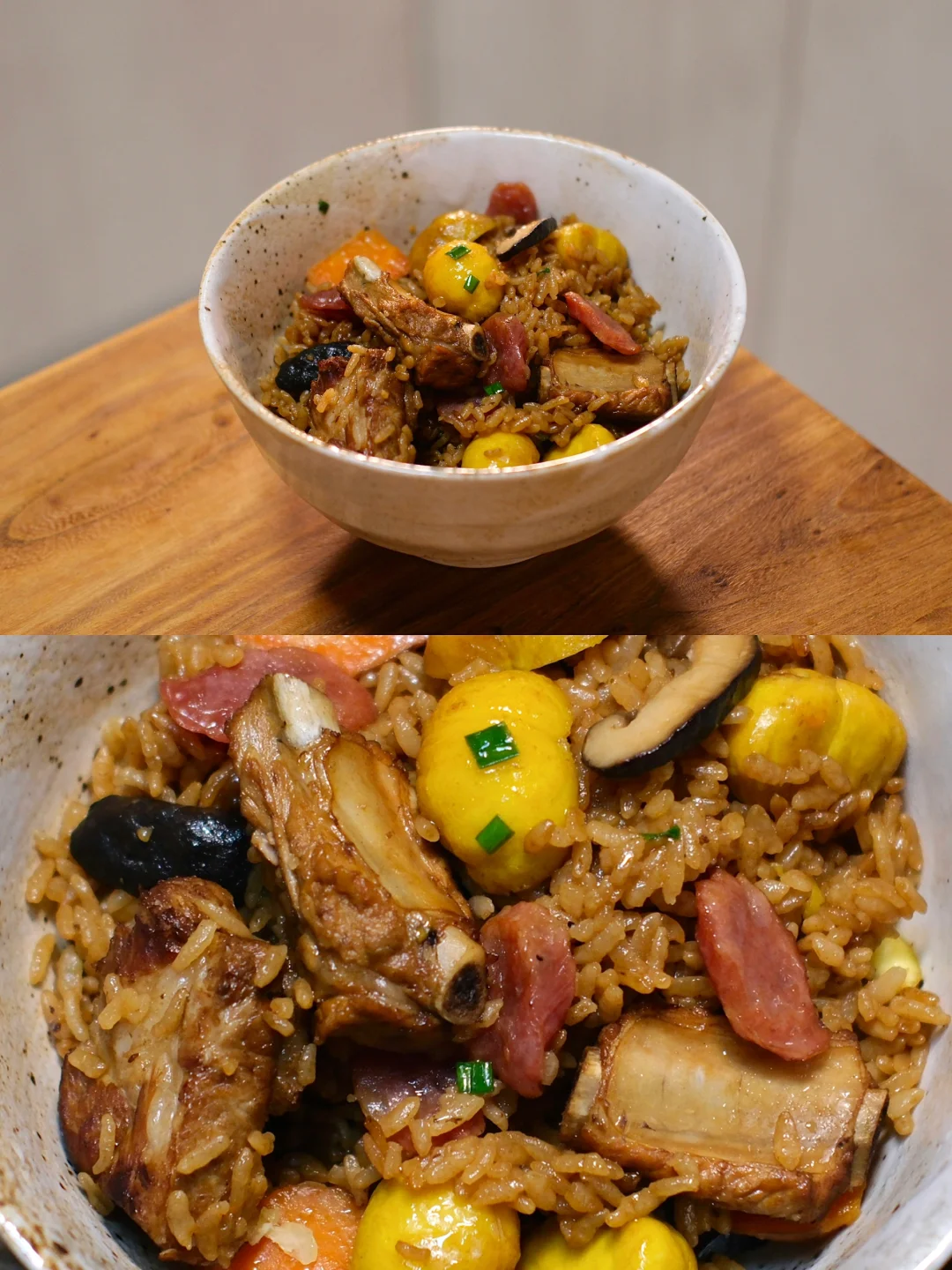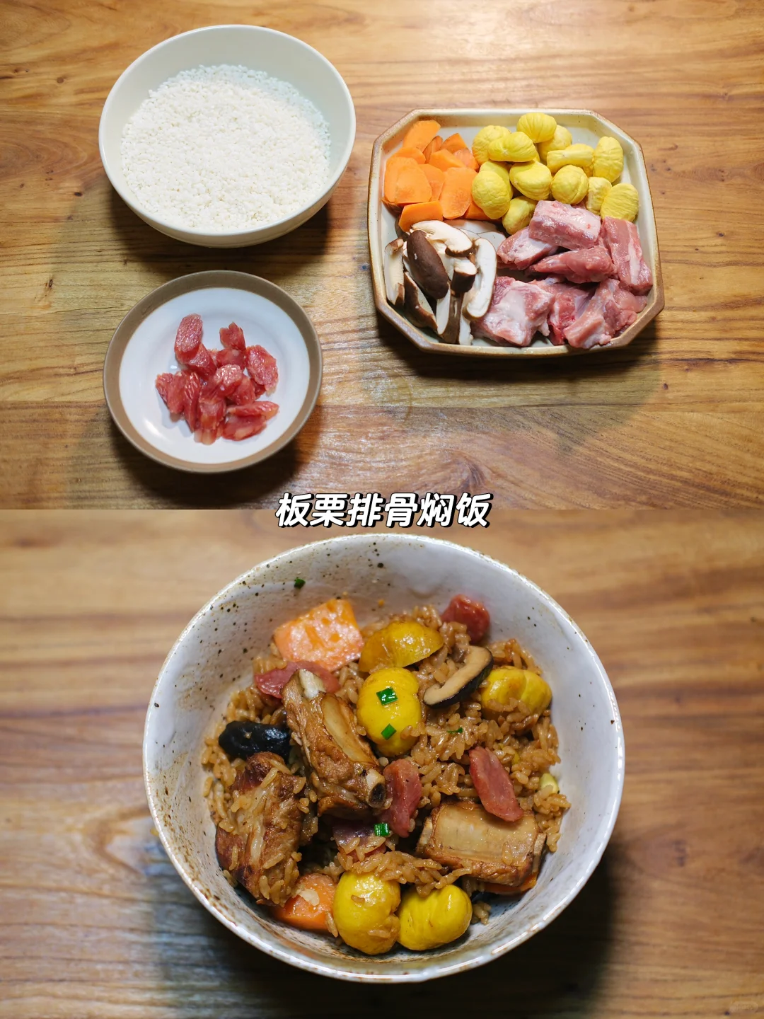 今日菜单: 板栗排骨焖饭 食材: 板栗、胡萝卜、肋排、香菇、腊肠、大米 图上是两人份的食材 简单的食材做出超好吃的焖饭 秋天是板栗的季节,2024的第一顿板栗,我们已经安排上了! 想看看你们的板栗怎么吃