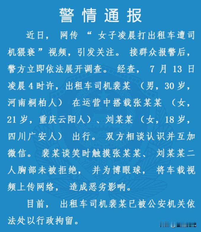 重庆,一出租车司机对车上的女乘客提出摸胸部来抵车费的想法,两个女子没有拒绝。司机得逞后拍视频炫耀,被出租车公司知道了。出租车公司将男子停职进行调查。网友:一个愿打一个愿挨,两个当事人不发声,第三方不愿意了。 赵师傅,一个在重庆开夜班出租车的普通中年男人,因为一段视频,成了众矢之的。视频里,他得意洋洋地讲述着自己如何“占便宜”:两名年轻女子深夜打车,声称没带钱,他便提出以“摸一下”抵车费,令人震惊的是,对方竟然同意了。赵师傅的同行看到这个视频之后举报了他,他也被出租车公司停职,等待他的将是法律的制裁。 (信源:黑龙江网2024-07-15 《重庆一出租车司机凌晨拉载乘客,不收车费,转身抚摸女乘客胸部。》) 凌晨的城市,路灯昏黄,街道空荡,只有零星几辆出租车像游魂般穿梭,成为夜归人唯一的依靠。车窗外的霓虹渐渐熄灭,疲惫和不安在车厢内蔓延,这方小小的空间,本应是安全的港湾,却也可能成为另一片灰色地带。撕开了夜幕下的平静,将出租车司机、乘客和公众的视线,都聚焦到同一个问题上:在性别、权利和道德的十字路口,我们该如何划清界限? 事件曝光后,网络上掀起了轩然大波,网友们纷纷发表自己的看法,谴责的声音自然占据了主流,但也有不少人将矛头指向了女乘客,质疑她们“半夜打车”“衣着暴露”,甚至有人认为她们是“自愿的”,这种“受害者有罪论”的论调,无疑是对女性的二次伤害。 看似是司机个人的道德败坏,却也暴露出一个长期被忽视的问题:在出租车这个特殊的空间里,性别界限的模糊,可能为不法行为提供滋生的温床。 《治安管理处罚法》第四十四条明确规定:猥亵他人,或者在公共场所故意裸露身体,情节恶劣的,处五日以上十日以下拘留。《民法典》第八条也指出:民事主体从事民事活动,不得违反法律,不得违背公序良俗。这位司机的行为,毫无疑问已经触犯了法律的红线,无论乘客是否“自愿”,都不能成为他们逃避责任的借口。 出租车行业长期缺乏监管,司机的素质参差不齐,有驾驶证经过平台注册之后就可以成为出租车司机,安全隐患很突出。出租车公司作为社会上的企业,有责任也有义务加强对司机的管理和培训,制定建立健全的投诉处理机制,对于这些违法违规行为,要坚决予以打击,绝对不能不姑息。 而对于处于弱势地位的女性乘客,则需要提升自己的自我保护意识,面对不法侵害的时候要勇敢的说不。像是这两位女乘客,也许是为了防止司机做出其他出格的事情才答应了司机的请求。但是她们也可以采取其他的办法,并不是只有这一种办法。 然后相关的法律法规也需要与时俱进,进一步完善对性骚扰、猥亵等行为的界定和处罚标准,提高罪犯的违法成本,让心怀不轨之徒望而却步。更重要的是要加强社会公众的普法教育,提升全民的法律意识和道德水平,让尊重女性、保护弱势群体成为一种社会共识。 每一个深夜出行的人,都渴望安全抵达目的地,这也需要社会各界共同努力,为夜归人撑起一片安全的天空。