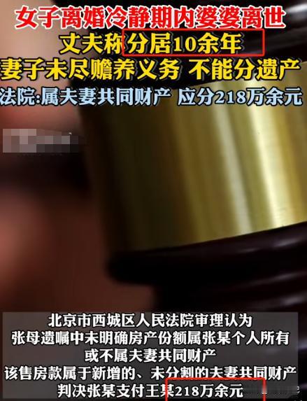 北京,丈夫提出要与婚内出轨的老婆离婚。离婚冷静期时,丈夫母亲病重去世,并留下500万房产。女子瞬间反悔,并在婆婆丧事还没有办完的情况下,将丈夫告上法庭,要求分遗产,法庭上,丈夫称女子并未尽到赡养义务,还说她出轨了,理应不分或者少分,谁知,法院的判决让人意外。 这世上,有多少感情经不起考验,又有多少人败给了欲望?张先生怎么也没想到,自己会和妻子王女士在法庭上针锋相对。曾经的恩爱夫妻,如今却形同陌路,而这一切,都要从王女士的出轨说起。 (信息来源:光明网2023年3月24日关于《热搜第一!离婚冷静期内婆婆去世丈夫拒分遗产,法院这样判》) 发现妻子出轨后,张先生内心经历了一番剧烈的挣扎。最终,他选择了隐忍,希望能够挽回这段婚姻。然而,王女士似乎并没有意识到自己的错误,反而变本加厉,甚至与第三者长期保持不正当关系,最终提出离婚。 王女士的绝情让张先生心灰意冷。面对妻子的步步紧逼,他最终同意离婚。然而,就在双方办理离婚手续期间,张先生的母亲病重去世,留下了一套价值500万的房产。 这笔突如其来的遗产,让原本就已剑拔弩张的离婚案变得更加复杂。王女士得知后,立即要求分得一半遗产,理由是两人虽然在办理离婚手续,但尚未正式解除婚姻关系,因此这笔遗产属于夫妻共同财产。 张先生对此感到无比愤怒。他认为,王女士在婚姻存续期间不仅不忠,还对病重的婆婆不闻不问,没有尽到一丝一毫的赡养义务,如今却想来分一杯羹,简直是毫无道理可言。 双方各执一词,最终对簿公堂。法庭上,张先生痛斥王女士的背叛和无情,并指责她在婚姻中存在重大过错,不应分得遗产。然而,王女士却反驳称,张先生无法提供自己出轨的证据,所谓“过错方”的说法根本不成立。 最终,法院根据相关法律规定,判定王女士在离婚冷静期内依然享有合法继承权,可以分得部分遗产。面对这样的判决结果,张先生内心五味杂陈。 一纸诉讼,将婚姻、遗产、责任等问题摆在了人们的面前。有人说法院的判决很客观,认为就应该保持客观公正,不能因为个人的情感因素而左右判决结果。也有人说王女士的行为令人厌恶,法律不应成为保护不道德行为的工具。 两个人从相知相恋到结婚生子,最终相看两相厌。难道这就是婚姻吗?婚姻的意义何在?两个人的责任和义务到底要怎么界定?在法律与道德之间,我们应该如何选择?这场遗产之争,最终以双方金钱的分割画上了句号,但它留给了我们很多思考和启示。 柴米油盐的平凡,让婚姻褪去恋爱的新鲜感和刺激感,剩下的尽是现实。真正的幸福并不是建立在物质基础上的,而是来源于彼此的尊重、理解和包容。在婚姻的道路上,我们是找一个志同道合的朋友一起玩耍,一起走向漫漫人生路,我们想要共同承担一些责任,才能走得更远。而那些为了利益为了自己享乐不择手段的人,最终只会落得一地鸡毛的下场,也会失去真正宝贵的东西。