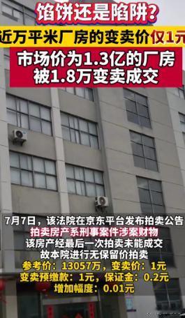炸了!法院拍卖一个参考价值为13057万元人民币的厂房,吸引了140人报名,最终成交价竟是1.8万元!然而,网友坐不住了,到底谁捡了这个便宜 ?这个法拍房到底是天上掉馅饼还是陷阱? “1.8万买到1.3亿厂房!” 这消息一出,全网都炸了。 (来源:第一财经2024-08-06《馅饼还是陷阱?近万平米厂房的变卖价仅1元!市场价为1.3亿的厂房被1.8万变卖成交》) 网友们纷纷化身柠檬精,酸了,真酸了。这简直比中彩票还离谱,简直是天上掉馅饼,砸中了一个叫刘涛的幸运儿。 但事实真的如此吗?法拍房这趟浑水,你敢蹚吗? 法拍房,简单来说就是法院拍卖的房子,因为各种原因被法院强制执行拍卖。它的最大诱惑力就是价格便宜,往往低于市场价。低价的背后,是风险。法院只负责拍卖,不负责房产的交付。也就是说,你拍下了房子,后续的各种问题,如果房产存在债务纠纷,都得你自己解决。所以,天上不会掉馅饼,只会掉陷阱。 北京西城区,一个估值 1.3 亿的厂房,因为刑事案件被法院拍卖。第一次拍卖,起拍价 9140 万,无人问津。第二次拍卖,降价到 7312 万,依然流拍。于是,法院拿出了“无保留价”拍卖的杀手锏,1 元起拍。“无保留价”拍卖,顾名思义,就是没有最低价限制,只要有人出价,就能拍。而这次拍卖,更震惊的是,竞价幅度只有 0.01 元。 消息一出,2 万多人围观,140 人报名。这场拍卖,从 8 月 2 日持续到 8 月 5 日,历时 3 天,最终被刘涛以 1.8 万的价格拿下。1.8 万,买 1.3 亿的厂房?是陷阱还是馅饼? 刘涛真的赚了一个多亿吗?答案显然是否定的。 法拍房的实际成交价,只是冰山一角。竞拍成功后,还需要缴纳各种税费,以及处理房产遗留的各种问题,这些成本加起来,可能远超你的想象。这个厂房还是刑事案件的涉案财物,本身就存在很多法律风险和债务隐患。刘涛要接手这个厂房,就必须承担这些风险和债务。 所以,1.8 万的背后,可能是一个巨大的坑。 投资有风险,入市需谨慎。法拍房市场,可以说是一种机遇,也可以说是一种挑战。对于想要参与其中的投资者来说,首先要保持理性清醒的头脑,谨慎入场,做好充分的准备工作,才能避免踩坑,获得效益。 那么,法拍房市场,到底是机遇还是泡沫?一方面,法拍房市场的价格优势,确实吸引人。而且,随着监管的加强和市场机制的完善,法拍房的交易流程也越来越规范透明,风险相对降低。另一方面,法拍房的潜在风险依然存在。比如,房产的权属问题、交付问题、债务问题等等,都可能给竞拍者带来巨大的损失。 所以,在参与竞买拍卖房屋时,购买者应事先了解相关流程和手续,详读公示信息,全面知悉房屋存在的各类风险,需要保持理性和耐心,在理性预算、知悉风险、了解规则的前提下参加竞买。 未来法拍房市场的发展将离不开政策的支持和市场的自律。完善相关法律法规和监管制度,对市场的健康发展将会提供有力保障。同时,市场参与者也要加强自律管理,规范自身行为,维护市场秩序和公平竞争环境。