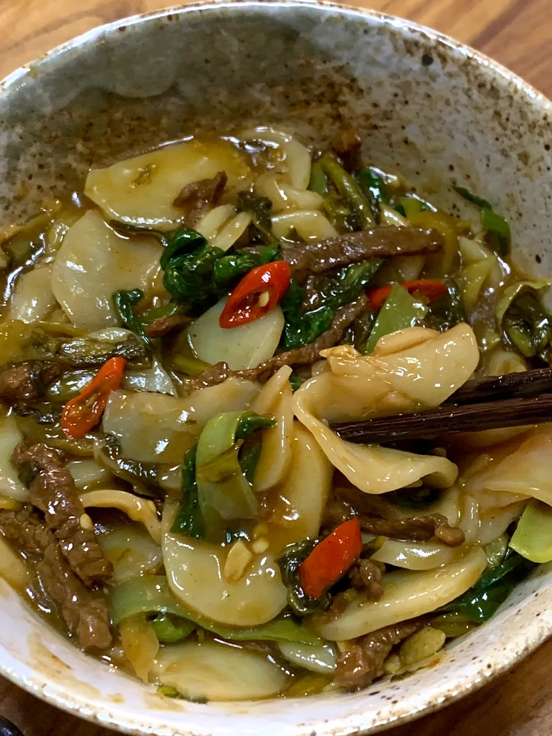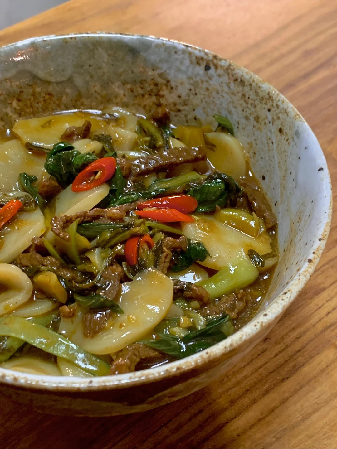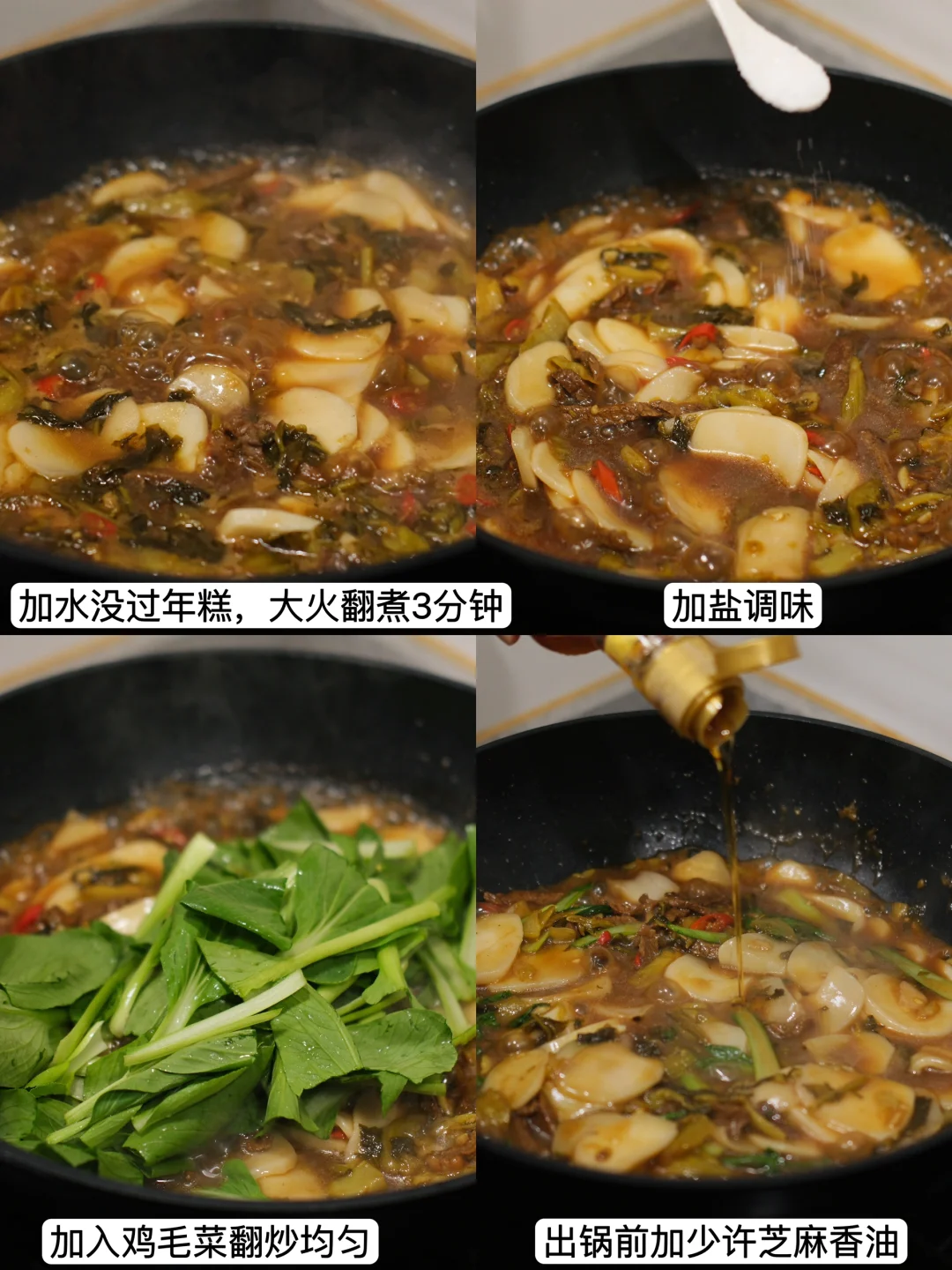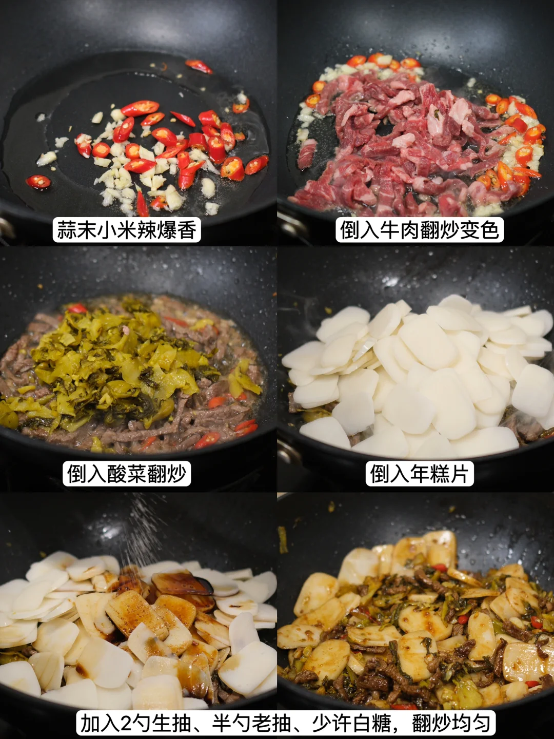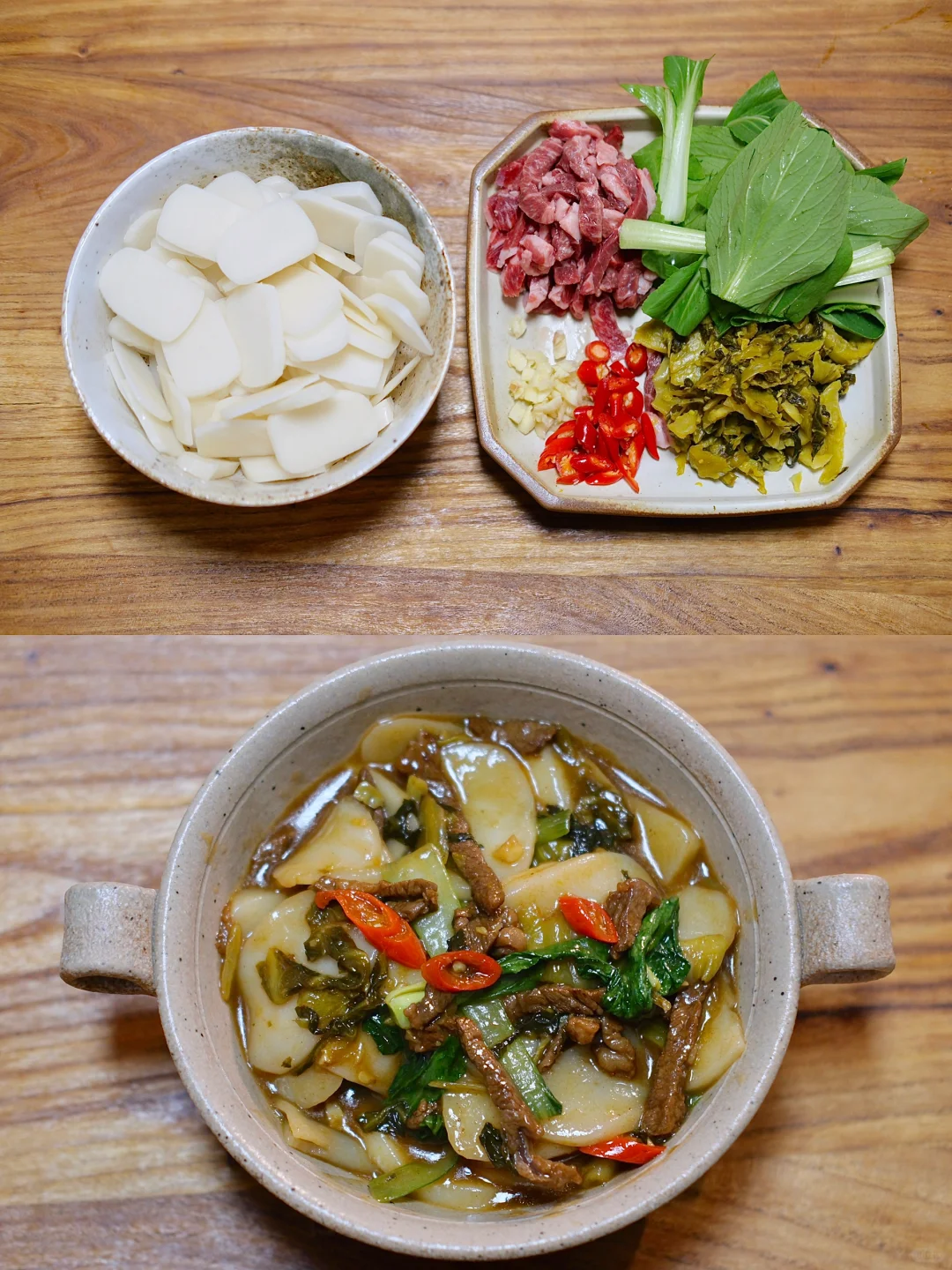 今日菜单: 酸菜牛肉年糕 食材: 年糕、蒜、小米辣、鸡毛菜、酸菜、牛肉 超级好吃!!又被夸了 两个人用了三根年糕,切薄片,不喜欢吃辣的可以少放或者不放小米辣。