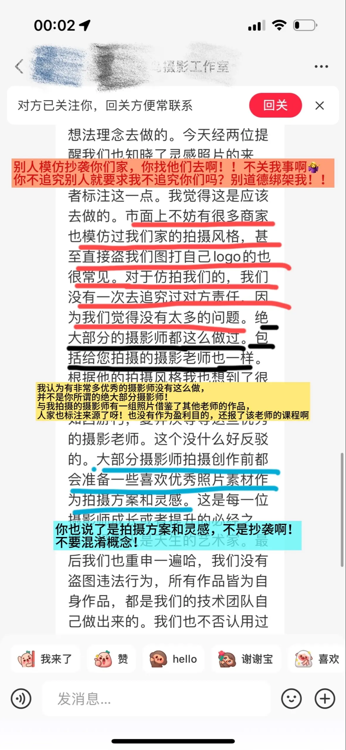我都不敢相信,这是从一个摄影工作室说出来的话!绝大部分摄影师都像他一样打着借鉴模仿的名义在未经原创允许下抄袭别人作品,并且商用盈利吗?他怎么敢说出这种话的呀!至少我认识和了解到的摄影师们都很好!很努力的创作拍摄!