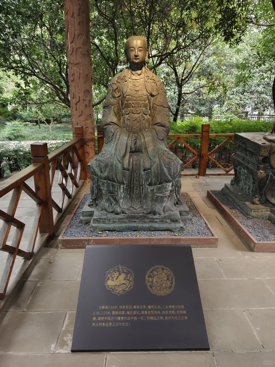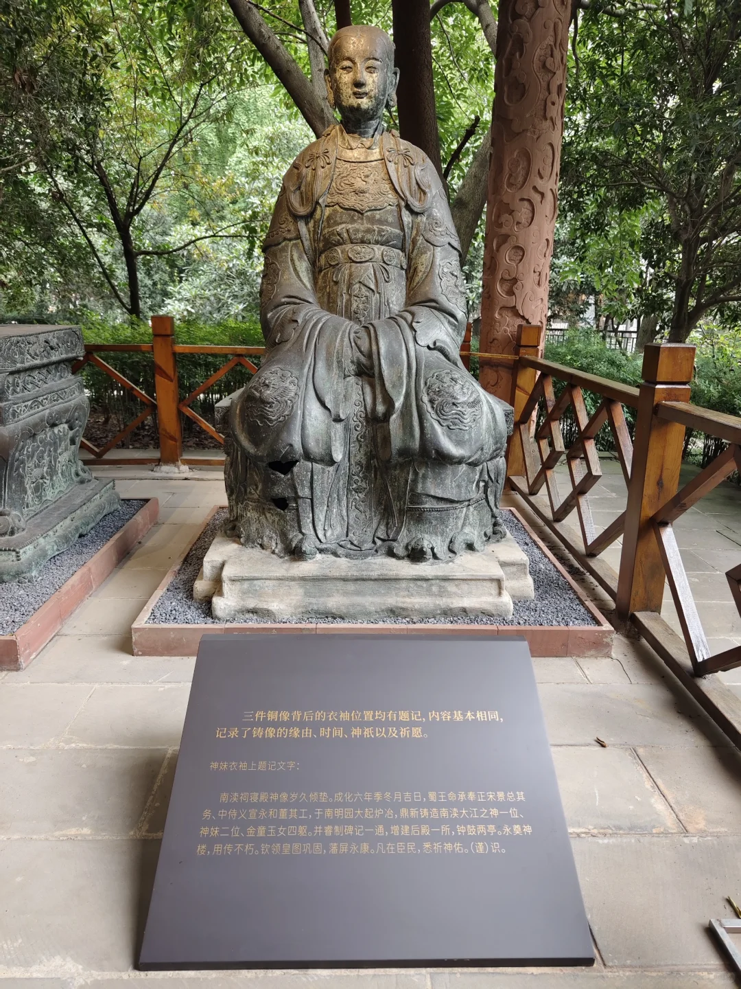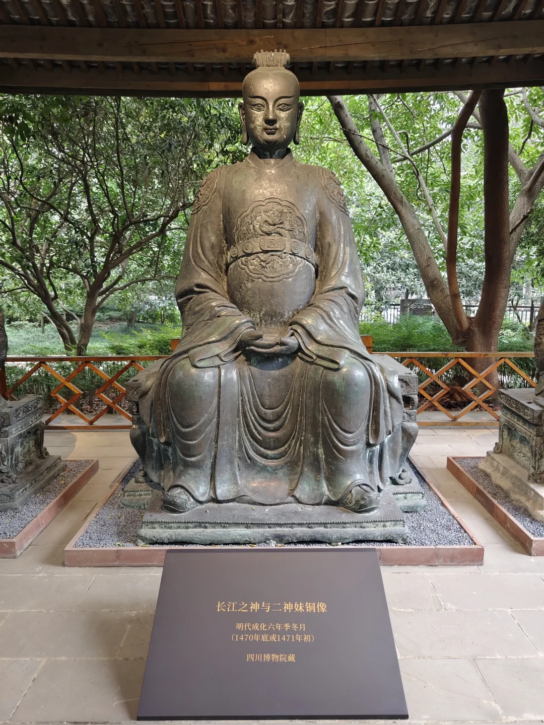 四川博物院新馆开馆以来,江渎神像就一直藏在花园深处,很多人参观完博物馆都不知道有这处文物。第一次可移动文物普查的时候,文物报上刊登了介绍江渎神像的文章,我才知道省博有这个宝贝,赶紧去把它扫描了。今年5月省博举办了“江渎文化月”活动,终于给江渎神像做了一系列展板,让人一进来就知道这边有东西。这几天展示再次升级,从临时展变成了固定展,下次来川博不要再错过这处花园里的宝藏了。