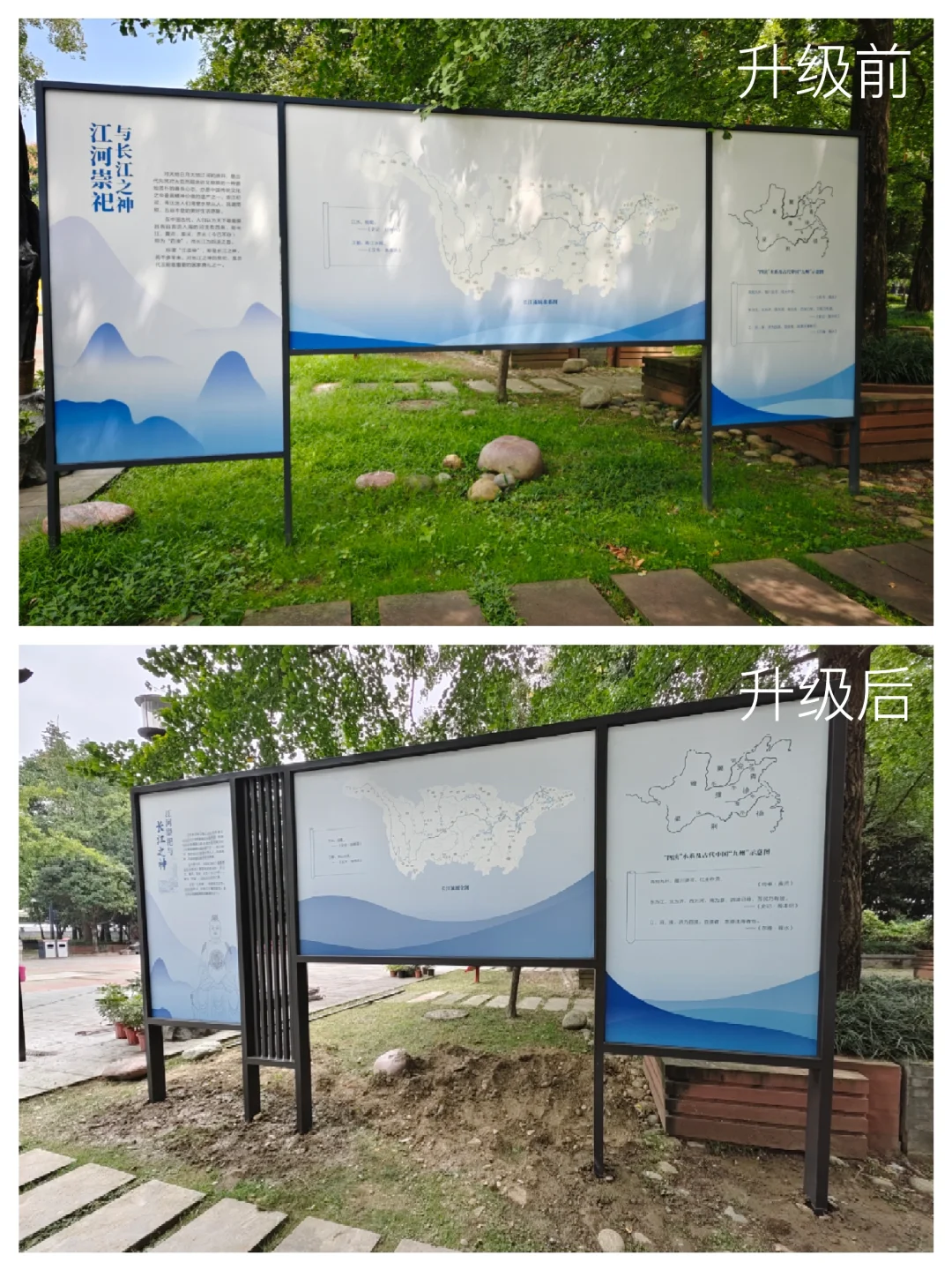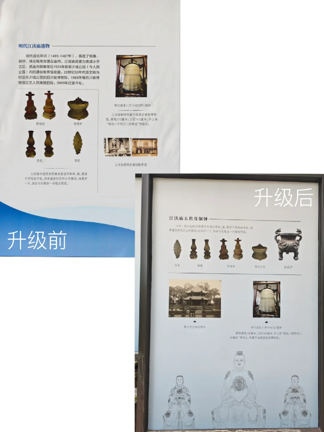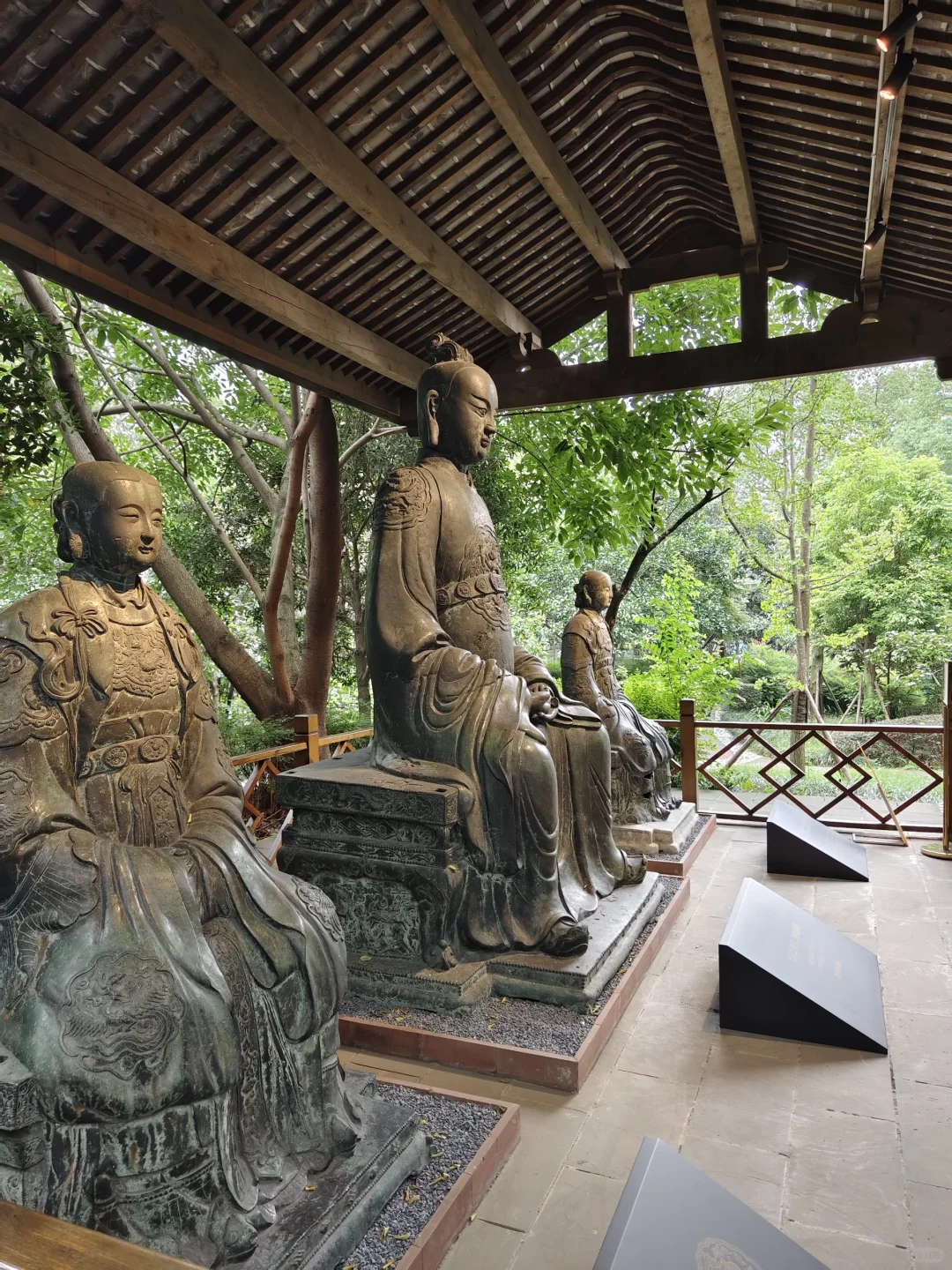 四川博物院新馆开馆以来,江渎神像就一直藏在花园深处,很多人参观完博物馆都不知道有这处文物。第一次可移动文物普查的时候,文物报上刊登了介绍江渎神像的文章,我才知道省博有这个宝贝,赶紧去把它扫描了。今年5月省博举办了“江渎文化月”活动,终于给江渎神像做了一系列展板,让人一进来就知道这边有东西。这几天展示再次升级,从临时展变成了固定展,下次来川博不要再错过这处花园里的宝藏了。
