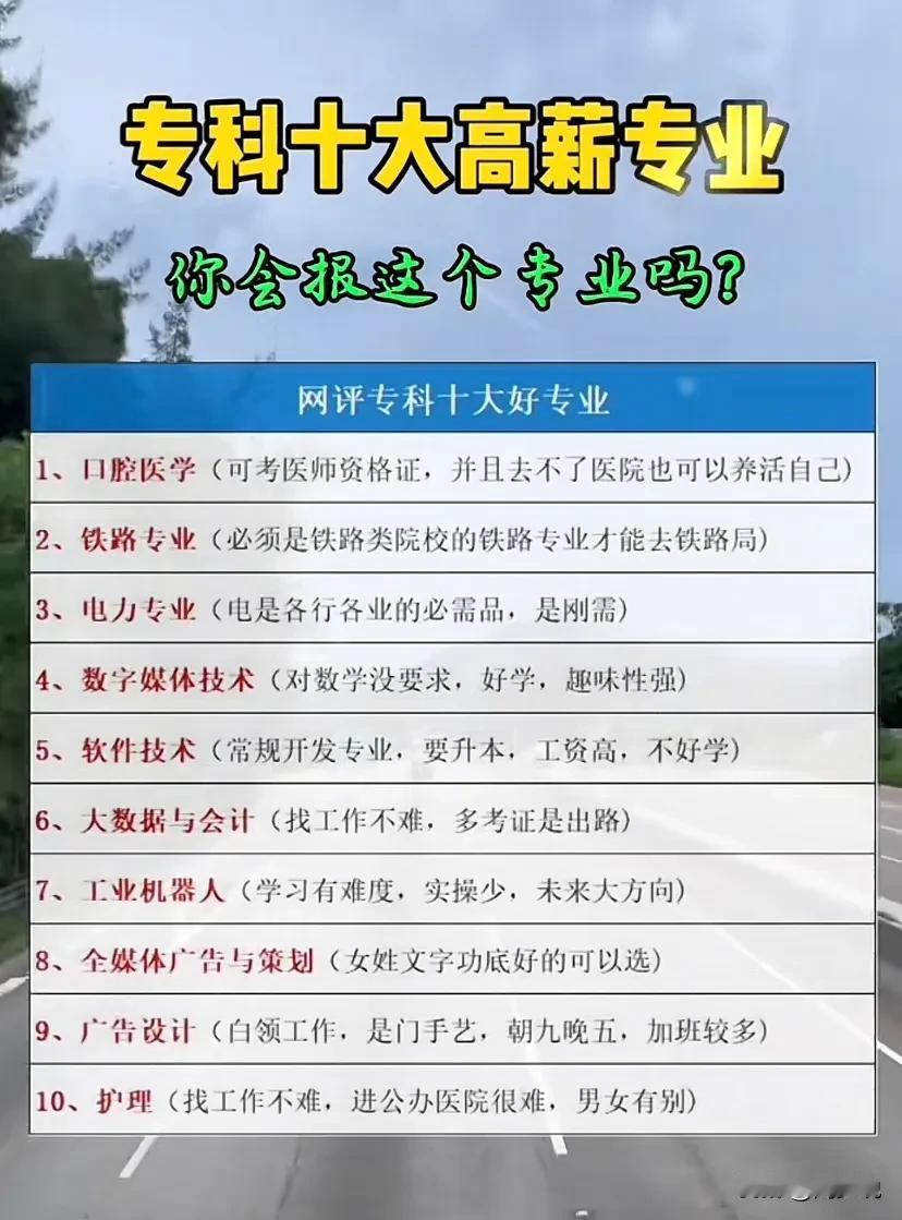 网友评选出来的专科十大高薪专业,分别是口腔医学、铁路、电力、数字媒体技术、护理等专业。对于这些专业,周少浅谈下自己的看法,口腔医学对于大专生而言,真是不错的选择,一方面对于文化要求没有那么高,即使进不去公立医院,也有大把的私立牙科诊所,更重要的是这个行业前景很大,每年看牙医的人数众多,而且等积累一定的技术和人脉资源,都可以自己开小诊所。其次,是铁路专业,但这个要求铁路相关的毕业院校,能校招进入铁路局,能吃点苦,那这辈子也是逆袭了,对于大专生而言,再好不过了。对于这十大专业,大家认可吗?