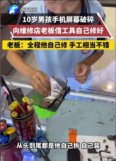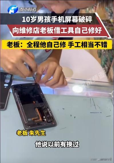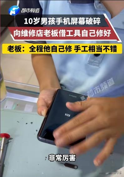 广东东莞,十岁小男孩借手机店老板的维修工具,想自己修摔破屏幕的手机。老板一开始还不相信,结果有被惊艳到。 这年头,内卷真是无处不在,连十岁的孩子都开始在手机维修领域崭露头角了。 2024年7月11日,一个再平常不过的下午,一家手机维修店迎来了意想不到的客人——一位十岁的小男孩和他的母亲。本以为是来修手机的,没想到,小男孩却是来借用工具,准备自己动手更换手机屏幕。 (信息来源:河南都市频道-“10岁男孩手机屏幕破碎,想借工具自己修。老板刚开始不相信,看到最后震惊了。”-2024.7.11) 老板朱其胜,做了十几年的手机维修,什么大场面没见过?可是,当他听到这个要求的时候,差点没一口水喷出来。十岁?自己换屏幕?还是曲面屏? 这可不是闹着玩的,要知道,曲面屏的更换难度,即使是像他这样经验丰富的老手,有时候都不敢掉以轻心。小男孩看出了老板的怀疑,却一脸淡定地解释说,自己在家换过手机屏幕,这次只是想再试试手,而且父母也同意了。 面对孩子母亲肯定的眼神,半信半疑的朱老板最终还是把工具借给了小男孩,心想:就让你试试水吧,到时候不行可别哭鼻子。然而,接下来发生的事情却让朱老板彻底傻眼了,他怎么也没想到,自己竟然见证了一场“神操作”。 只见小男孩熟练地拿起工具,动作行云流水,先是用工具拆开了手机后盖,然后用螺丝刀小心翼翼地把每颗螺丝拧下来,那架势,比一些新手还稳当。朱老板在一旁配合着用加热器烘烤屏幕,小男孩则全神贯注地将破碎的屏幕拆下来,换上新的屏幕。 整个过程一气呵成,没有一丝慌乱,看得朱老板目瞪口呆,这手艺,这手法,这专注的神情,哪里像是一个十岁的孩子?简直比许多成年人都要专业! 看着屏幕修好后重新亮起来,小男孩脸上露出了自信的笑容。朱老板忍不住感叹:“真是后生可畏啊,没想到你小小年纪,手艺竟然比很多成年人都要娴熟,真是厉害!”小男孩听到老板的夸赞,只是腼腆地笑了笑,说自己平时就喜欢鼓捣这些电子产品,以前在家拆过不少电子设备,算是积累了一些经验。修好手机后,小男孩询问工具使用费,朱老板大手一挥,豪爽地表示:“这次免费,就当是交个朋友!”小男孩有些惊讶,反复确认后才开心地接受了。 据小男孩的母亲透露,孩子从小就对电子产品表现出浓厚的兴趣,喜欢拆装玩具,探索电子设备的内部构造。随着年龄的增长,小男孩开始通过网络学习手机维修知识,并利用家里的废旧手机进行实践操作。可以说,是父母的支持和鼓励,加上小男孩自身的兴趣驱动和刻苦钻研,才造就了这位“手机小师傅”。 他的故事,让我们看到了天赋与兴趣结合的巨大力量。在这个信息爆炸的时代,每个孩子都像一张白纸,拥有无限的可能性,而兴趣,就是开启孩子潜能的金钥匙。 如果我们能够尊重孩子的兴趣爱好,为他们提供学习和成长的平台,鼓励他们勇于尝试、敢于探索,相信每个孩子都能在自己的领域创造出属于自己的精彩。每个孩子都是潜在的天才,只要我们用心去发现、去呵护,就能帮助他们点燃梦想的火种,照亮未来的道路。