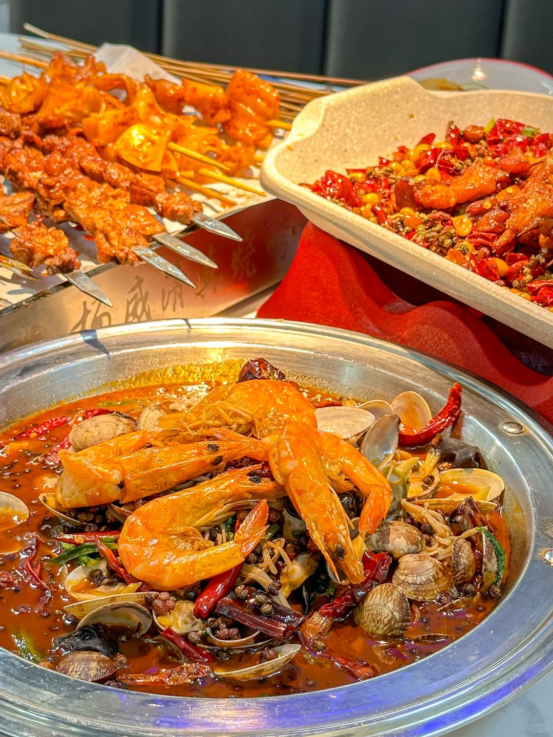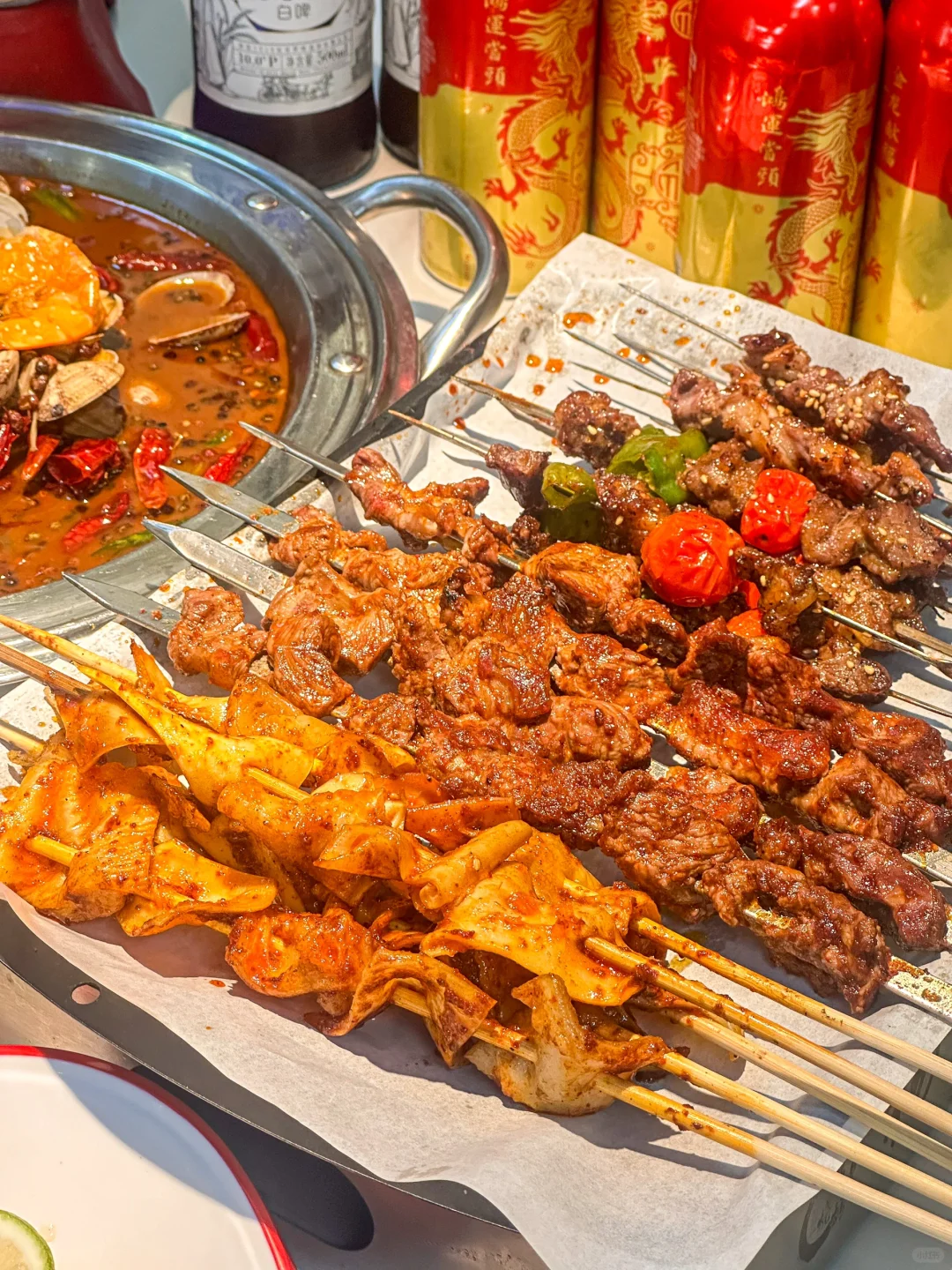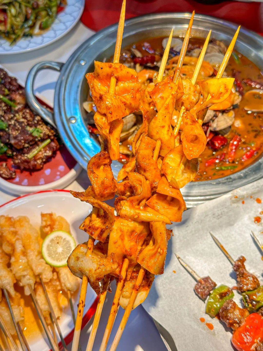 又到了跟好朋友坐在路边吃烧烤的季节! 他家的大筋皮子超香 肉串也嘎嘎大 普通女孩子吃几串就饱了哈哈 麻辣凤背串串香和起泡锅包肉 都是在别家都没吃过的味道 再来锅甜麻肥蛤 用料超足 甜麻香辣 真的太太太过瘾啦~