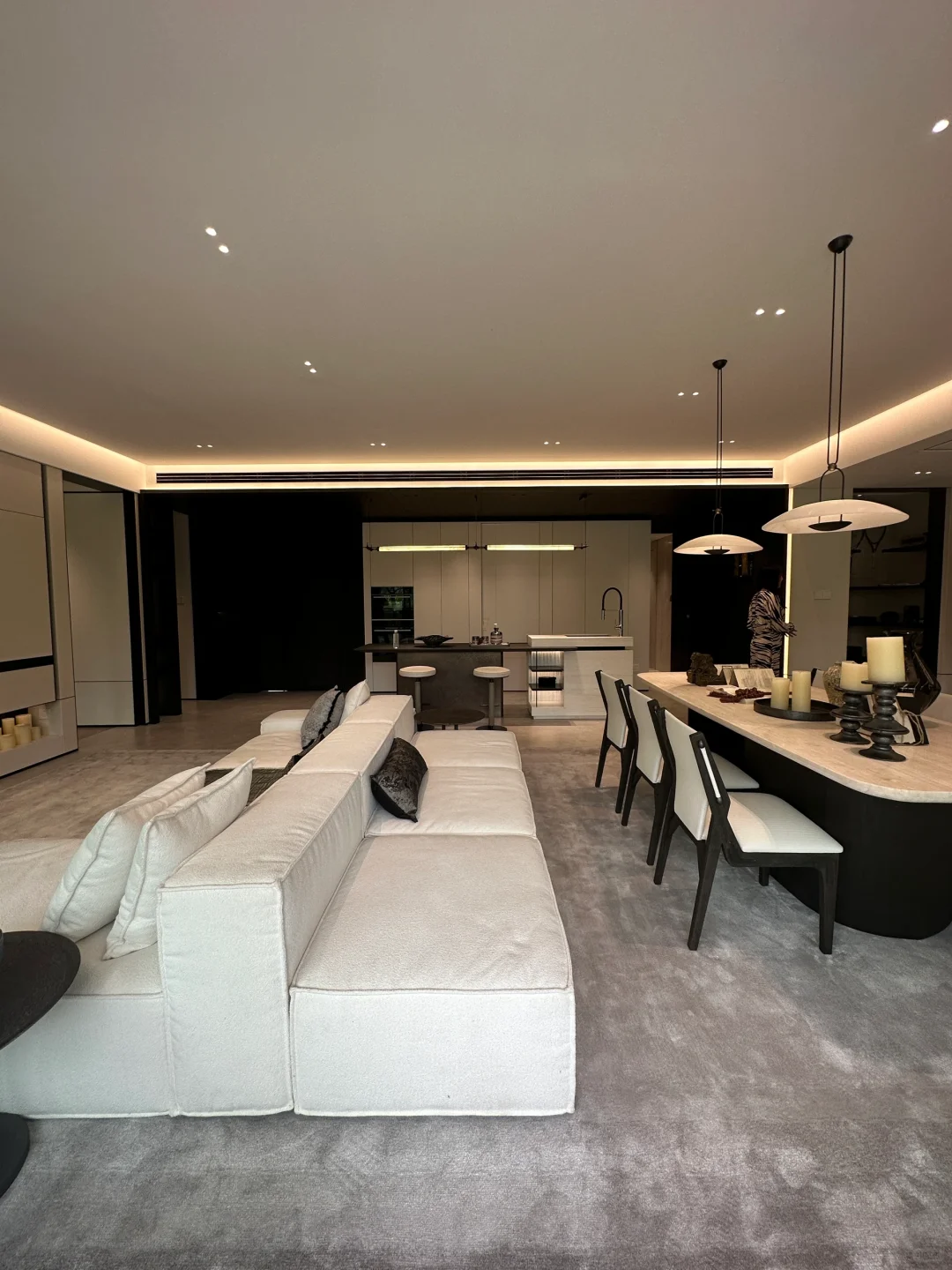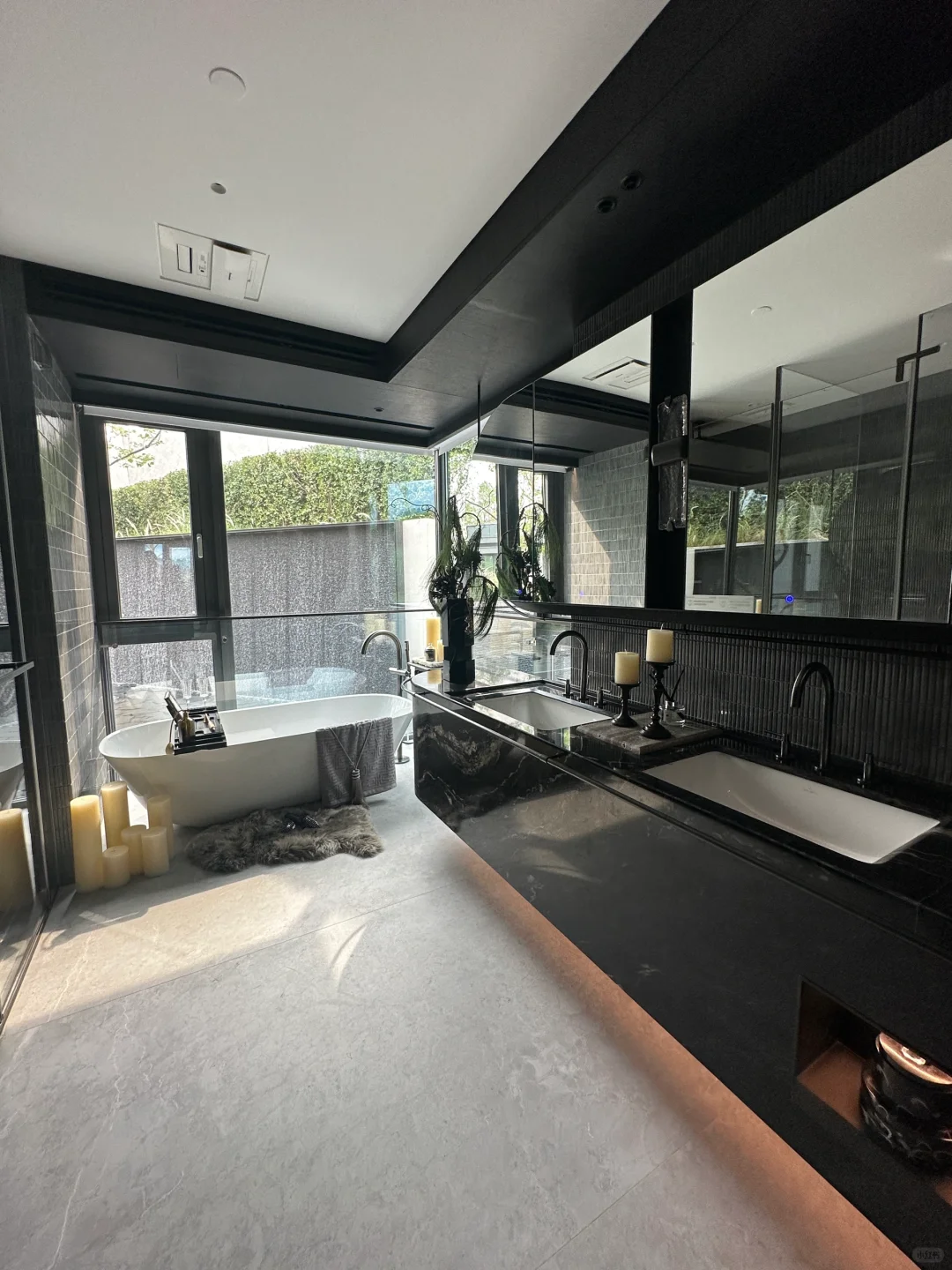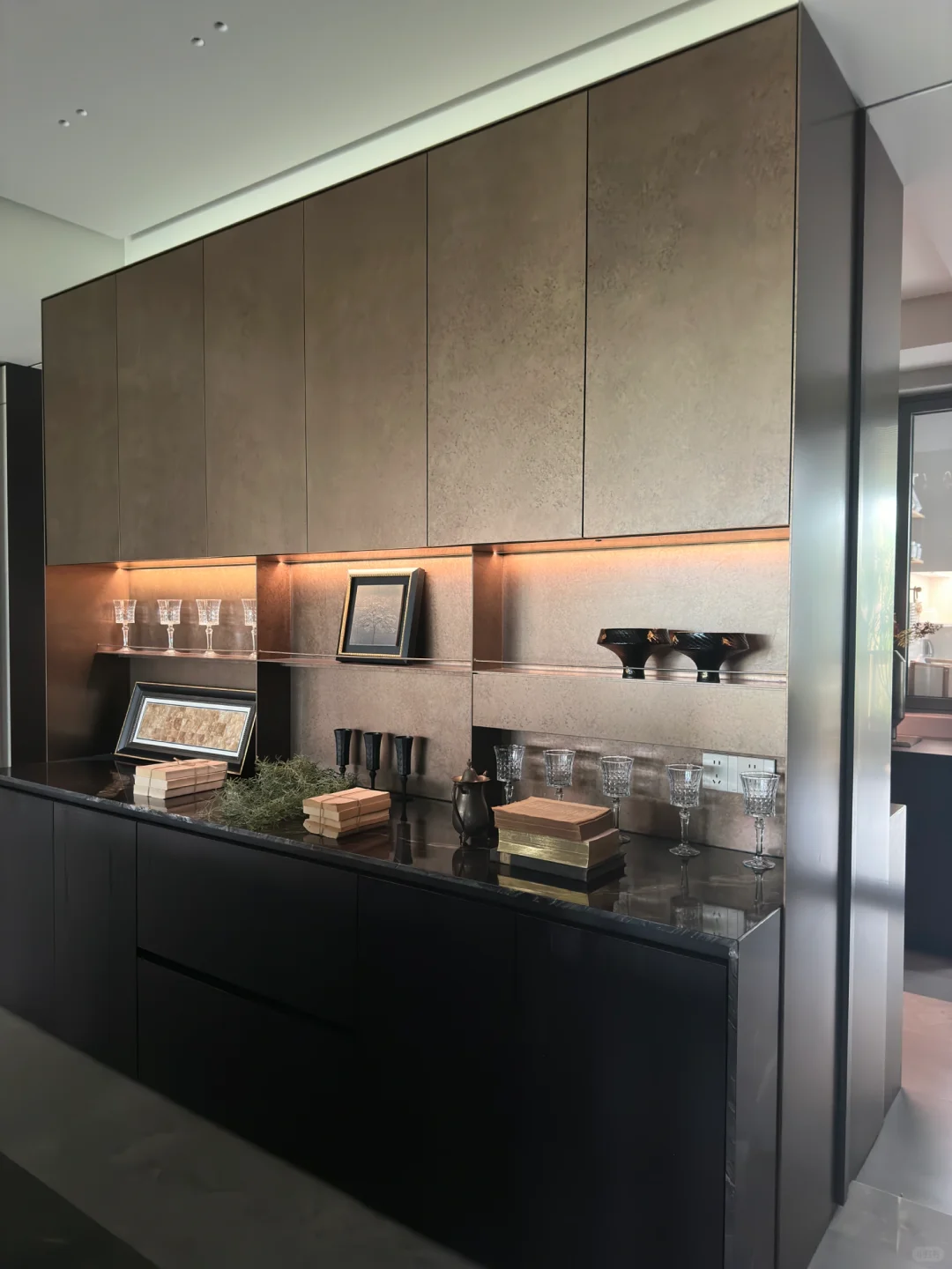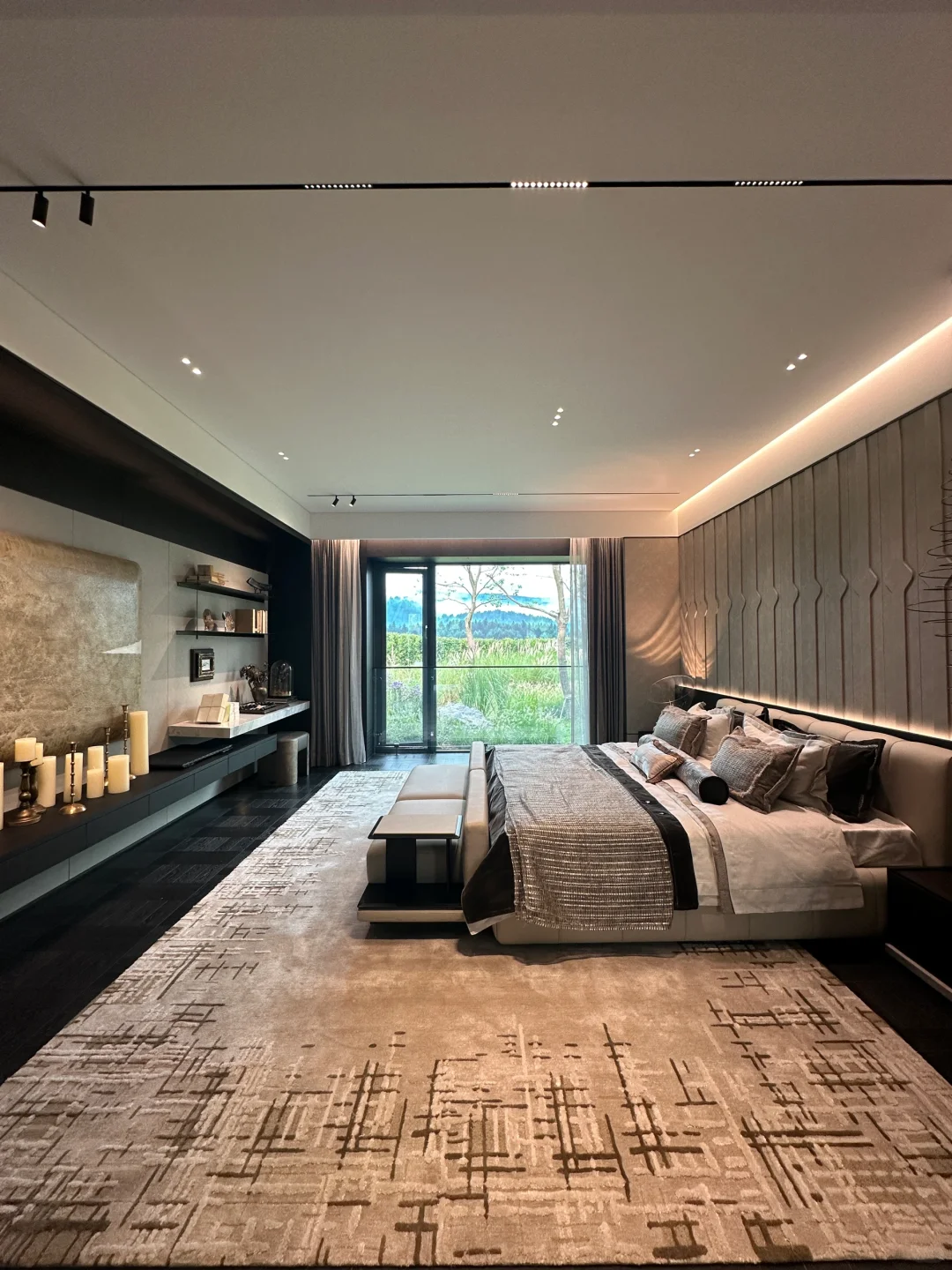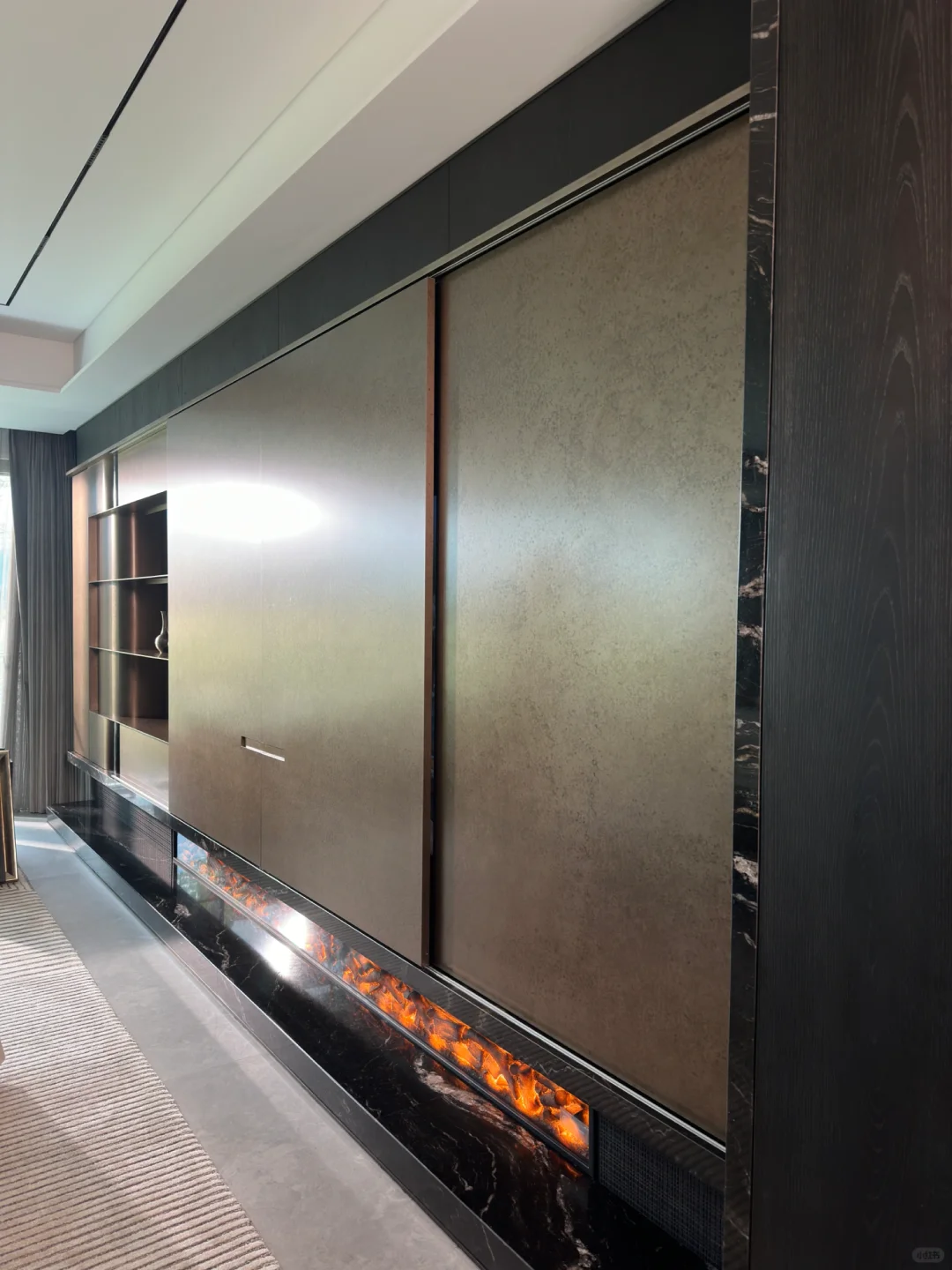 🗳️255 / 印象最深刻的是尺度,主卧约50平的,空间感非常明显,瞬间明白这就是住进豪宅需要的感觉,主卧配有一个开放式起居室,主卧浴室墙面全是靠人工一块块贴上去的,竖条纹形状的很有光泽 质感,简直是手艺活 ,其次这次255的户型大量采用了做旧的金属板,电视背景墙和中西厨都采用了,风格很新颖