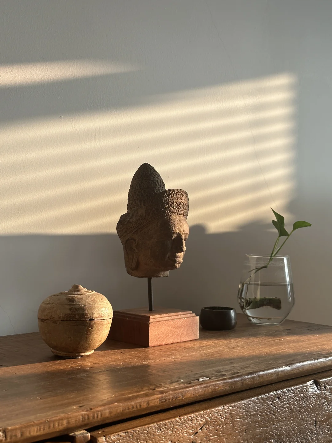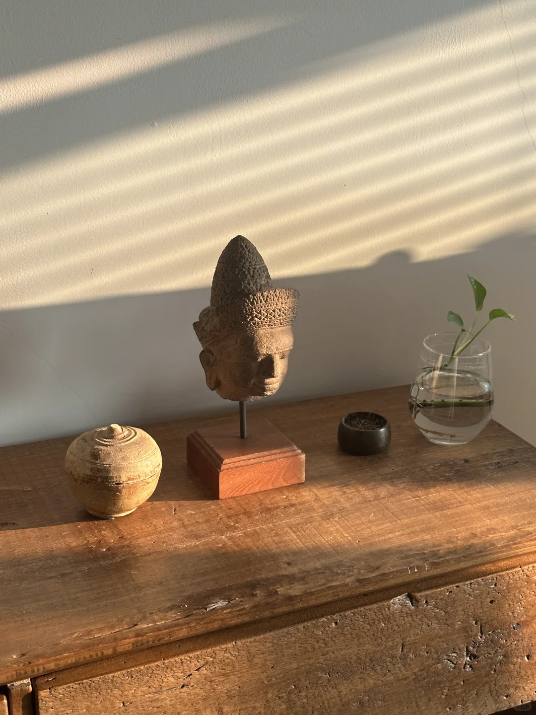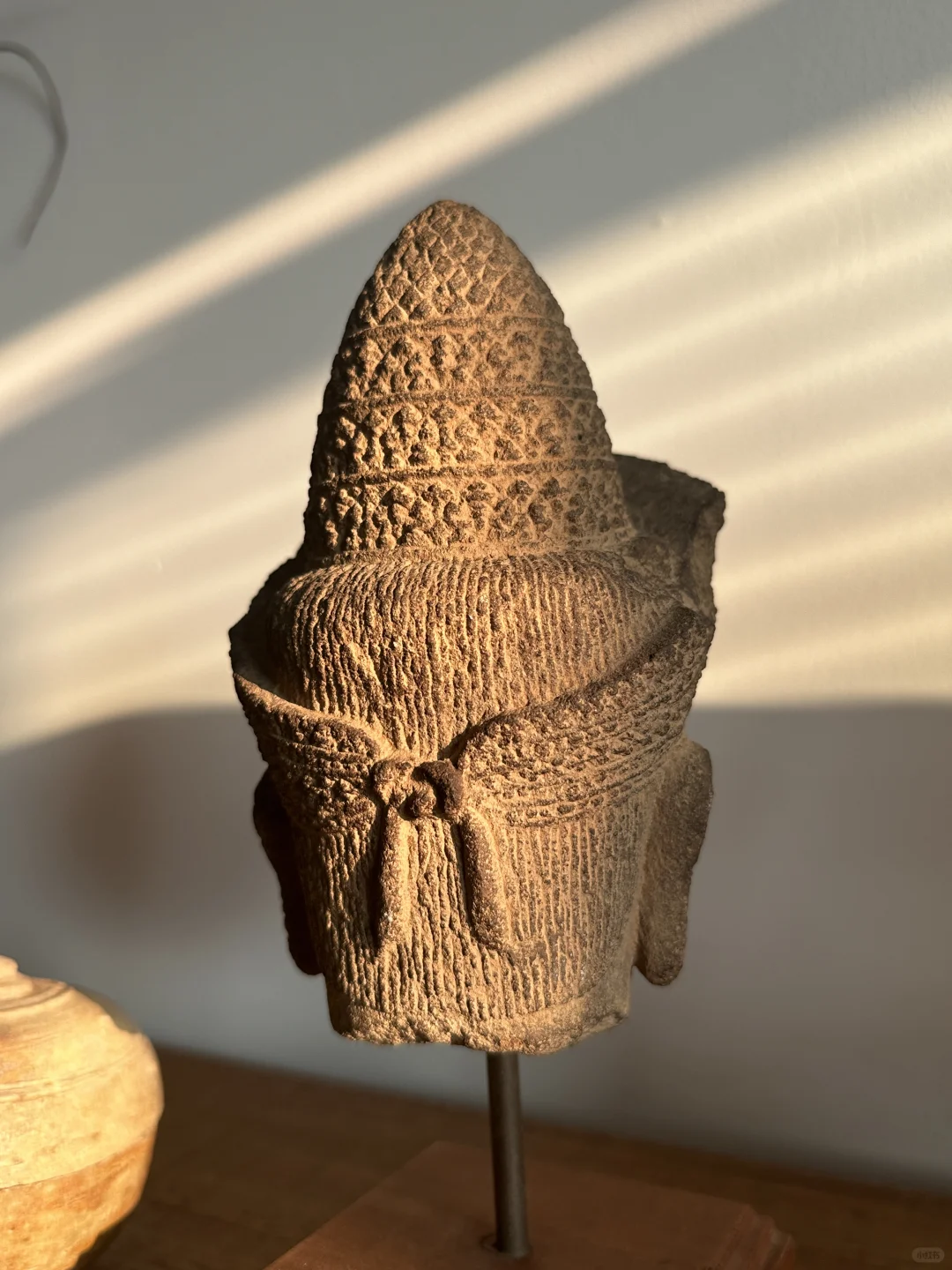 高棉12世纪Angkor Wat吴哥窟风格砂岩头像 像高16.2cm、宽10.3x 8.8cm 含底座高20cm、宽9.3x9cm 日本拍卖回流