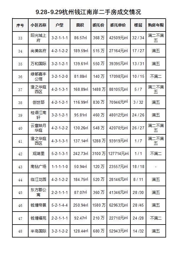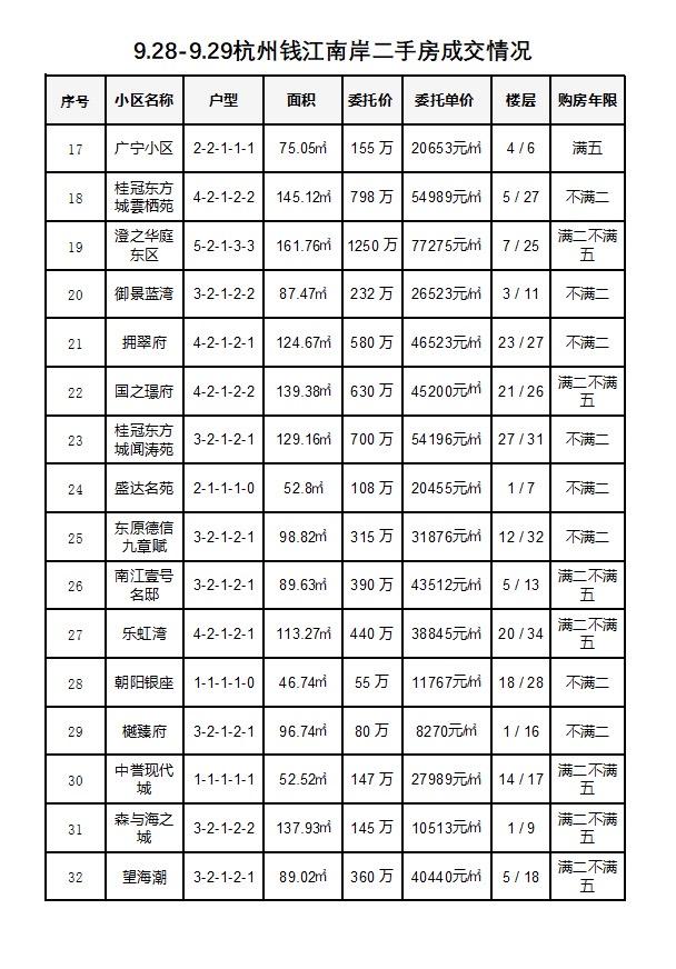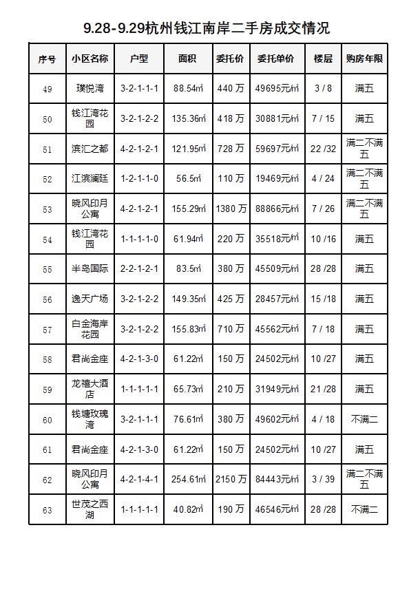 9.28-9.29杭州钱江南岸(滨江和萧山)二手房每日成交数据分享,近两日共成交63套,近期楼市政策利好不断,市场预期开始向好!杭州买房 抖音房产 二手房出售 杭州楼市