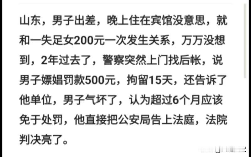 山东泰安,男子出差,晚上住在宾馆没意思,就和一失足女200元一次发生关系,万万没想到,2年过去了,警察突然上门找后帐,说男子嫖娼罚款500元,拘留15天,还告诉了他单位,男子气坏了,认为超过6个月应该免于处罚,他直接把公安局告上法庭,法院判决亮了。 (信息来源:原文登载于晋州普法在2022年5月12日关于《“就算我两年前嫖娼,也过了处罚时效!”法院是这样判的》的报道。) “抓我干嘛?都过去两年了你们是不是搞错了?”小龙被突然出现的警察吓了一跳,下意识地想往后退。警察亮出手铐冷冷地说:“有没有搞错去了局里就知道了。” 两年前的那个夜晚,小龙因为出差来到一个陌生的城市。百无聊赖的他想起老李,那个总能帮他找到乐子的“老朋友”。在老李的介绍下小龙认识了失足女王小姐,失足女王小姐很快赶来,两人以200元的价格达成了交易。 事后小龙虽然有些不安,但很快将这件“小事”抛之脑后。两人度过了一个“难忘”的夜晚。小龙怎么也没想到这次“刺激”的经历会成为他日后的梦魇。 命运的齿轮开始转动小龙的生活,也因这场看似无关的“交易”被紧紧地捆绑在一起。 三个月后老李和王小姐先后落网。为了争取宽大处理,他们都供出了自己的客户名单。警方顺藤摸瓜找到了许多像小龙这样的嫖娼者。 然而小龙在与王小姐交易后不久就注销了微信号,警方也联系不上他。而且小龙当时用的是化名“心想事成”,警方一时无法确定他的真实身份,只能将案件搁置。 时间一晃就是两年。小龙早已将那晚的经历抛在脑后,以为自己已经安全着陆。他安稳地做着他的国企员工过着平静的生活。 然而法网恢恢疏而不漏。警方在清理积案时通过技术手段,终于找到了小龙的真实身份。 面对突如其来的传唤小龙感到非常难以置信。他提出了同一个质疑:“都过去两年了你们还能抓我?”他都认为这件事已经过了治安处罚的时效。 在他看来两年已经足够久了,久到可以洗刷掉他们的罪行。法律似乎也变成了他逃避责任的挡箭牌。然而法律真的会对他网开一面吗? 答案显然是否定的。《治安管理处罚法》明确规定,违反治安管理行为在六个月内没有被公安机关发现的,不再处罚。这里的“发现”,指的是公安机关能够确定违法行为人和违法事实。 在小龙的案件中,尽管警方在两年前就已经掌握了部分线索,但由于无法确定他的身份,所以并未“发现”违法行为人。因此处罚时效不能从两年前算起。 最终小龙为自己的违法行为付出了代价。小龙被行政拘留,并处以罚款,还被国企开除,原本幸福的家庭也因此支离破碎。 这起案件像一面镜子,照出了人性深处的侥幸和法律的威严。它提醒我们无论时间过去多久,法律都不会放过任何一个违法者。 “嫖娼”不仅仅是道德问题更是违法行为。它不仅会破坏家庭和谐,还会滋生犯罪危害社会稳定。 我们每个人都要引以为戒,树立正确的价值观远离违法犯罪活动。不要心存侥幸以为可以逃脱法律的制裁。因为法律的双眼一直在注视着我们,任何违法行为终将付出代价。