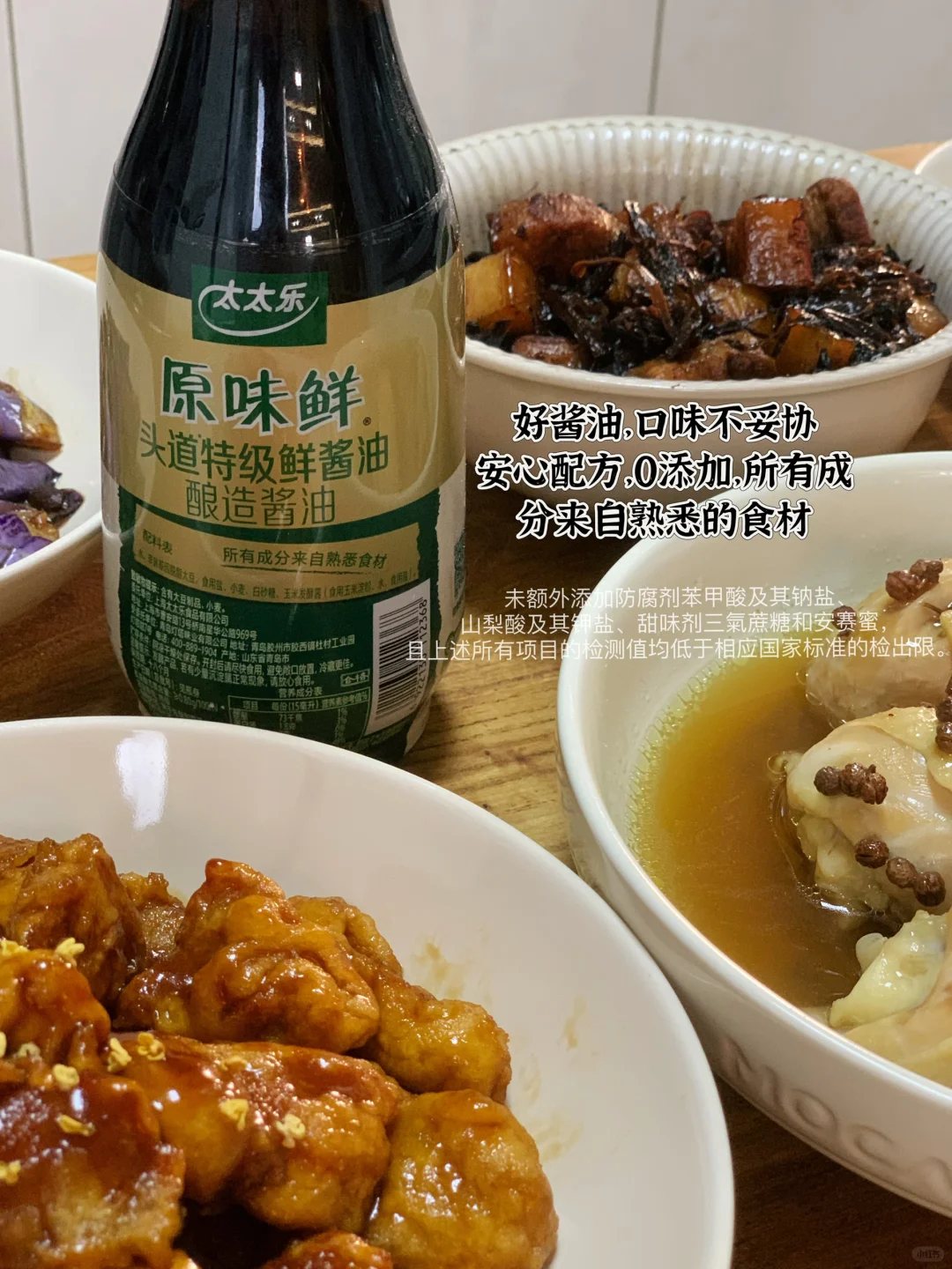 美味的酱汁好吃的0添加酱油-太太乐原味鲜,配料表简洁,0添加,所有成分来自熟悉食材,大豆、小麦、玉米酿造的3重鲜美,不止咸鲜,口味丰富有层次感。做浓油赤酱的江浙菜也太合适了,味道直接提升一个level。