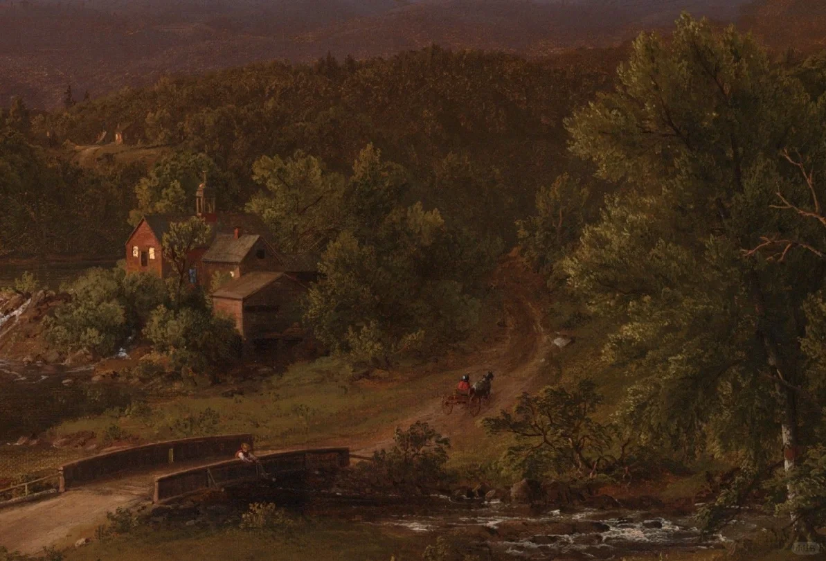 牛、锯木厂、桥梁、马车、房屋人烟与自然和谐共存,高耸入云的山峰处在这种耕作的范围之外,但又不显得打扰其自然美景。