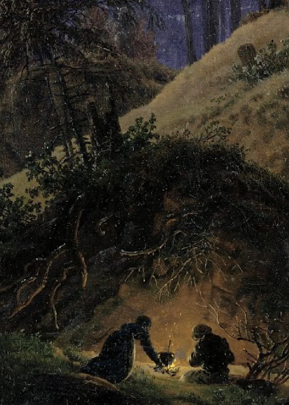 在这里,在土堆和树桩之间,一个男人和一个女人在一个山洞里避难,点燃了温暖的火,他们正在准备一顿饭。夜间森林景观的神秘气氛暗示着一种宗教解释。