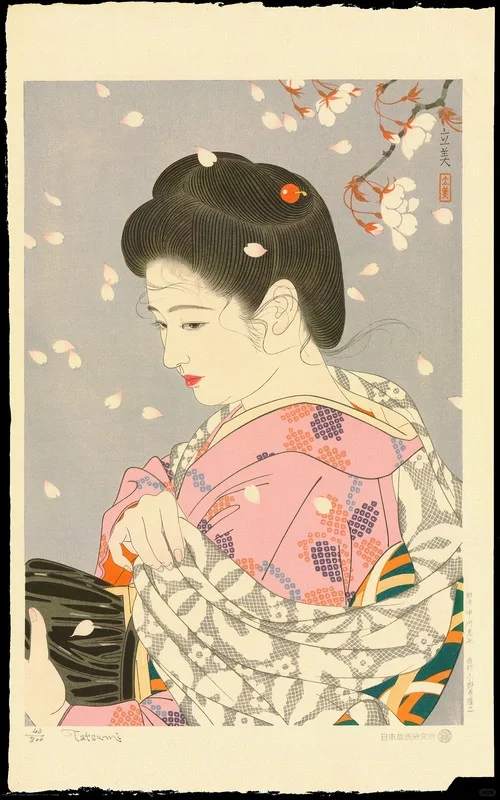 🌸 落樱花的细节,1953年 日本,志村達美 “花吹雪”(“樱花雨”)。来自“现代美人风俗五类”(“现代美人风俗五类”)系列。一位美人在春风拂面的日子里整理她的披肩。樱花雨在她周围飞舞。 . . .