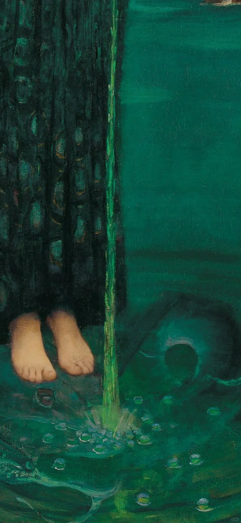 画中女巫直挺挺地站着,全神贯注地握着大容器,控制着液体的流动,她的体重和毒药被用来控制下面的仙女怪物。安格斯·特伦布尔观察到这个人物