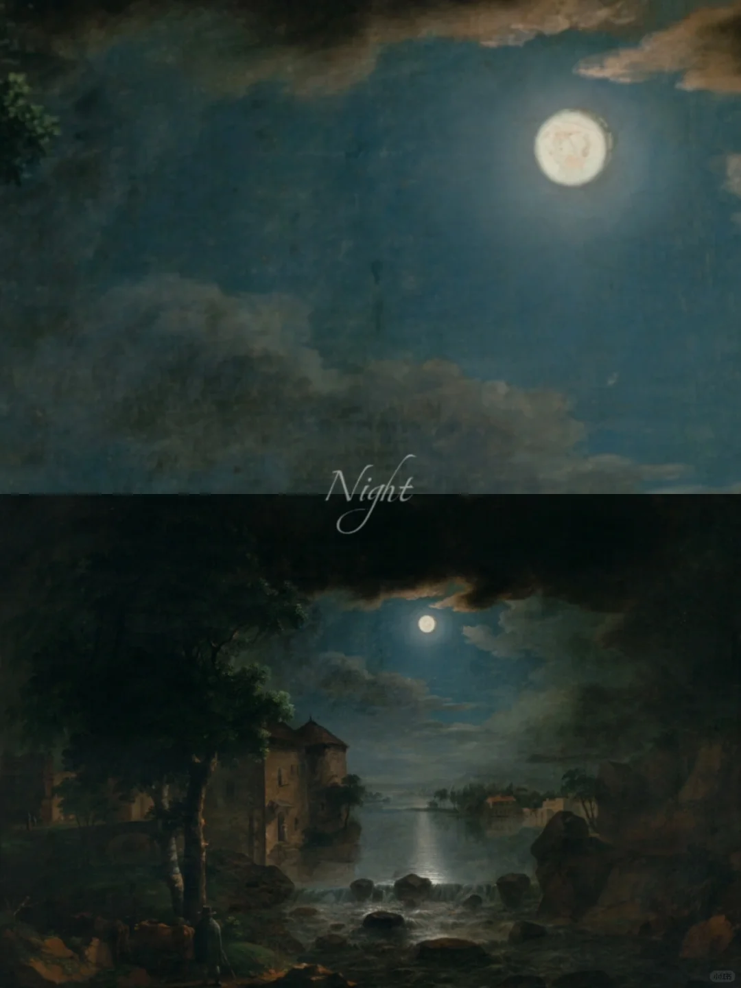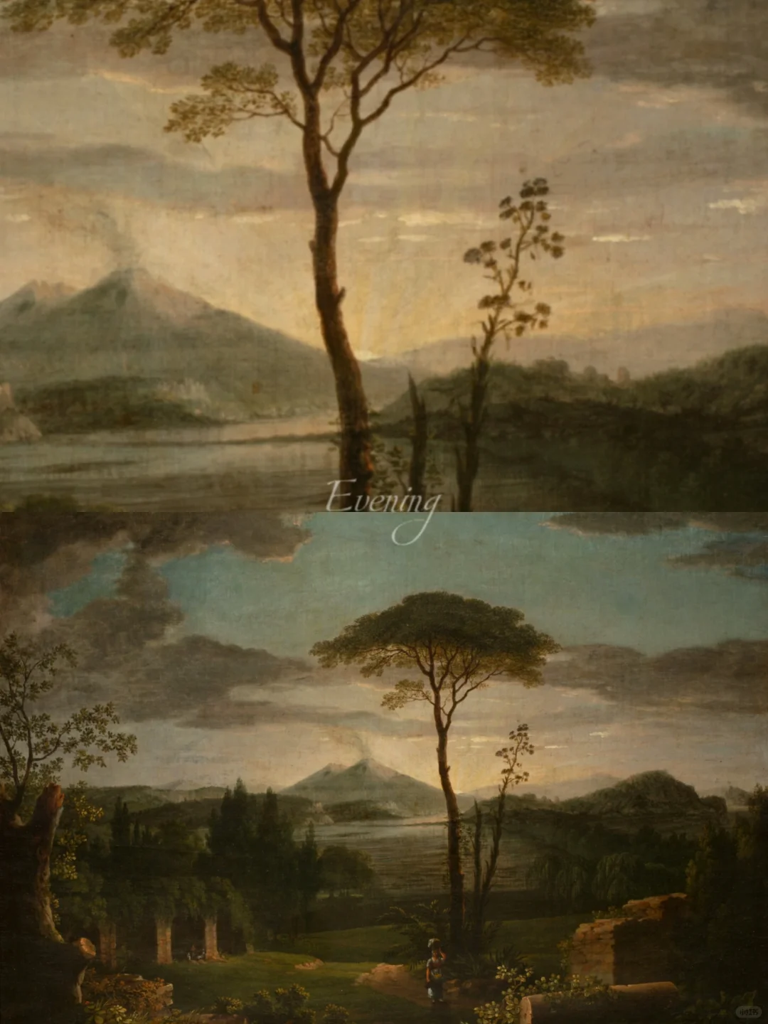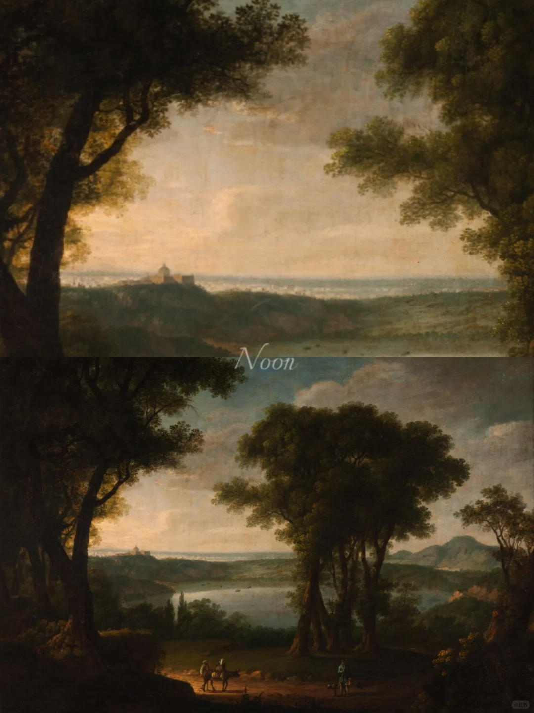 . Morning, Noon, Evening, Night from the cycle Four different moments of the day By Karel Postl 𓆩 ✧ 𓆪 ˚˙ 在四幅油画中,波斯特尔用色彩、光线和阴影唤起了日出时的清晨气氛,阿尔巴诺湖附近炎热的中午,背景是城堡和罗马的剪影,傍晚在维苏威火山下的乡村中长长的阴影,在最后的夜幕中,在满月的璀璨光芒下,结束了一天中美妙的四个时刻… . .