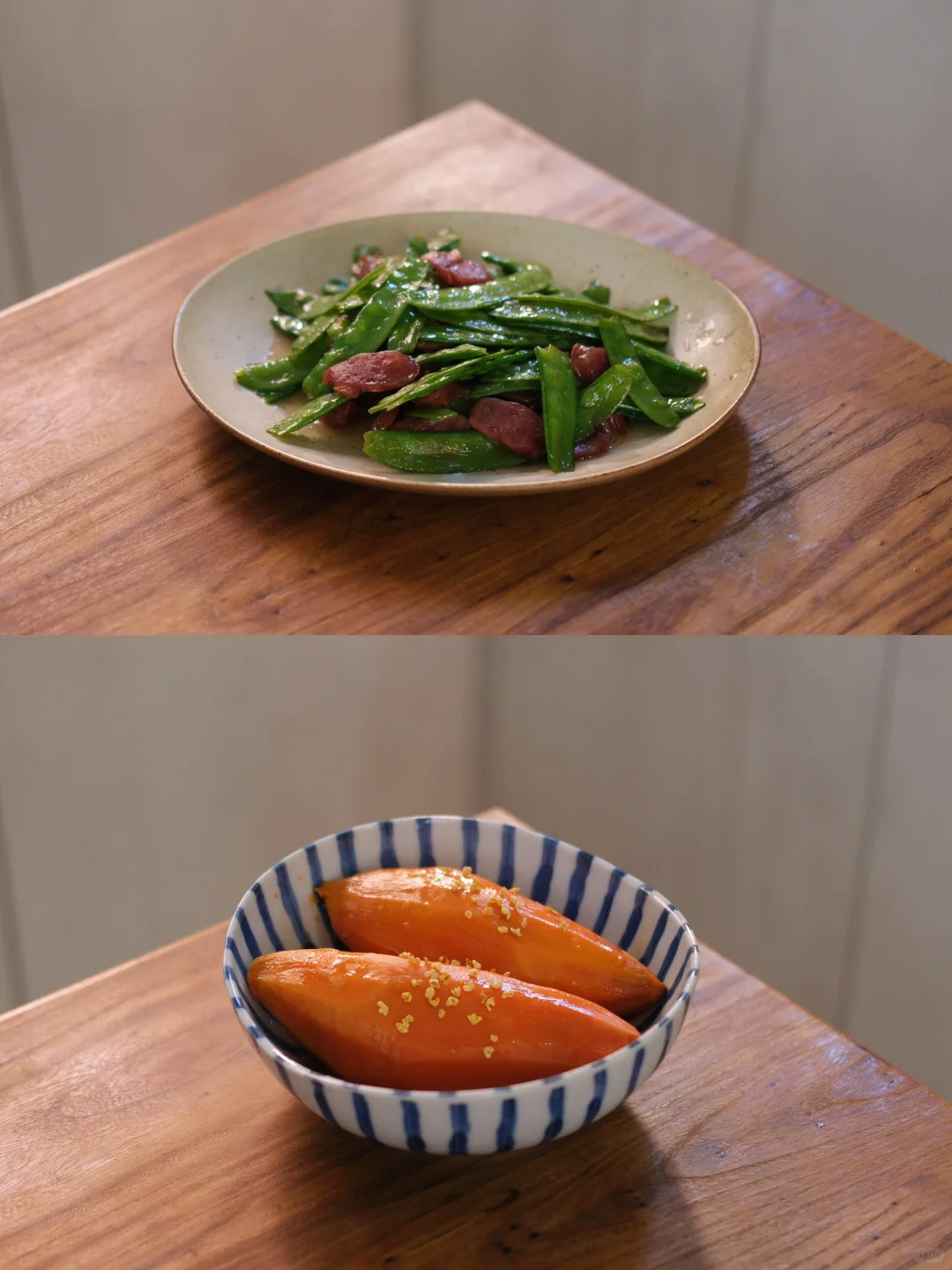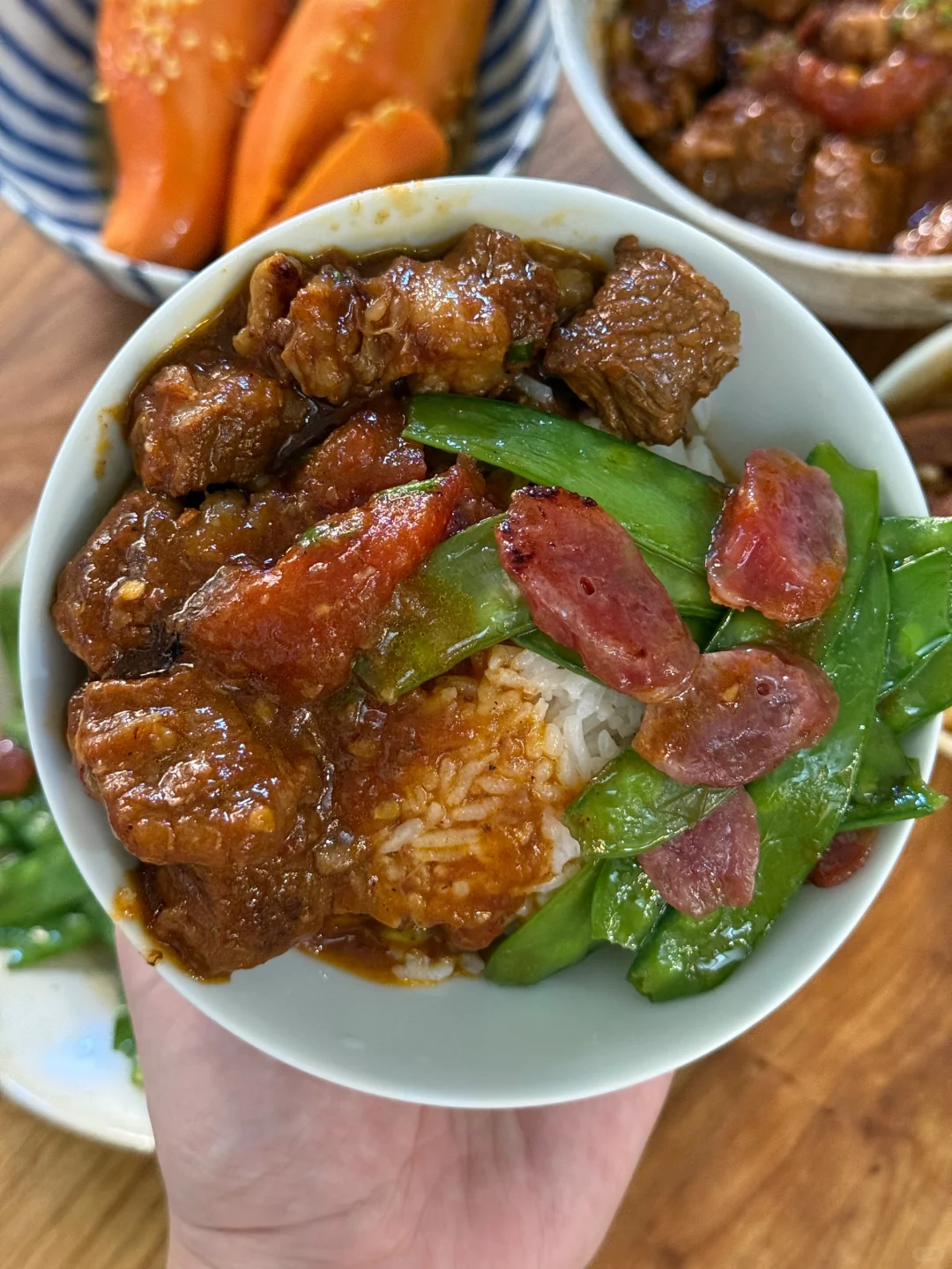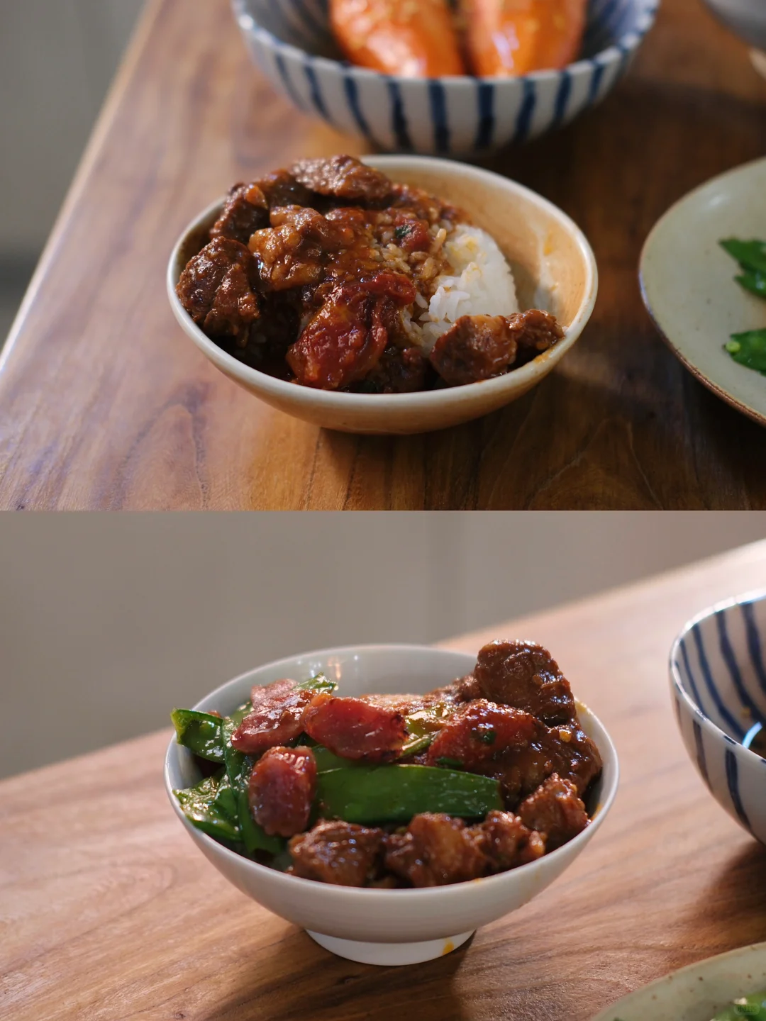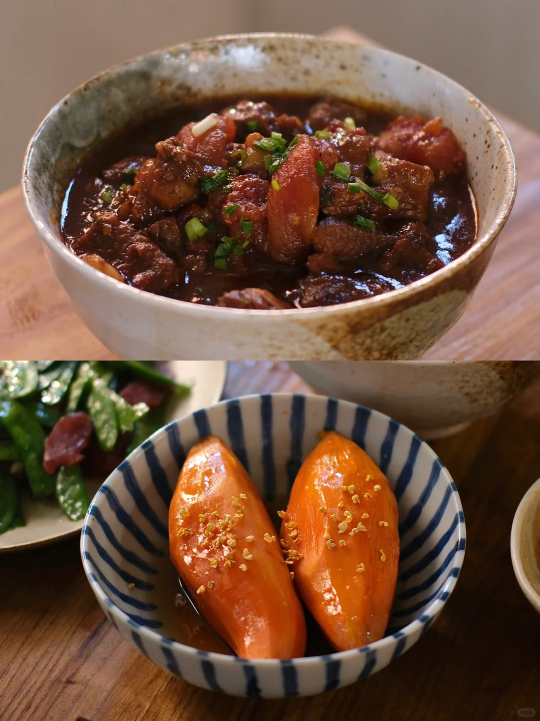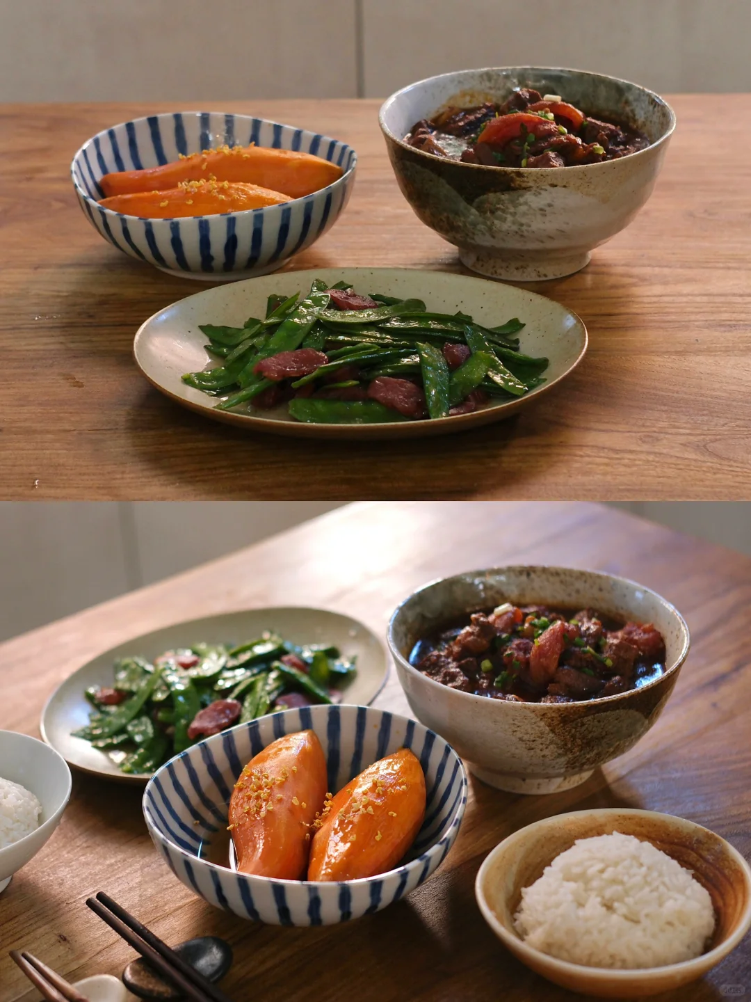 今日菜单: 1.番茄炖牛腩 2.荷兰豆炒腊肠 3.蜜汁红薯 两个人大约炖了1斤牛腩 牛腩炖的软烂入味,汤汁拌饭可太行了! 我的做法分享在图片上咯
