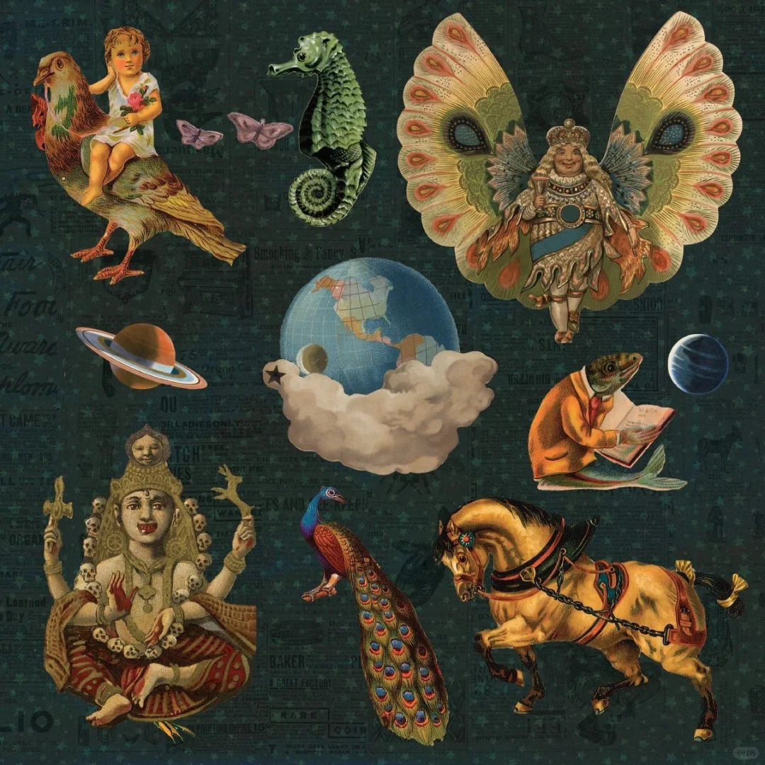 他还创作了专辑包装上的其他插图——抽着烟斗的动物、有面孔的天体、在怪异的梦境中漫步的任性孩子——所有这些都带有一种隐约的奇怪古董气质