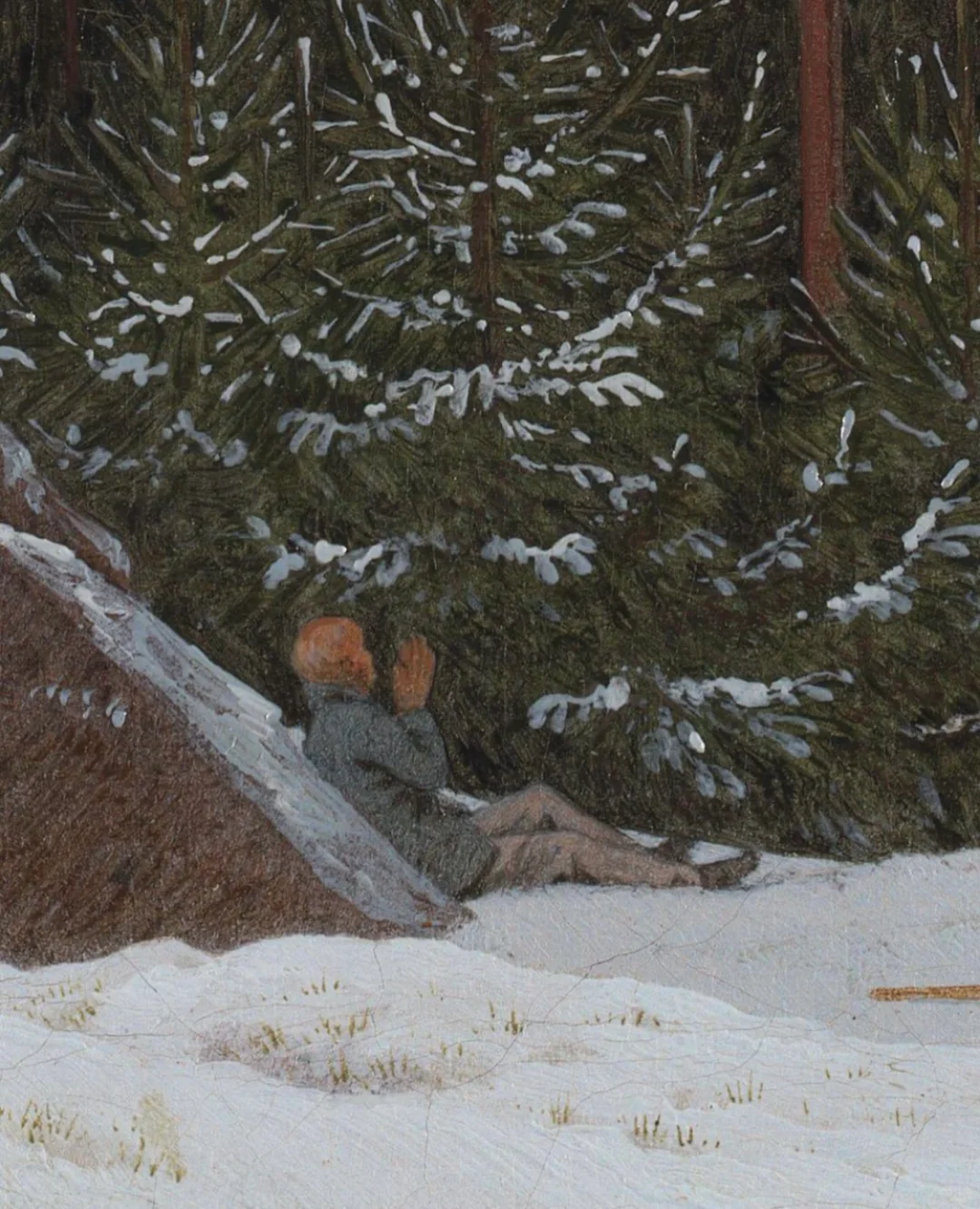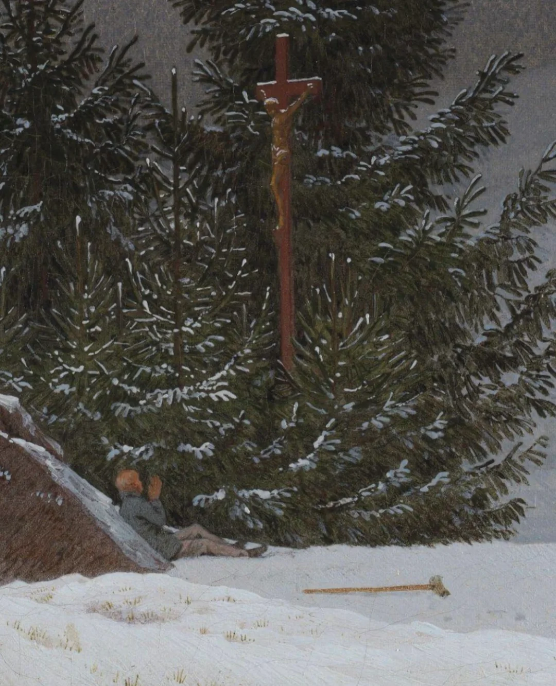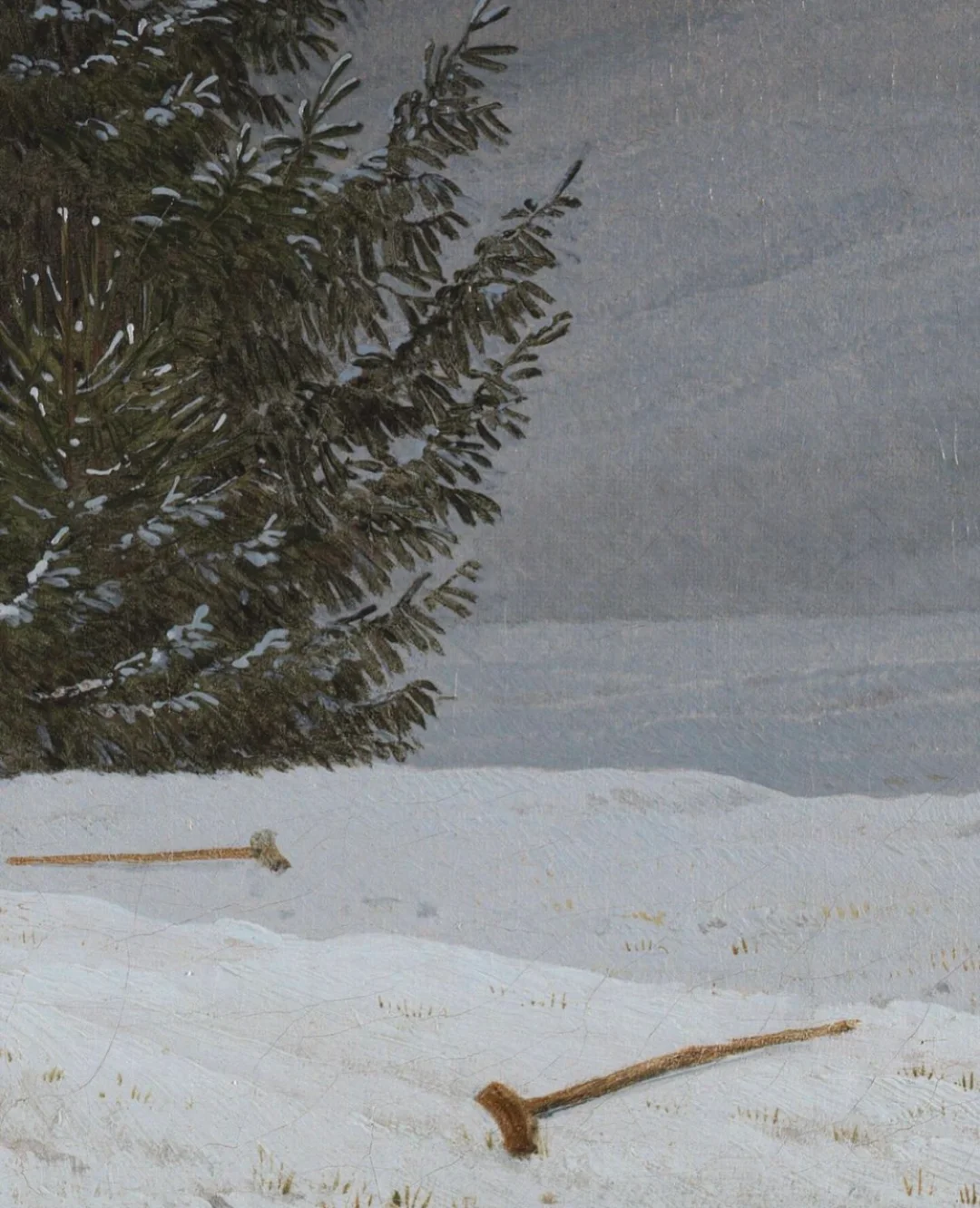 弗里德里希于 1811 年在魏玛首次展出《冬日风景》,在这张画作中,一个拄着拐杖的小人凝视着白雪覆盖的平原。他周围是枯死或濒死的橡树的粗糙树干,被砍伐的树桩一直延伸到远处。但这幅画的无情荒凉与现在在伦敦的同类画作形成了鲜明的对比。