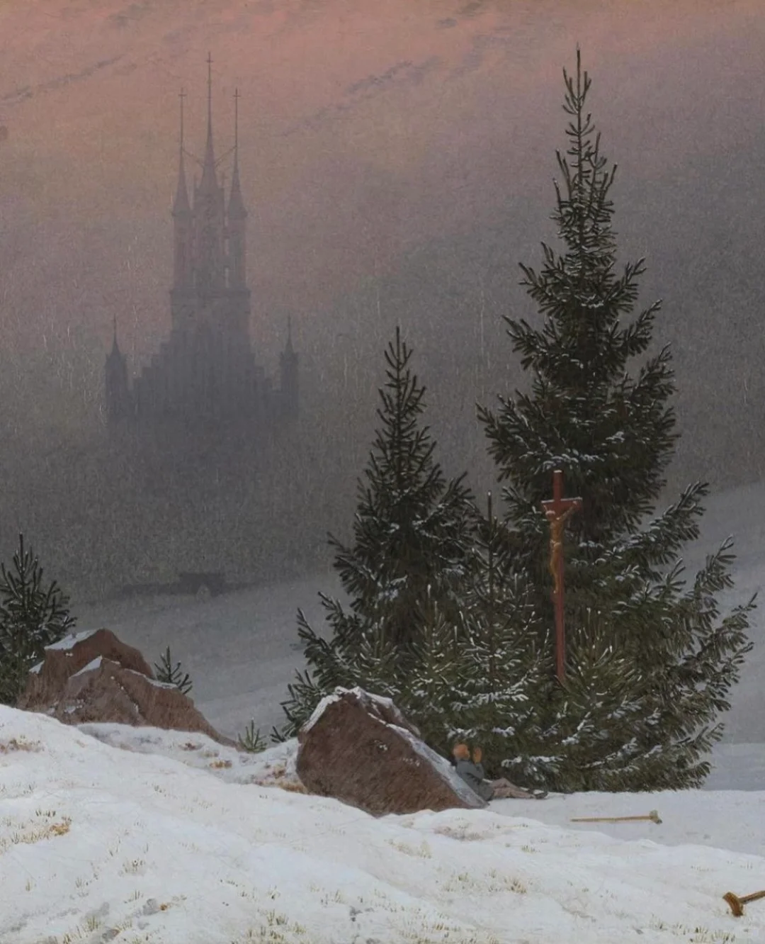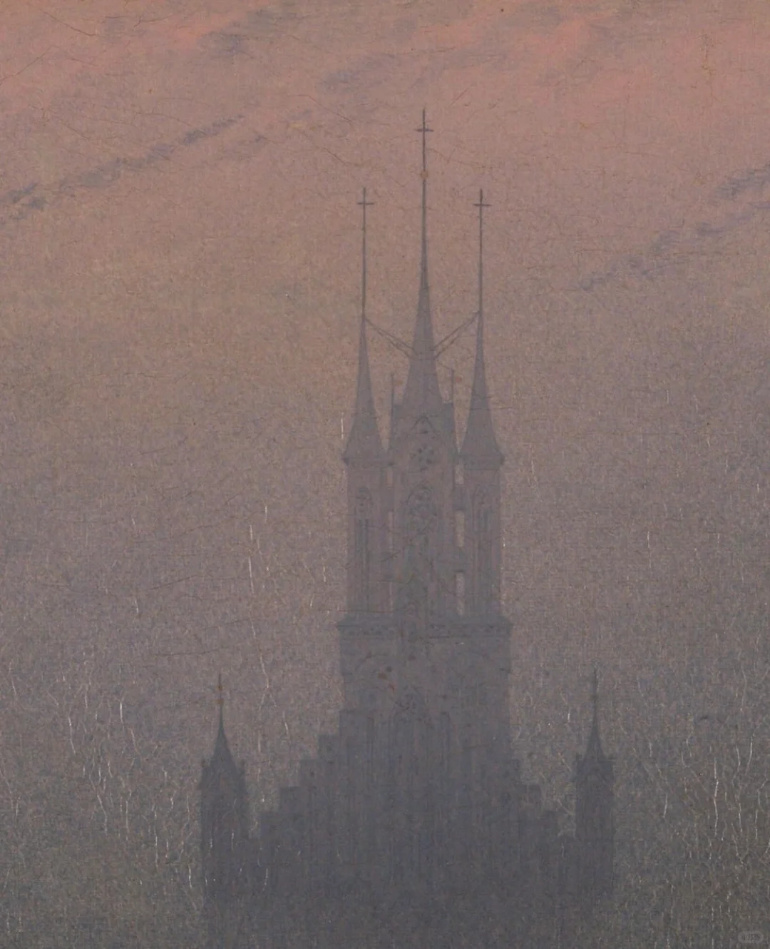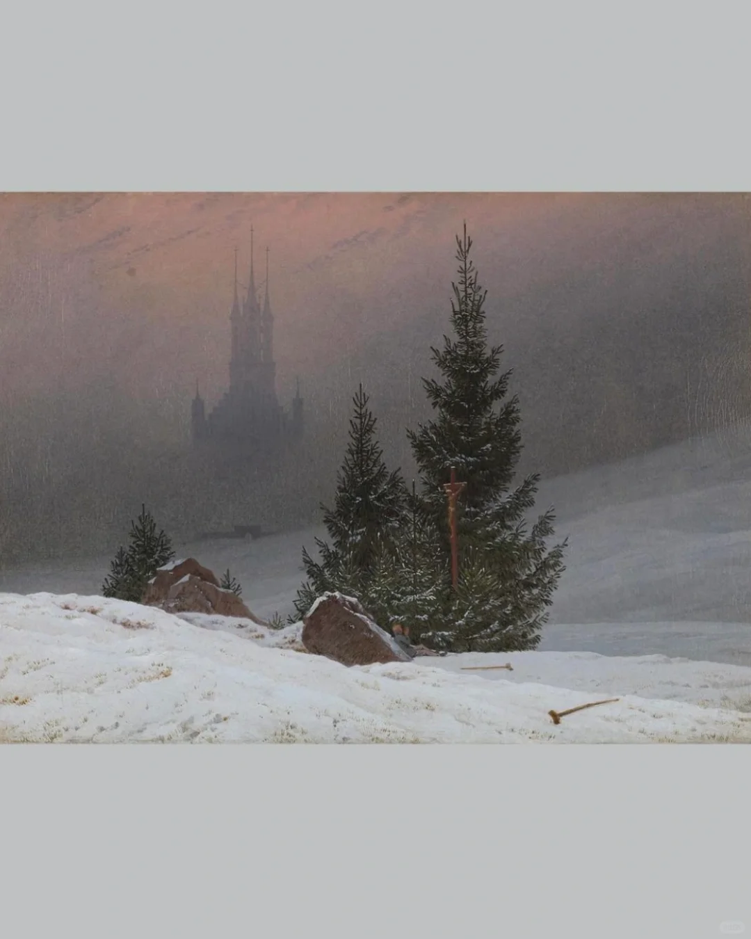 地平线上,一座哥特式教堂的正面和尖顶,其轮廓与冷杉的轮廓相呼应,像一道从雾霭中升起的幻影。草芽从雪中冒出来,天空中闪烁着黎明的光芒。