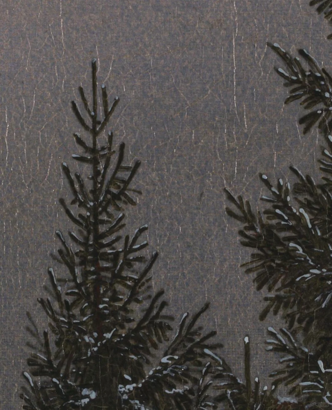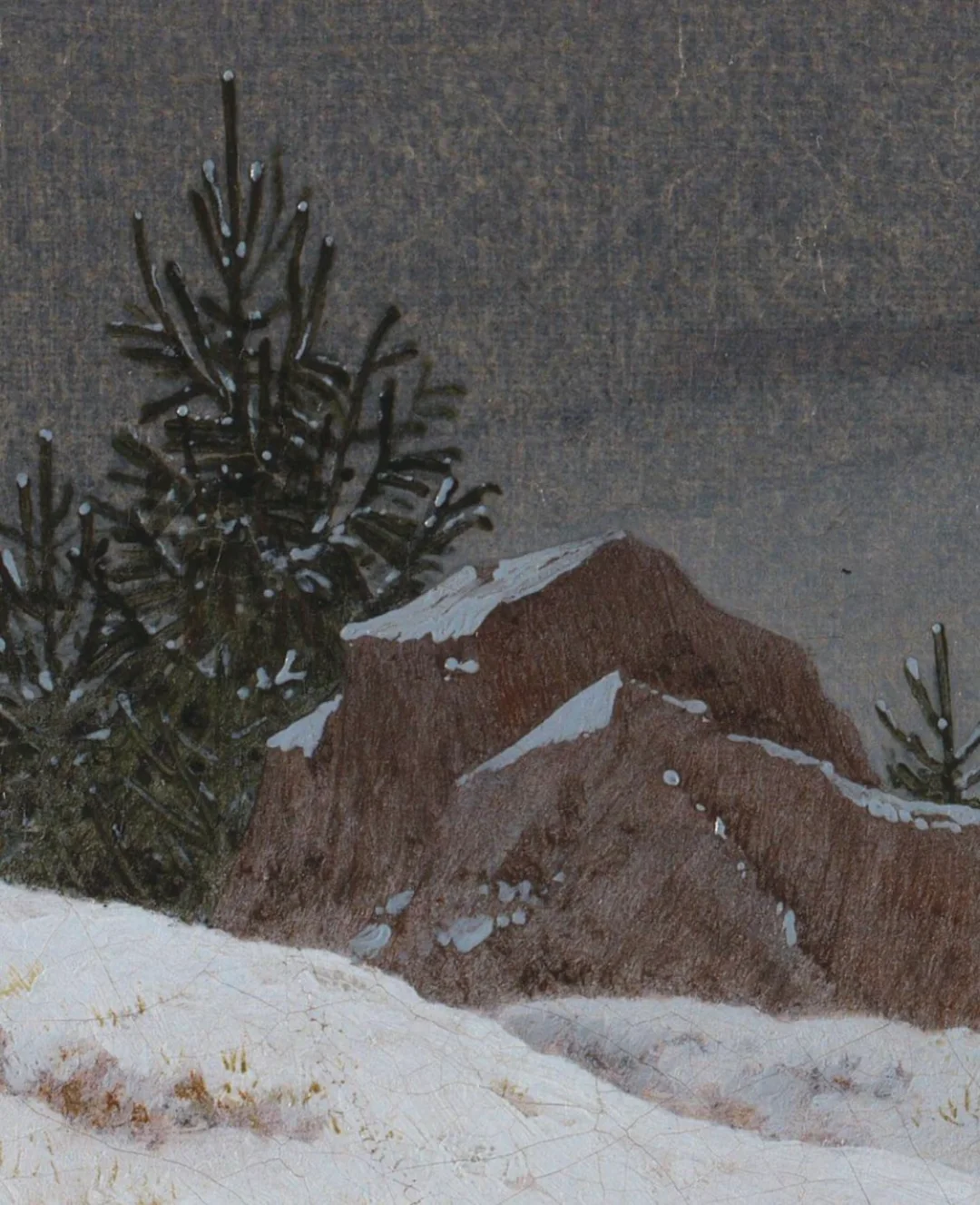 《冬日风景》用料出奇地少,表明弗里德里希对色彩的兴趣远不及对平滑渐变的色调。他用画笔的尖端小心地点画,使用一种在油性介质中透明的smalt实现了闪闪发光、透明雾霾的奇妙效果。