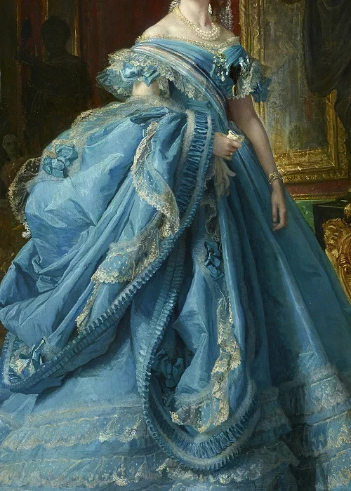 服装特点:18世纪初,女性的服装使用鲸须等硬质材料制成的裙撑来塑造宽大的裙摆,在臀部位置夸张化,腰部则被紧紧束起,强调细腰。