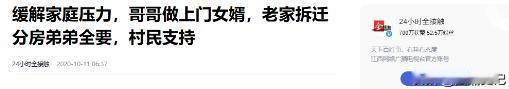 江苏, 一哥哥因家穷,在别人家当了上门女婿。几十年后,弟弟拆迁分了6套房子,哥哥对弟弟说:“我给你5万,你卖一套房子给我吧!”弟弟认为,哥哥已经“嫁”出去,没资格分房子,后来,哥哥一纸诉状将弟弟起诉到法院,结果出乎所有人意料。 (信息来源:原文登载于江西卫视《24小时全接触》节目在2020年10月11日关于《缓解家庭压力,哥哥做上门女婿,老家拆迁分房弟弟全要,村民支持》的报道。) 江苏徐州一场官司让原本寂静的小镇议论纷纷。原告胡长顺被告胡长玲,竟是一对亲兄弟。而让他们对簿公堂的是6套拆迁安置房的归属。 究竟是什么样的矛盾,让这对曾经相依为命的兄弟走到了这一步? 时间回到上世纪80年代,胡家是村里有名的贫困户。母亲在生下兄弟俩后选择了离开,留下年幼的他们和体弱的父亲相依为命。 为了撑起这个家哥哥胡长顺在25岁那年做出了一个令人心酸的决定——入赘到邻村的一户人家,成为人们口中的“上门女婿”。 胡长顺的“牺牲”为弟弟胡长玲换来了成家的机会。胡家也用这笔“彩礼钱”翻新了祖宅生活渐渐有了起色。 胡长顺虽然“嫁”了出去,但心里始终牵挂着这个家。父亲生病他四处筹钱;父亲去世他主动承担丧葬费。在他看来血浓于水,自己所做的一切都是应该的。 然而命运弄人。随着时代变迁,胡长玲所在的村子迎来拆迁,每户人家都能分到6套安置房。这突如其来的财富却成了兄弟俩反目的导火索。 胡长顺的大儿子即将结婚,婚房成了头等大事。看着弟弟即将拥有6套房产,胡长顺鼓起勇气,提出想以5万元的价格购买其中一套。 在他看来这个价格已经低到不能再低,更何况自己曾经为这个家付出过那么多。 然而胡长玲却一口回绝。他搬出农村的传统观念:“嫁出去的儿子泼出去的水”,认为哥哥已经不是胡家人没有资格再分家产。 更何况房子是建在自己名下的,哥哥没有出力凭什么要分走? 昔日的兄弟情谊在利益面前显得如此不堪一击。胡长顺的心寒了,他无法接受弟弟的冷漠和绝情,更无法理解曾经的付出为何换来如此结果。 万般无奈之下胡长顺选择了拿起法律武器,维护自己的权益。 法院受理了这起案件,法官面对着这对兄弟深知这不仅仅是一场财产纠纷,更是亲情的考验。 《民法典》第1126条规定继承权男女平等,上门女婿的身份并不影响其继承权。 也就是说胡长顺作为胡家的儿子,有权继承父亲的遗产。然而房子是胡长玲名下,他也有权处置自己的财产。 法律与情理的交织,让这起案件的审理变得格外复杂。最终法官选择了庭外调解的方式,希望能够修复这段破裂的兄弟情。 调解过程中法官从情理和法理两方面入手,引导兄弟二人回忆往昔的点点滴滴,思考亲情的可贵。 最终在法官的耐心劝说下双方各退一步,胡长顺以10万元的价格买下了一套房产。 这起案件最终以和解告终。但它留给人们的思考却远远没有结束。 在利益面前亲情是否真的不堪一击?法律和习俗的碰撞又该如何平衡? 或许这世上并没有绝对的公平,但我们至少可以选择不让金钱蒙蔽了双眼,不让利益吞噬了亲情。毕竟金钱有价亲情无价。