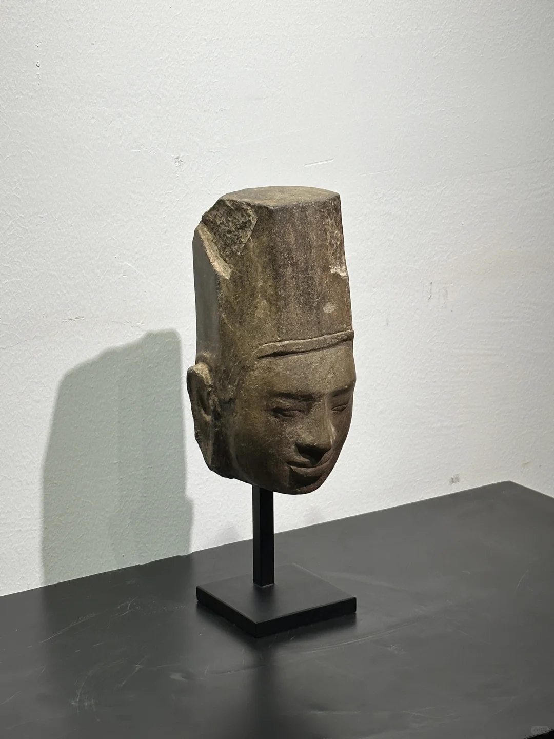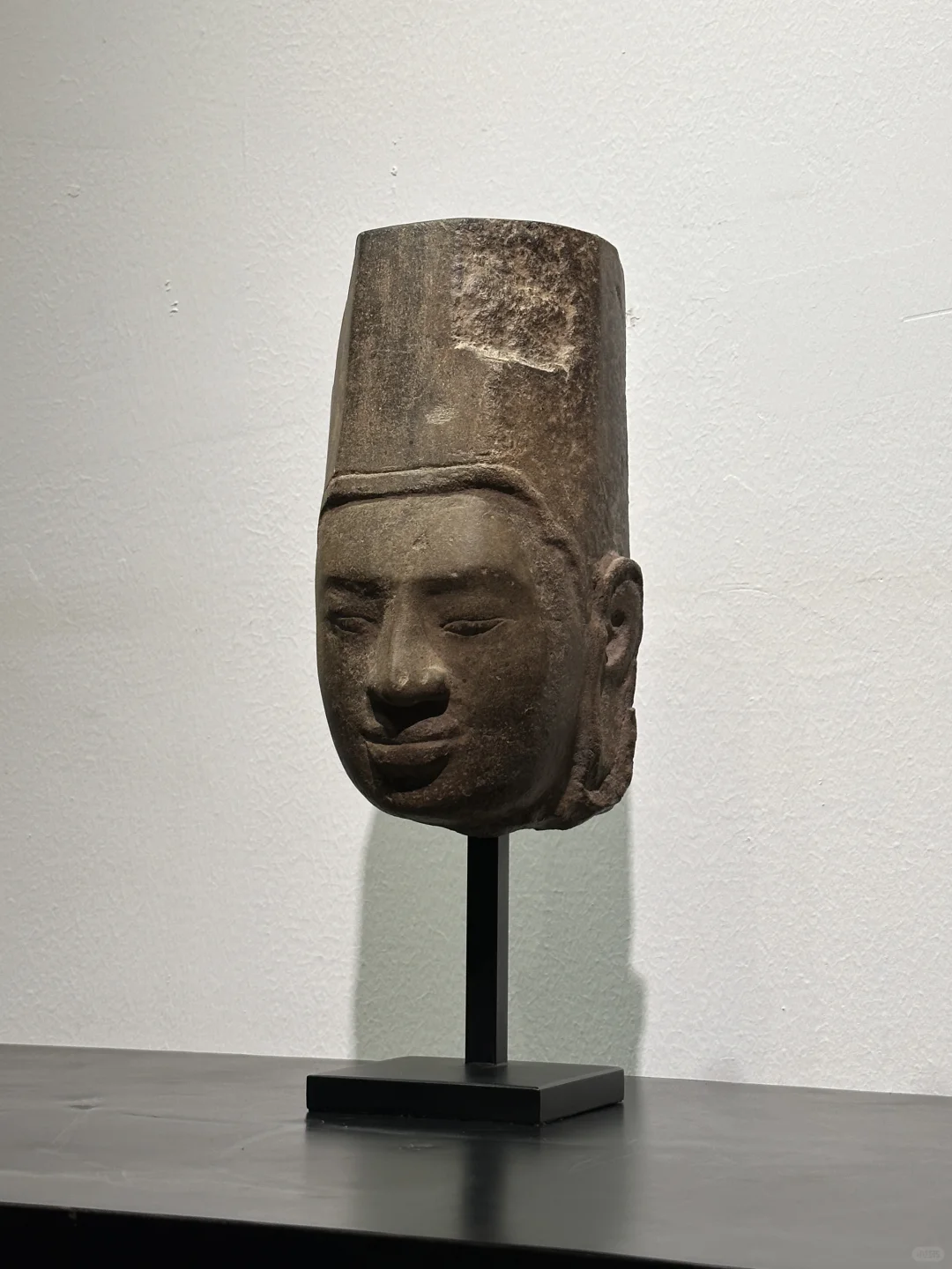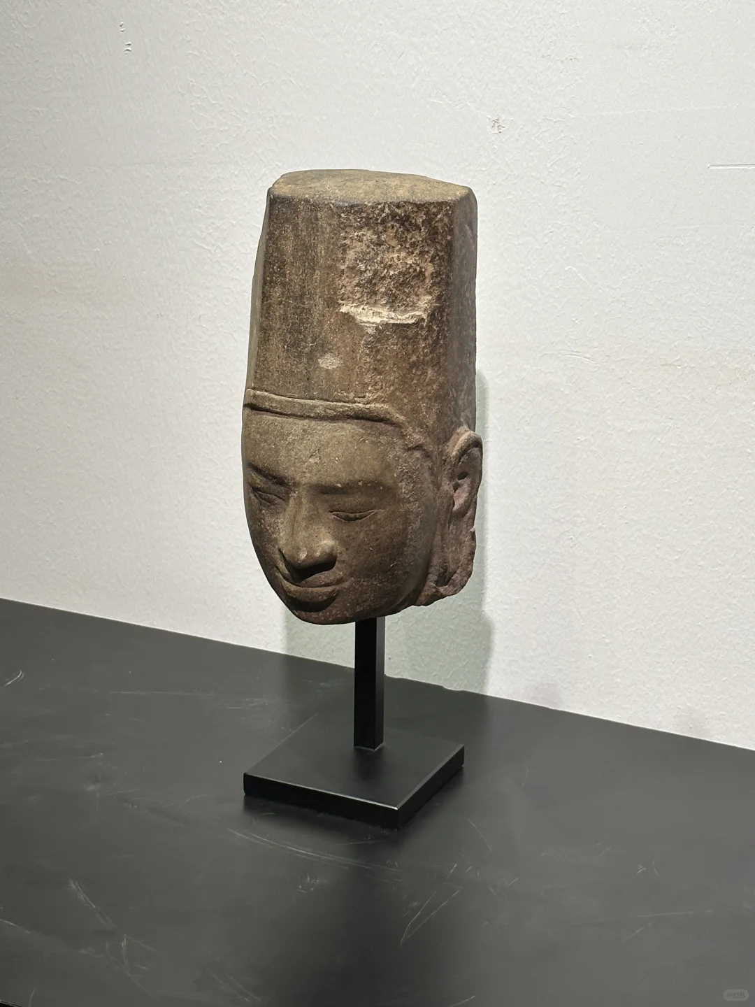 高棉7-8世纪 Pre Angkor前吴哥时期 毗湿奴头像 非常值得一提的是这件前吴哥风格毗湿奴的帽子并不是和往常的圆柱状一样,而是有转折的,石头材质以及精致的打磨都向我们证明了其等级之高。 高度:31.5cm 净高:21cm 头围:39cm