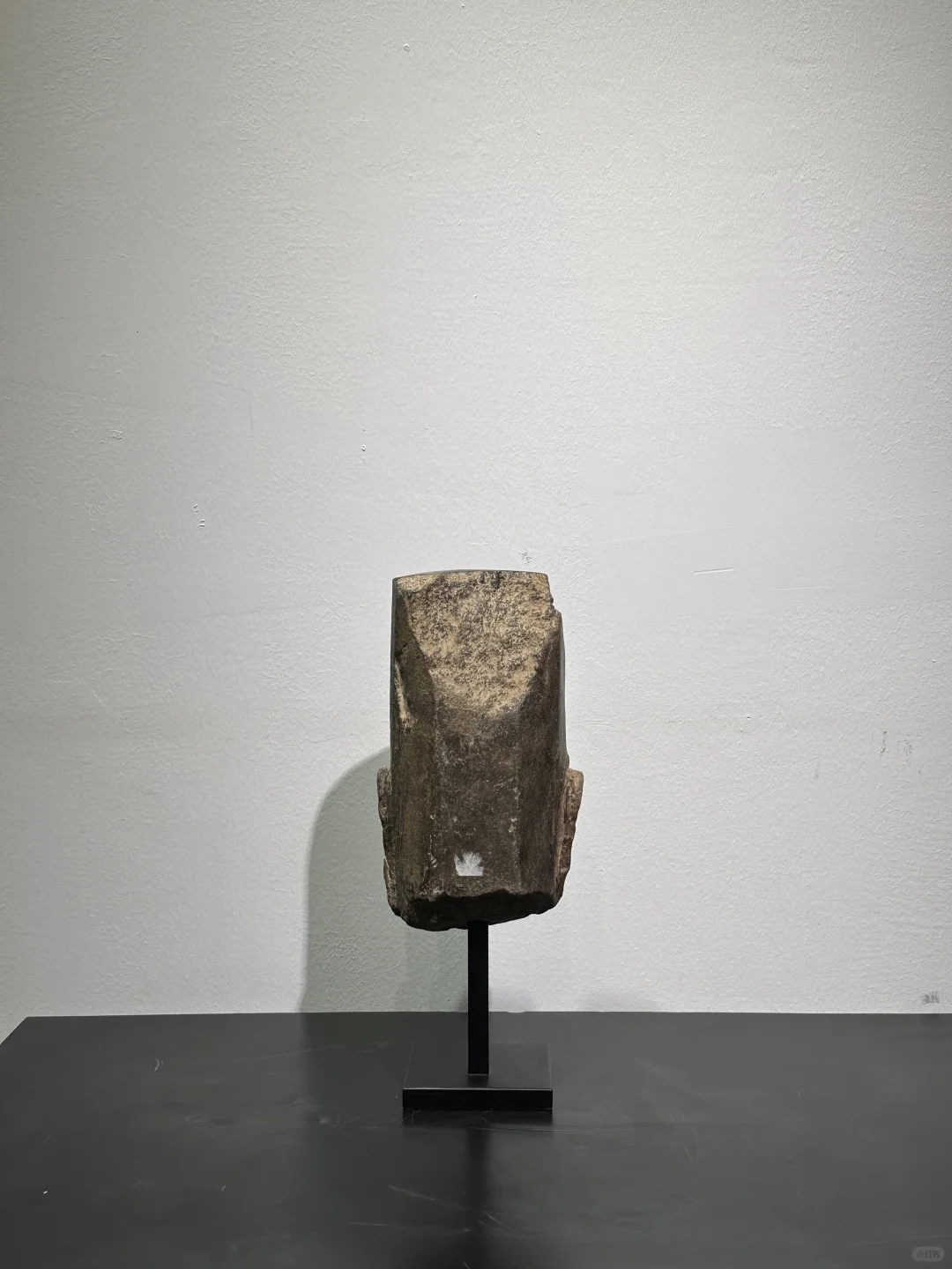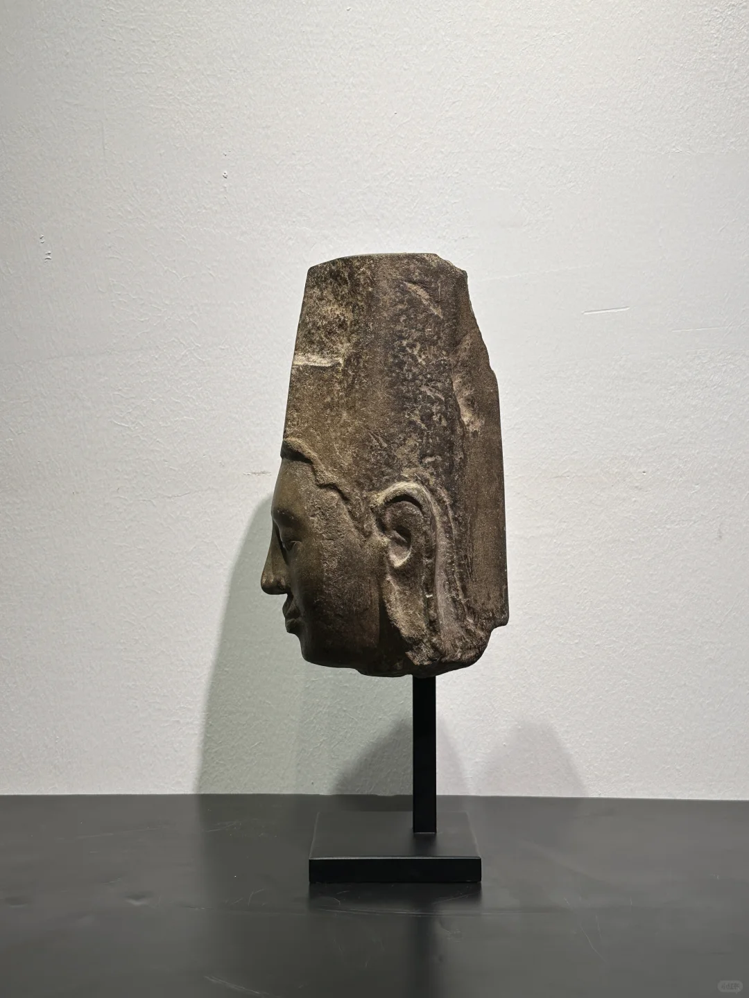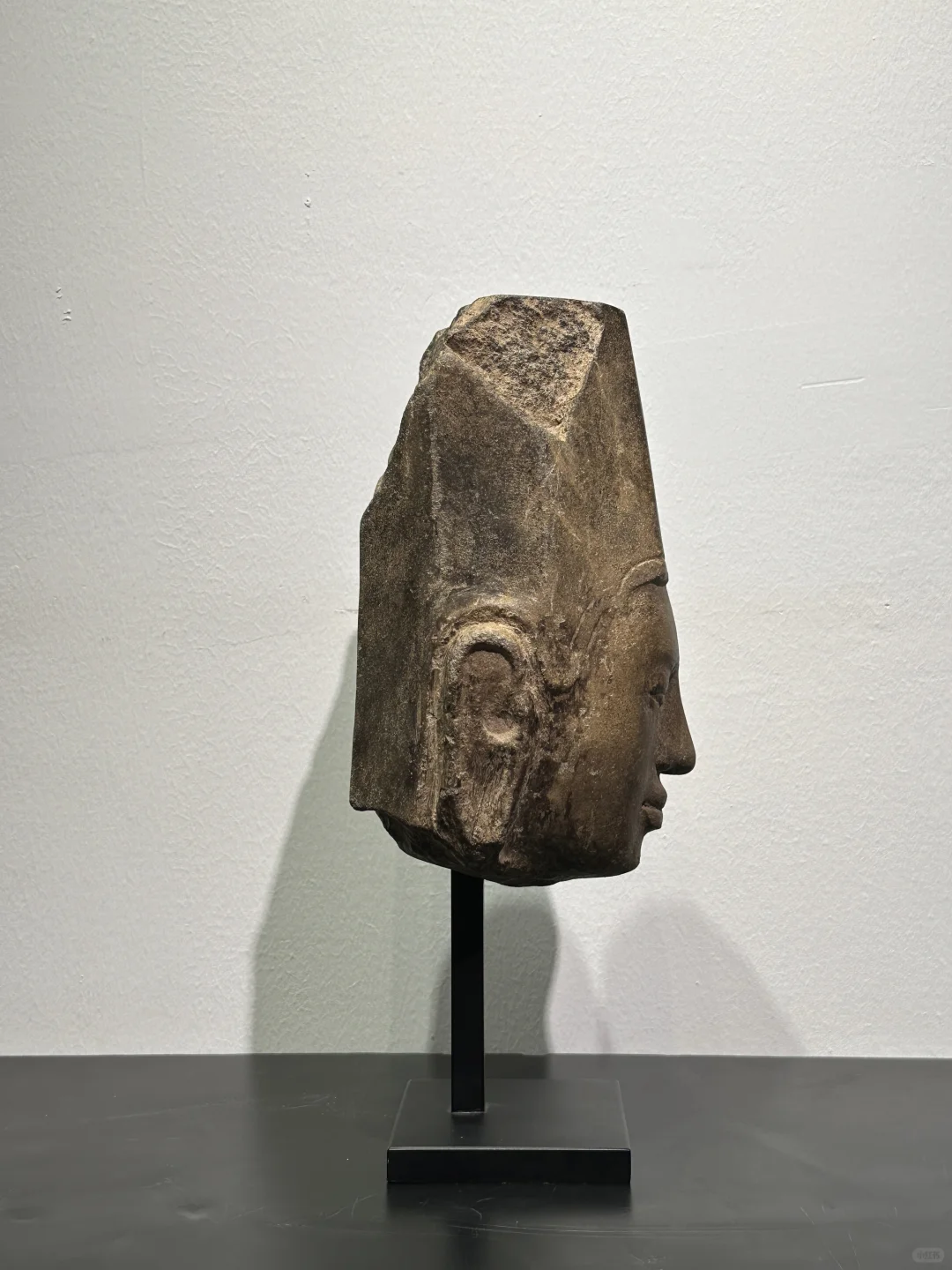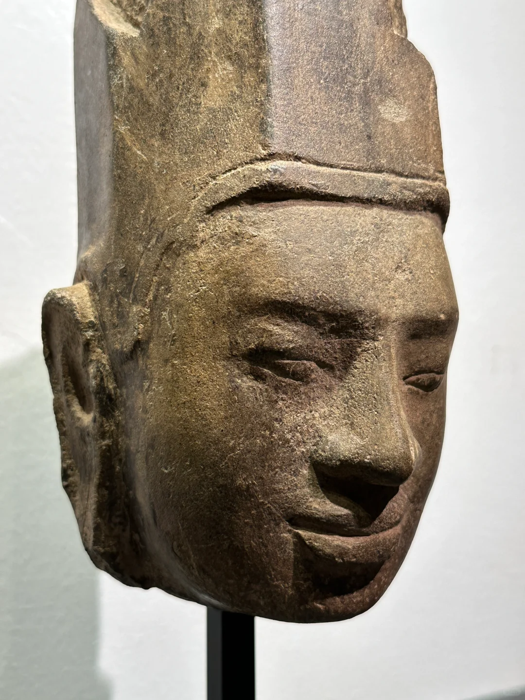 高棉7-8世纪 Pre Angkor前吴哥时期 毗湿奴头像 非常值得一提的是这件前吴哥风格毗湿奴的帽子并不是和往常的圆柱状一样,而是有转折的,石头材质以及精致的打磨都向我们证明了其等级之高。 高度:31.5cm 净高:21cm 头围:39cm