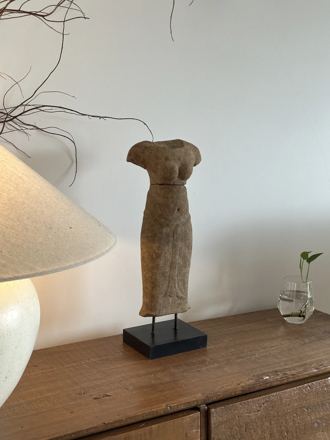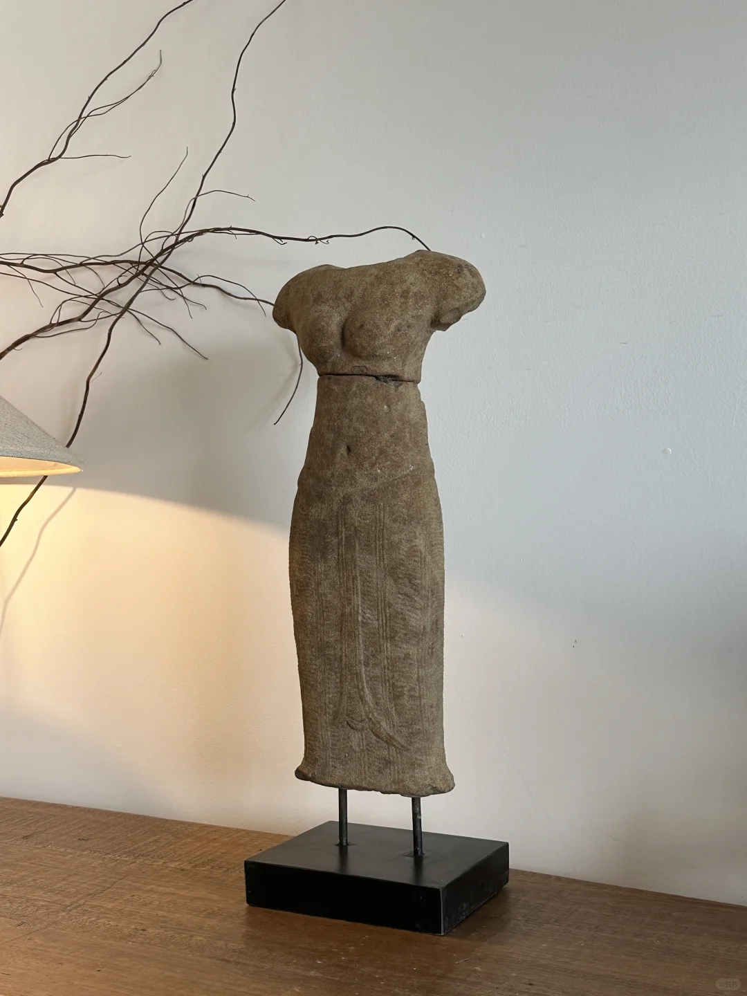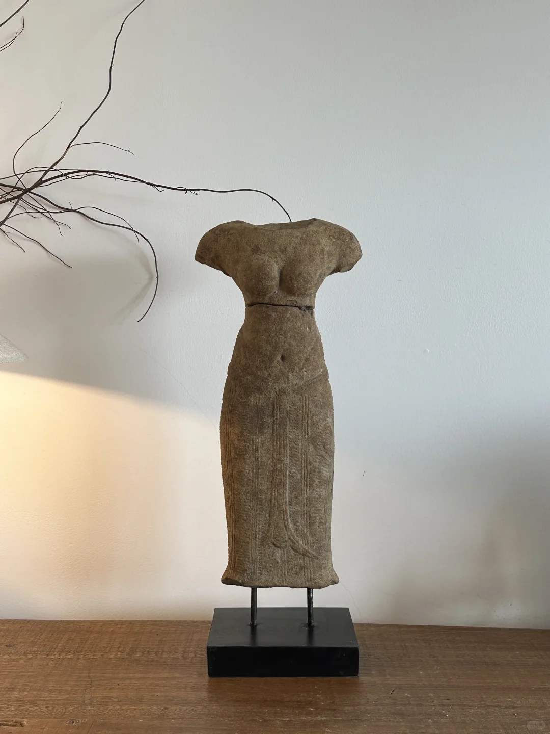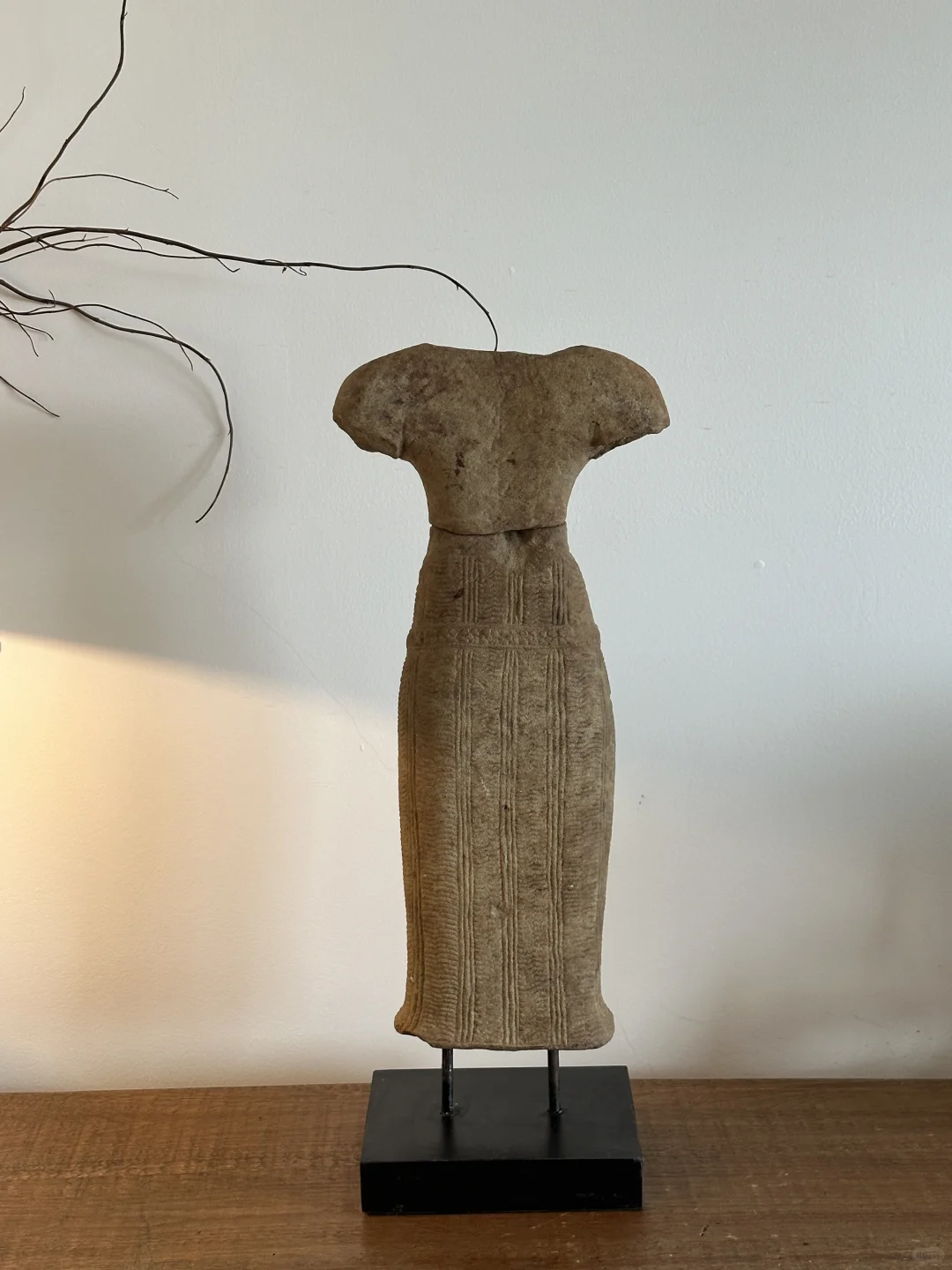 高棉11世纪晚期 Baphuon巴普昂寺风格 Uma躯干 不同寻常的桑波特展示了一种我认为很少见的装饰图案,这是我第一次在女性雕塑中看到它,图11展示了男性雕塑中如何使用这种图案。是我见过的三个雕塑之一,另一个在拉奇福德收藏中。这两件作品都可能在11世纪晚期(Baphuon晚期风格,过渡到吴哥窟风格)大约925年。 高度:45.5cm 净高:38cm