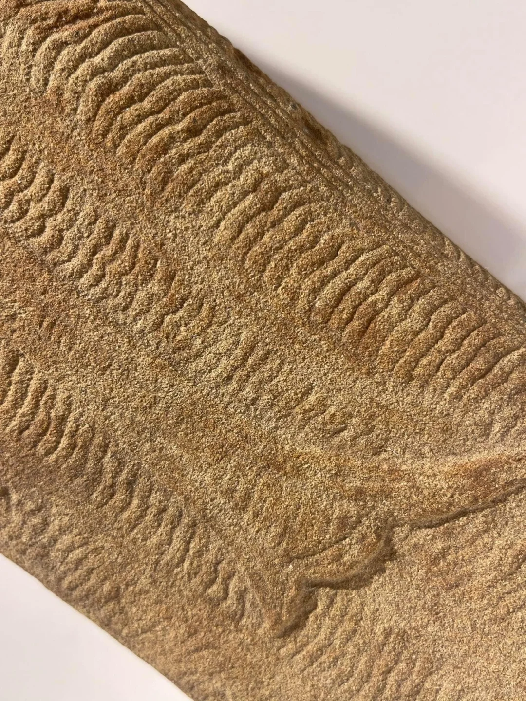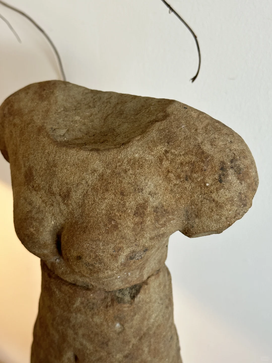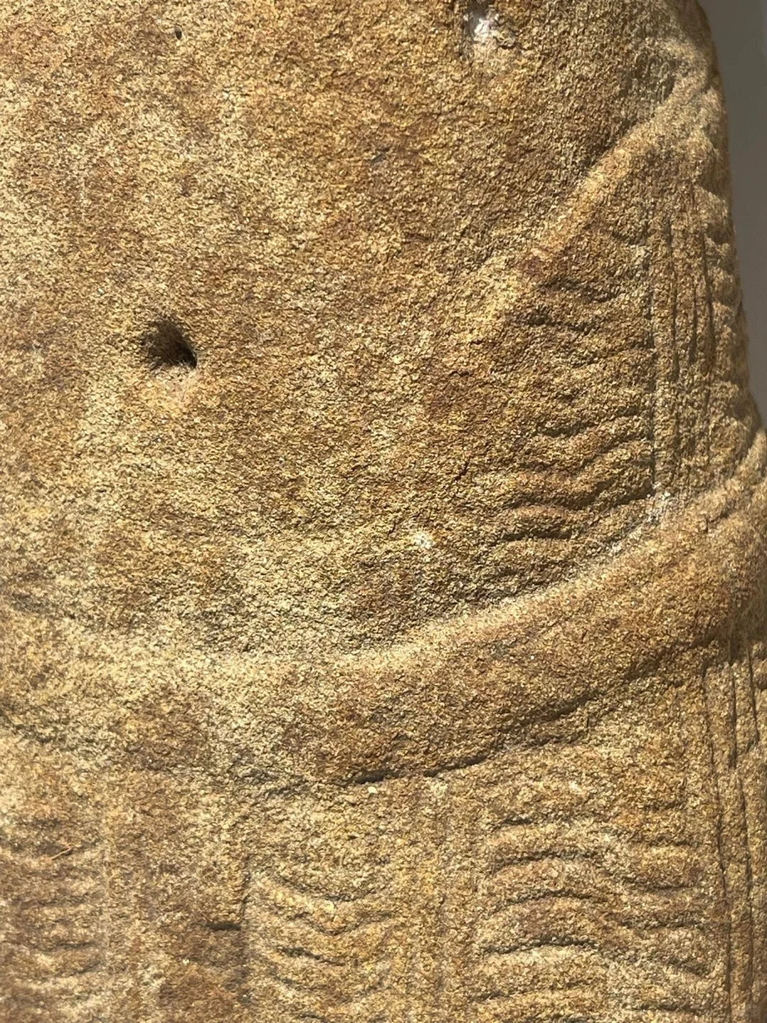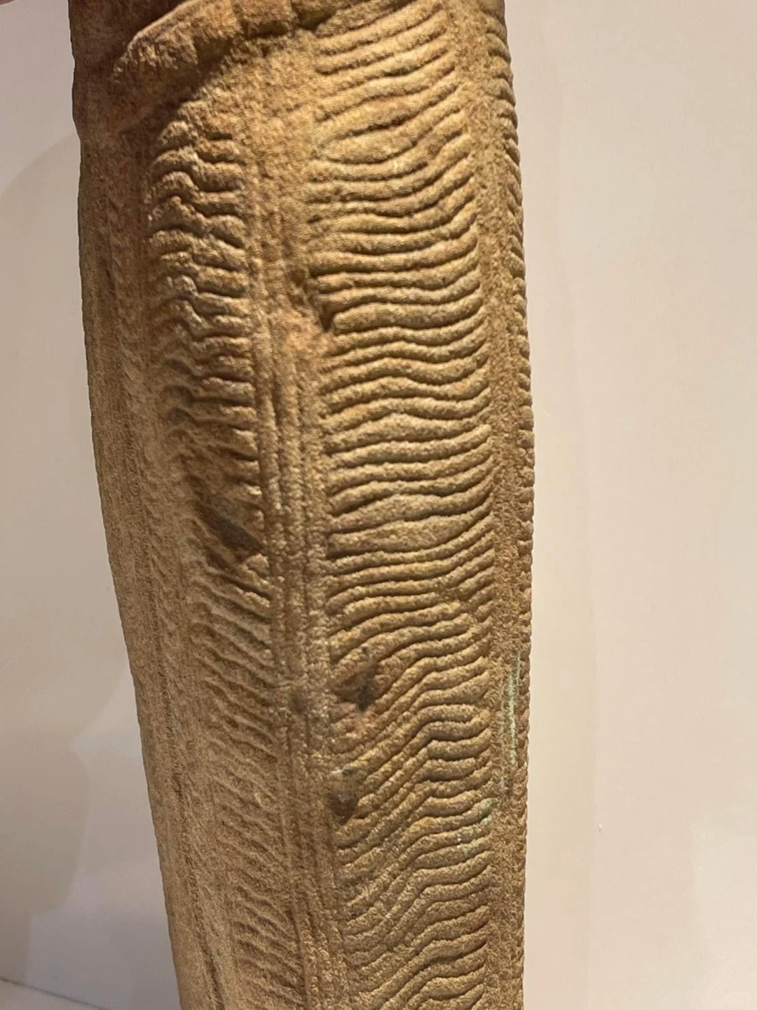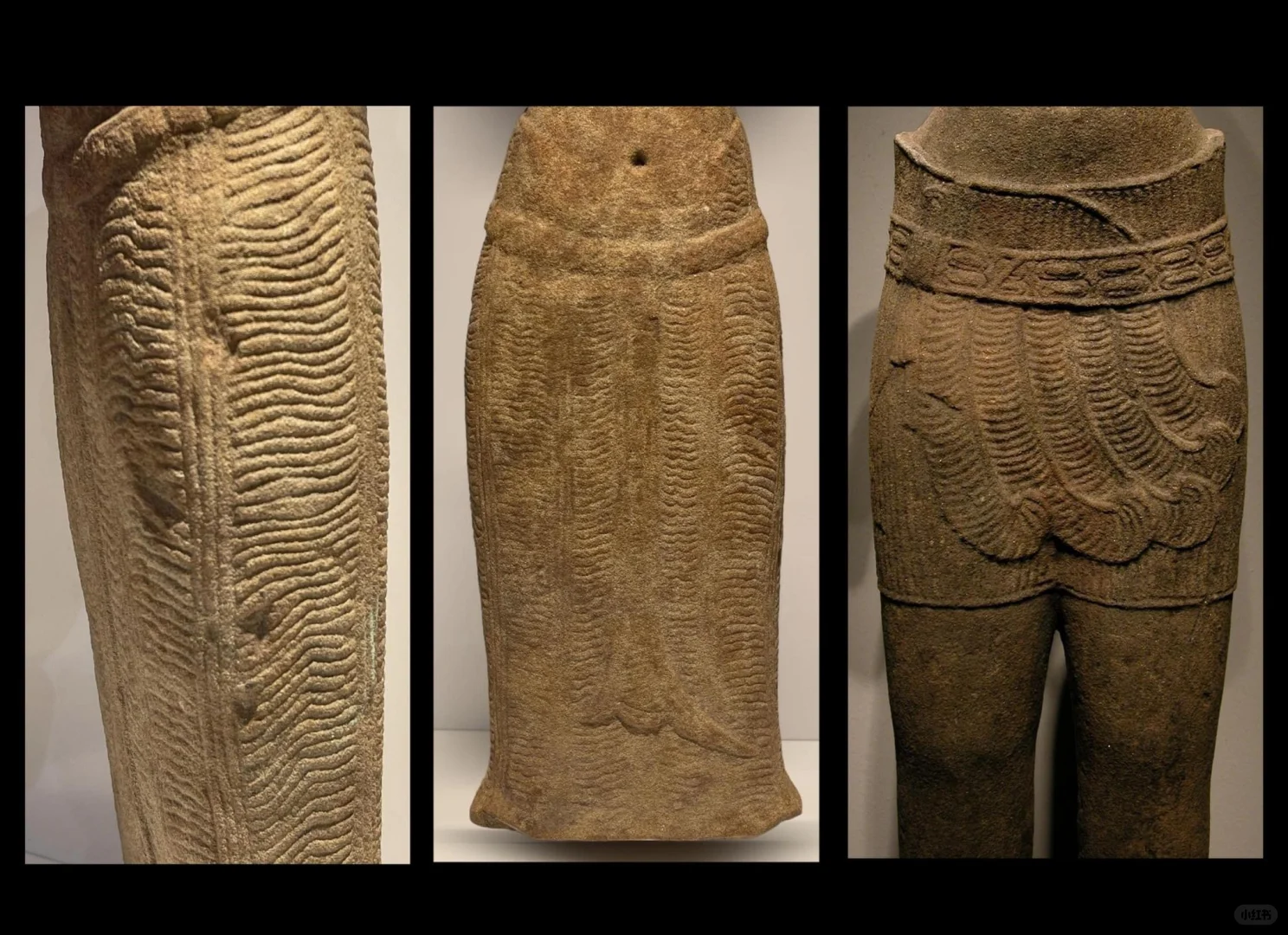 高棉11世纪晚期 Baphuon巴普昂寺风格 Uma躯干 不同寻常的桑波特展示了一种我认为很少见的装饰图案,这是我第一次在女性雕塑中看到它,图11展示了男性雕塑中如何使用这种图案。是我见过的三个雕塑之一,另一个在拉奇福德收藏中。这两件作品都可能在11世纪晚期(Baphuon晚期风格,过渡到吴哥窟风格)大约925年。 高度:45.5cm 净高:38cm