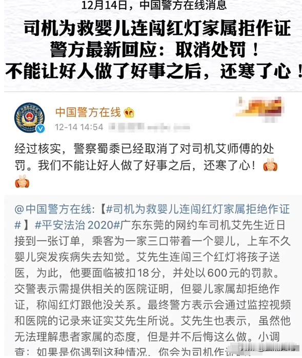广东东莞,网约车司机为救犯病婴儿连闯了三个红灯,被扣18分,还面临600元的罚款,事后婴儿家属却拒绝出面作证,且直言说:“我们又没让你闯红灯,你自己的事自己解决。”最后交警的做法亮了! (信息来源:原文登载于中国青年网在2020年12月15日关于《网约车司机为救婴儿被扣18分,家属却拒绝作证!最新回应来了》的报道。) “扣18分罚款600,还要重考科目一!”东莞的夏天天气闷热,艾师傅收到交警处罚短信的时候心里更堵得慌。他怎么也没想到,自己一时善心闯红灯送患儿去医院竟然会面临这么严重的后果。 事情还要从前一天下午说起。那天是2023年7月盛夏的一天下午1点40分,正是跑车的好时候。艾师傅照常开着网约车在路上,突然手机上跳出一条订单,目的地是东莞市人民医院。 乘客是一对年轻的父母,怀里抱着一个不到半岁的婴儿。一上车两人就满脸焦急,婴儿母亲更是带着哭腔说孩子生病了求艾师傅开快点。 艾师傅一看孩子面色苍白呼吸急促,情况确实不太好,便加大了油门。可偏偏路上红灯多,眼看着孩子开始吐白沫哭声越来越微弱,艾师傅顾不上那么多直接闯了红灯,并打电话给110报备了情况。 一路风驰电掣艾师傅终于把他们送到了医院。可还没等他缓口气,那对父母就抱着孩子冲进了医院连句谢谢都没说。 艾师傅当时也没多想只当人家心急,想着孩子平安就好,便继续接单去了。谁知第二天就收到了交警的处罚通知。 艾师傅赶紧跑到交警队说明情况,交警告诉他需要患儿家属提供医院证明,才能撤销处罚。 艾师傅赶紧联系孩子父母,谁知道对方一听就炸了,一口咬定艾师傅闯红灯跟他们没关系,还说要投诉艾师傅。 艾师傅顿时傻眼了,自己一片好心怎么就成了坏人了?没有家属的证明,难道自己就只能白白受罚吗? 无奈之下艾师傅只好向媒体求助。事件经过媒体报道后,迅速引发了网友热议。 一边是见义勇为的网约车司机,一边是冷漠无情的患儿家属,巨大的反差让网友们义愤填膺,纷纷指责家属忘恩负义,要求他们给艾师傅一个说法。 迫于舆论压力患儿家属最终还是提供了医院证明。东莞警方经过调查核实,也确认了艾师傅的说法最终取消了对他的处罚。 网约车平台得知此事后,也为艾师傅颁发了“见义勇为奖”和奖金,对他见义勇为的行为表示肯定。 艾师傅的事情在网上持续发酵,也引发了人们对于见义勇为的思考。有人说好人难做,艾师傅的遭遇让人心寒;也有人说社会需要正能量,我们不能让好人流血又流泪。 如何才能在鼓励见义勇为的同时,又避免好人受委屈?如何才能让见义勇为的成本不再这么高?这些都是我们需要认真思考的问题。 好在艾师傅的故事最终有一个还算圆满的结局。但我们更应该反思的是,如何才能避免类似事件再次发生?如何才能让“好人有好报”不再是一句空话?这需要我们每个人以及整个社会共同努力。