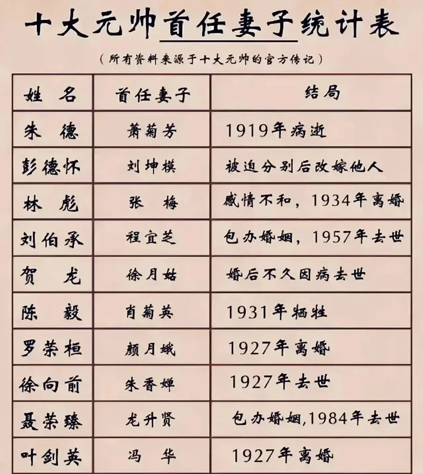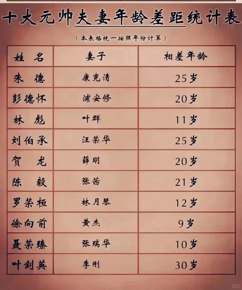 开国元帅首任妻子,有的是包办婚姻,有的离婚,有的成了烈士,都不是最终妻子。 开国元帅和妻子年龄差距: 朱德,康克清,25岁。 彭德怀,浦安修,20岁, 林彪,叶群,11岁。 刘伯承,汪荣华,25岁。历史 贺龙,薛明,20岁。 陈毅,张茜,21岁。 罗荣桓,林月琴,12岁。 徐向前,黄杰,9岁。 聂荣臻,张瑞华,10岁。 叶剑英,李刚,30岁。 康克清政协副主席,职位最高,其他也都是军级以上待遇。