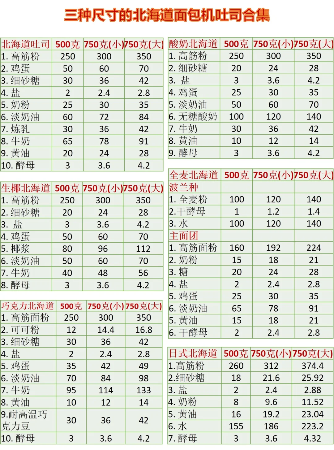 [庆祝R]配方汇总表中罗列了各种大小的面包机的配方,如果要满桶,就要对号入座,不要选错。