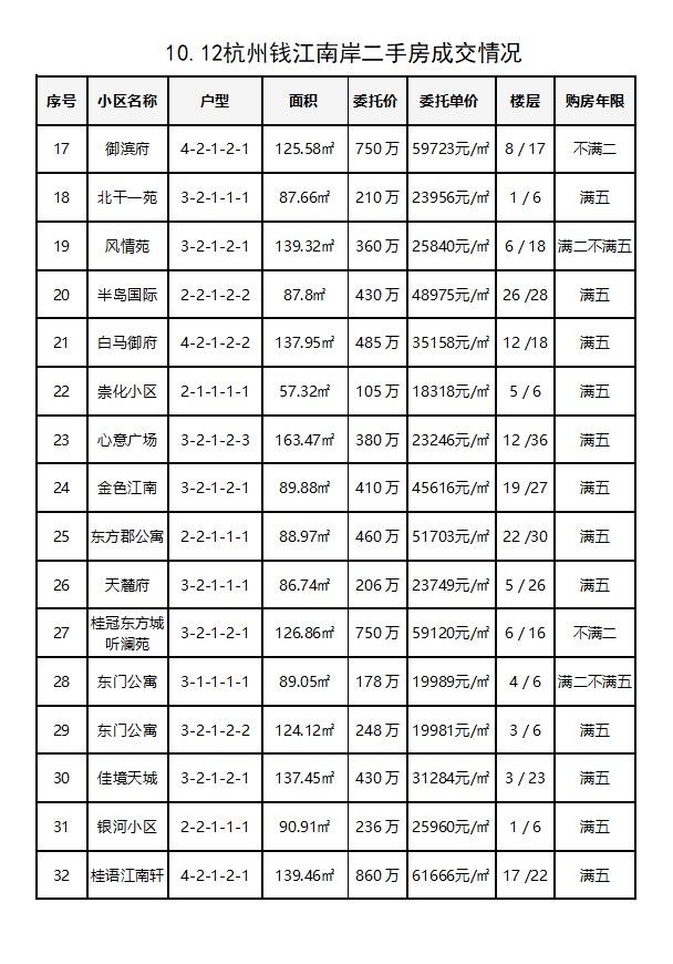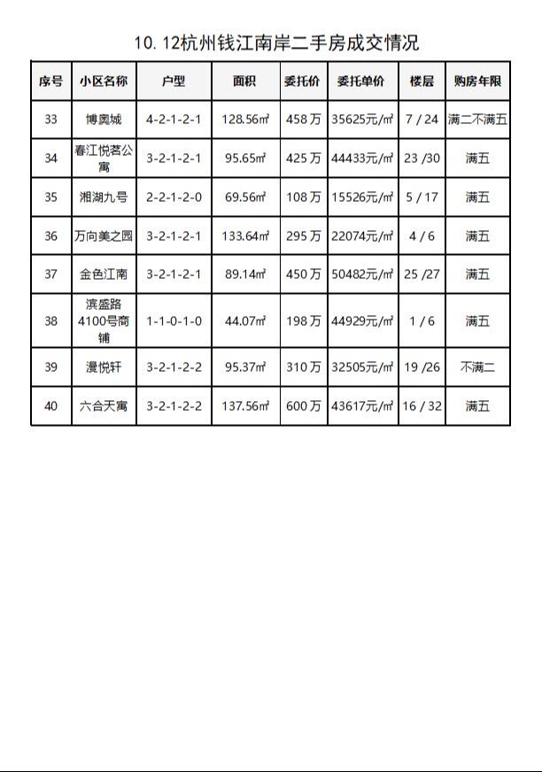 10.12杭州钱江南岸(滨江和萧山)二手房每日成交播报,昨日共成交40套,成交总体相对活跃!杭州楼市 二手房出售 杭州买房 抖音房产